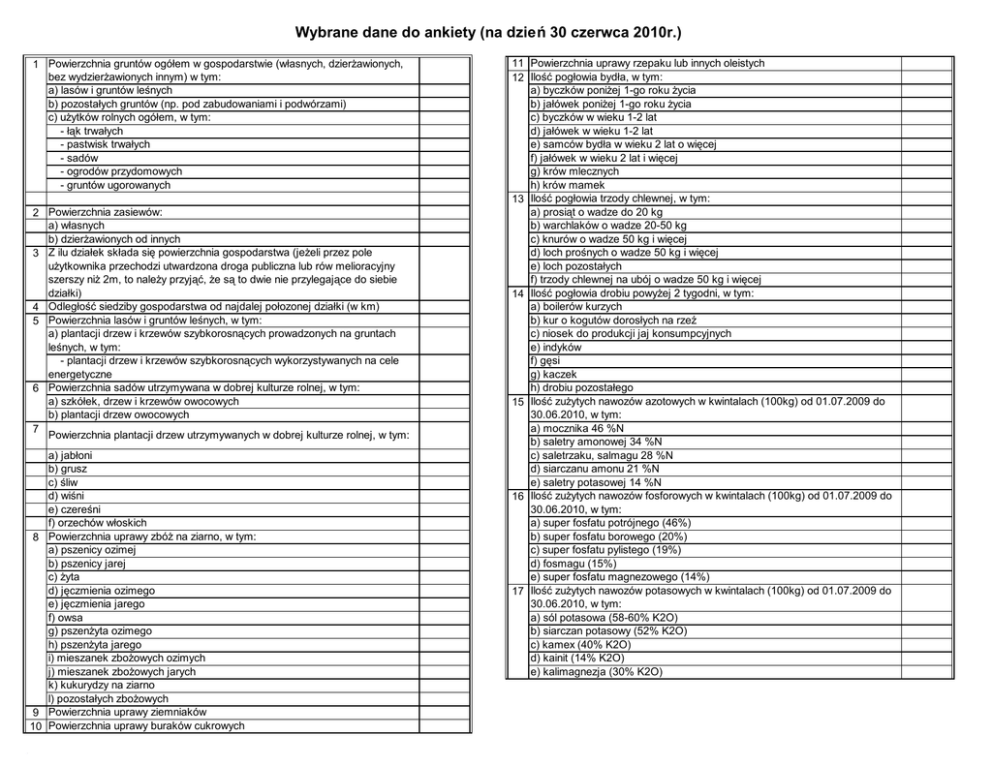 Wybrane dane do ankiety (na dzień 30 czerwca 2010r.) 1 Powierzchnia gruntów ogółem w gospodarstwie (własnych, dzierżawionych, bez wydzierżawionych innym) w tym: a) lasów i gruntów leśnych b) pozostałych gruntów (np. pod zabudowaniami i podwórzami) c) użytków rolnych ogółem, w tym: - łąk trwałych - pastwisk trwałych - sadów - ogrodów przydomowych - gruntów ugorowanych 2 Powierzchnia zasiewów: a) własnych b) dzierżawionych od innych 3 Z ilu działek składa się powierzchnia gospodarstwa (jeżeli przez pole użytkownika przechodzi utwardzona droga publiczna lub rów melioracyjny szerszy niż 2m, to należy przyjąć, że są to dwie nie przylegające do siebie działki) 4 Odległość siedziby gospodarstwa od najdalej połozonej działki (w km) 5 Powierzchnia lasów i gruntów leśnych, w tym: a) plantacji drzew i krzewów szybkorosnących prowadzonych na gruntach leśnych, w tym: - plantacji drzew i krzewów szybkorosnących wykorzystywanych na cele energetyczne 6 Powierzchnia sadów utrzymywana w dobrej kulturze rolnej, w tym: a) szkółek, drzew i krzewów owocowych b) plantacji drzew owocowych 7 Powierzchnia plantacji drzew utrzymywanych w dobrej kulturze rolnej, w tym: a) jabłoni b) grusz c) śliw d) wiśni e) czereśni f) orzechów włoskich 8 Powierzchnia uprawy zbóż na ziarno, w tym: a) pszenicy ozimej b) pszenicy jarej c) żyta d) jęczmienia ozimego e) jęczmienia jarego f) owsa g) pszenżyta ozimego h) pszenżyta jarego i) mieszanek zbożowych ozimych j) mieszanek zbożowych jarych k) kukurydzy na ziarno l) pozostałych zbożowych 9 Powierzchnia uprawy ziemniaków 10 Powierzchnia uprawy buraków cukrowych 11 Powierzchnia uprawy rzepaku lub innych oleistych 12 Ilość pogłowia bydła, w tym: a) byczków poniżej 1-go roku życia b) jałówek poniżej 1-go roku życia c) byczków w wieku 1-2 lat d) jałówek w wieku 1-2 lat e) samców bydła w wieku 2 lat o więcej f) jałówek w wieku 2 lat i więcej g) krów mlecznych h) krów mamek 13 Ilość pogłowia trzody chlewnej, w tym: a) prosiąt o wadze do 20 kg b) warchlaków o wadze 20-50 kg c) knurów o wadze 50 kg i więcej d) loch prośnych o wadze 50 kg i więcej e) loch pozostałych f) trzody chlewnej na ubój o wadze 50 kg i więcej 14 Ilość pogłowia drobiu powyżej 2 tygodni, w tym: a) boilerów kurzych b) kur o kogutów dorosłych na rzeź c) niosek do produkcji jaj konsumpcyjnych e) indyków f) gęsi g) kaczek h) drobiu pozostałego 15 Ilość zużytych nawozów azotowych w kwintalach (100kg) od 01.07.2009 do 30.06.2010, w tym: a) mocznika 46 %N b) saletry amonowej 34 %N c) saletrzaku, salmagu 28 %N d) siarczanu amonu 21 %N e) saletry potasowej 14 %N 16 Ilość zużytych nawozów fosforowych w kwintalach (100kg) od 01.07.2009 do 30.06.2010, w tym: a) super fosfatu potrójnego (46%) b) super fosfatu borowego (20%) c) super fosfatu pylistego (19%) d) fosmagu (15%) e) super fosfatu magnezowego (14%) 17 Ilość zużytych nawozów potasowych w kwintalach (100kg) od 01.07.2009 do 30.06.2010, w tym: a) sól potasowa (58-60% K2O) b) siarczan potasowy (52% K2O) c) kamex (40% K2O) d) kainit (14% K2O) e) kalimagnezja (30% K2O) 18 Ilość zużytych nawozów wieloskładnikowych w kwintalach (100kg) od 01.07.2009 do 30.06.2010, w tym: a) fosforan amonu b) polifoska c) polimag d) agrofoska e) lubofoska f) inne 19 Ilość zużytych nawozów organicznych od 01.07.2009 do 30.06.2010, w tym: a) obornik (w kwintalach) b) gnojówka (w m3) c) gnojowica (w m3) 20 Jaką część (procentową) w łącznych dochodach gospodarstwa domowego z użytkownikiem gospodarstwa rolnego stanowiły dochody z: a) działalności rolniczej prowadzonej w gospodarstwie b) prowadzenia na rachunek własny pozarolniczej działalności gospodarczej c) pracy najemnej, czyli uzyskanie z tytułu zatrudnienia na podstawie stosunku pracy (np.. umowa o pracę) d) dochody z emerytur i rent e) dochody z innych źródeł niezarobkowych poza emeryturą i rentą (np. zasiłki z pomocy społecznej) 21 Jaka część (procentowej) wartości końcowej produkcji rolniczej przeznaczona była na potrzeby gospodarstwa domowego z użytkownikiem gospodarstwa rolnego METODY PRODUKCJI ROLNEJ (dane na okres od 1 lipca 2009r. do 30 czerwca 2010r.) 1 Na jakiej powierzchni gruntów ornych zastosowano: a) orkę pługiem lemieszowym lub talerzowym b) uprawę konserwującą (płytką orkę) c) uprawę bezorkową (siew bezpośredni) 2 Jaka powierzchnia gruntów ornych pokryta była zimą: a) uprawami ozimymi b) uprawami okrywowymi lub poplonami c) pozostałościami roślin d) nie była pokryta roślinnością 3 Jaka część (procentowa) gruntów ornych gospodarstwa rolnego była wyłączona z płodozmianu: 4 Jaka była powierzchnia gruntów w gospodarstwie przeznaczona do wypasu 5 Jaka była liczba zwierząt wypasanych na nienależących do gospodarstwa gruntach wspólnego wypasu Badaniami METOD PRODUKCJI ROLNEJ objęte zostaną tylko wylosowane gospodarstwa.