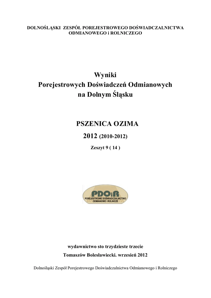 DOLNOŚLĄSKI ZESPÓŁ POREJESTROWEGO DOŚWIADCZALNICTWA ODMIANOWEGO i ROLNICZEGO Wyniki Porejestrowych Doświadczeń Odmianowych na Dolnym Śląsku PSZENICA OZIMA 2012 (2010-2012) Zeszyt 9 ( 14 ) wydawnictwo sto trzydzieste trzecie Tomaszów Bolesławiecki. wrzesień 2012 Dolnośląski Zespół Porejestrowego Doświadczalnictwa Odmianowego i Rolniczego Przewodniczący: mgr inż. Anna Kamińska Dyrektor SDOO Zybiszów Z-ca: prof. dr hab. Jan Kaczmarek Z-ca: prof. dr hab. Henryk Bujak Sekretarz: mgr inż. Ewa Śmiałek Stacja Koordynująca PDOiR na Dolnym Śląsku: Centralny Ośrodek Badania Odmian Roślin Uprawnych Stacja Doświadczalna Oceny Odmian w Zybiszowie 55-080 Kąty Wrocławskie dyrektor: mgr inż. Anna Kamińska www.sdootomaszow.wroclaw.pl www.zybiszow.coboru.pl Tel. 71-334 20 10 Opracowali: Jolanta Kotowicz mgr inż. Ludwik Kotowicz Publikacja chroniona prawem wydawcy; każda reprodukcja całości lub jej części wymaga zgody wydawcy Wydawca: SDOO Tomaszów Bolesławiecki I. WSTĘP W syntezie wykorzystano wyniki 21 doświadczeń z odmianami pszenicy ozimej przeprowadzonych na Dolnym Śląsku w latach 2010 – 2012. Liczba i lokalizacja doświadczeń jest wystarczająca do uzyskania reprezentatywnych wyników. Jesienią 2011 roku założono na Dolnym Śląsku 9 doświadczeń. Przy ocenie wylegania oraz porażenia chorobami zestawiono wyniki jedynie z tych doświadczeń w których dane zjawisko wystąpiło, natomiast średnie dla wysokości roślin i masy 1000 ziaren pochodzą z tych punktów doświadczalnych, w których dokonano pomiaru. W wyniku bardzo ostrej zimy wcześniej zakończono 5 doświadczeń. Obecnie w Krajowym Rejestrze 2012 znajduje się 74 odmian pszenicy ozimej. Spośród tych odmian Zespół Wojewódzki PDO, jesienią ubiegłego roku, wybrał do doświadczeń na Dolnym Śląsku 21 odmian, które w poprzednich latach wypadły stosunkowo najlepiej w naszym województwie. Dodatkowo badano 1 odmianę które najkorzystniej wypadła w doświadczeniach rozpoznawczych z listy europejskiej (CCA). Doświadczenia prowadzono jako dwupowtórzeniowe, na dwóch poziomach agrotechnicznych: a1 – podstawowym a2 – wysokim (zwiększone o 40 kg nawożenie azotowe, zwalczanie chorób grzybowych, stosowanie antywylegacza i dolistne dokarmianie mikronawozami). W opracowaniu, poza ogólnymi charakterystykami wszystkich odmian badanych w doświadczeniach PDO w roku 2012 podano również charakterystykę odmian najnowszych, wpisanych do krajowego rejestru wiosną bieżącego roku. II. ANALIZA WYNIKÓW DOŚWIADCZEŃ W wyniku wymarznięcia większości odmian w pięciu doświadczeniach położonych w północnej i wschodniej części województwa ( Naroczyce, Krościna Mała, Zybiszów, Pawłowice i Jelczu-Laskowicach) silnymi uszkodzeniami mrozowymi znacznej części odmian w doświadczeniach w Tomaszowie Bolesławieckim, Kobierzycach i Kondratowicach (a jedynie doświadczenie w Tarnowie ucierpiało w niewielkim stopniu osłonięte okrywą śnieżną) skoncentrowaliśmy się korzystając z okazji na analizie przezimowania odmian pszenicy ozimej. Szczegółowo ten problem omówiono w publikacji „ Przezimowanie odmian ozimych pszenicy i rzepaku w doświadczeniach PDOiR na Dolnym Śląsku w roku 2012” Zeszyt 3 (14) z czerwca 2012 roku. Ze względu na wagę problemu zamieściliśmy część tego opracowania dotyczącą pszenicy ozimej również w niniejszej syntezie. III. CHARAKTERYSTYKA ODMIAN (Sporządzona na podstawie wieloletnich wyników doświadczeń przeprowadzonych na terenie całego kraju). Kolejność odmian według lat rejestracji. Odmiany jakościowe BOOMER. Odmiana jakościowa (grupa A). Mrozoodporność mała. Odporność na rdzę brunatną – duża, na septoriozę liści i choroby podstawy źdźbła – dość duża, na mączniaka i septoriozę plew – średnia, na fuzariozę kłosów – mała. Rośliny niskie do bardzo niskich, o dość dużej odporności na wyleganie. Termin kłoszenia i dojrzewania średni. Masa 1000 ziaren dość mała, wyrównanie dość słabe, gęstość w stanie zsypnym średnia. Odporność na porastanie w kłosie przeciętna, liczba opadania bardzo duża. Zawartość białka i ilość glutenu średnia. Wskaźnik sedymentacji SDS duży. Wydajność ogólna mąki przeciętna. Plenność bardzo dobra. Przyrost plonu na wysokim poziomie agrotechniki średni. Tolerancja na zakwaszenie gleby dość mała. FIGURA. Odmiana jakościowa (grupa A). Mrozoodporność średnia. Odporność na mączniaka – duża, na brunatną plamistość liści, septoriozę liści i plew oraz fuzariozę kłosów – przeciętna, na rdzę brunatną i choroby podstawy źdźbła – dość mała. Rośliny dość wysokie, o przeciętnej odporności na wyleganie. Termin kłoszenia dość wczesny, dojrzewania średni. Masa 1000 ziaren, wyrównanie i gęstość w stanie zsypnym średnie. Odporność na porastanie w kłosie średnia, liczba opadania dość duża. Zawartość białka i ilość glutenu średnie. Wskaźnik sedymentacji SDS duży. Plenność dobra. MULAN. Odmiana jakościowa (grupa A). Plenność bardzo dobra. Przyrost plonu na wysokim poziomie agrotechniki nieco poniżej średniej. Mrozoodporność mała do średniej. Odporność na rdzę brunatną i septoriozę liści – dość duża, na mączniaka, septoriozę plew i choroby podstawy źdźbła – przeciętna, na brunatną plamistość liści i fuzariozę kłosów – dość mała. Rośliny średniej wysokości, o przeciętnej odporności na wyleganie. Termin kłoszenia i dojrzewania dość wczesny. Masa 1000 ziaren średnia, wyrównanie dobre, gęstość w stanie zsypnym mała. Odporność na porastanie w kłosie i liczba opadania dość duże. Zawartość białka średnia, ilość glutenu dość duża. Wskaźnik sedymentacji SDS dość duży. Wydajność ogólna mąki dość słaba. Tolerancja na zakwaszenie gleby średnia. MUSZELKA. Odmiana jakościowa (grupa A). Plenność dobra. Przyrost plonu na wysokim