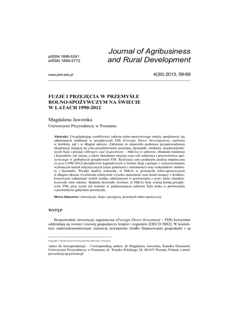 pISSN 1899-5241 eISSN 1899-5772 Journal of Agribusiness and Rural Development www.jard.edu.pl 4(30) 2013, 59-69 FUZJE I PRZEJĘCIA W PRZEMYŚLE ROLNO-SPOŻYWCZYM NA ŚWIECIE W LATACH 1990-2012 Magdalena Jaworska Uniwersytet Przyrodniczy w Poznaniu Abstrakt. Uwzględniając osobliwości sektora rolno-spożywczego należy spodziewać się odmiennych tendencji w przepływach FDI (Foreign Direct Investigation), zarówno w krótkim, jak i w długim okresie. Założenie to stanowiło podstawę przeprowadzonej eksploracji mającej na celu przedstawienie poziomu, dynamiki, struktury międzynarodowych fuzji i przejęć (Mergers and Acquisitions – M&As) w sektorze, zbadanie tendencji i kierunków ich zmian, a także określenie miejsca oraz roli rolnictwa i przetwórstwa spożywczego w globalnych przepływach FDI. Realizacji celu posłużyła analiza empiryczna ex post (1990-2012) przepływów kapitałowych w formie fuzji i przejęć z wykorzystaniem wybranych metod statystycznych (miar położenia i zmienności) oraz wskaźników struktury i dynamiki. Wyniki analizy wskazały, iż M&As w przemyśle rolno-spożywczym w długim okresie wyróżniała relatywnie wysoka zmienność oraz trend rosnący z krótkookresowymi wahaniami wokół trendu, odmiennymi w porównaniu z tymi, które charakteryzowały inne sektory. Badania dowiodły również, iż M&As były ważną formą przepływów FDI, przy czym ich wartość w analizowanym sektorze była niska w porównaniu z pozostałymi gałęziami przemysłu. Słowa kluczowe: inwestycje, fuzje i przejęcia, przemysł rolno-spożywczy WSTĘP Bezpośrednie inwestycje zagraniczne (Foreign Direct Investment – FDI) korzystnie oddziałują na wzrost i rozwój gospodarczy krajów i regionów [OECD 2002]. W kontekście makroekonomicznym stanowią zewnętrzne źródło finansowania gospodarki i są Copyright © Wydawnictwo Uniwersytetu Przyrodniczego w Poznaniu Adres do korespondencji – Corresponding author: dr Magdalena Jaworska, Katedra Ekonomii, Uniwersytet Przyrodniczy w Poznaniu, ul. Wojska Polskiego 28, 60-637 Poznań, Poland, e-mail: [email protected] 60 M. Jaworska głównym akceleratorem zmian. Ze względu na wpływ na rynek pracy są określane jako skuteczne narzędzie zwalczania ubóstwa w krajach rozwijających się. Wśród transferowanych wartości ważną rolę odgrywa translokacja technologii, metod organizacji i zarządzania, która prowadzi do innowacji i modernizacji produkcji krajowej. Dla inwestorów FDI stanowią dodatkową szansę na bardziej racjonalne wykorzystanie aktywów i uzyskanie przewagi nad konkurentami. Możliwości te stwarzają im przede wszystkim odmienne w poszczególnych krajach uwarunkowania związane z klimatem inwestycyjnym oraz różnice w geograficznym rozmieszczeniu i jakości czynników produkcji na świecie. Dywersyfikacja ta ma szczególne znaczenie w przypadku działalności gospodarczej realizowanej z wykorzystaniem zasobów naturalnych. Okoliczności te powodują, iż inwestycje zagraniczne stały się integralną częścią procesu gospodarowania, zarówno w ujęciu mikro-, jak i makroekonomicznym. Rolnictwo i przemysł spożywczy, ze względu na stopień powiązań z gospodarką, siłę reakcji inwestorów oraz percepcję uwarunkowań – wewnętrznych i zewnętrznych – tworzą osobliwy sektor gospodarki. W jego strukturze przedmiotowej przeważają produkty podstawowe, których popyt jest nieelastyczny, co implikuje relatywnie wysoką odporność na wahania koniunktury i pozwala wypracować dodatnie wyniki finansowe, nawet w okresach dekoniunktury gospodarczej. Z drugiej jednak strony, sezonowość produkcji, zależność od czynników przyrodniczych i politycznych, niekorzystne kształtowanie się cen w długim okresie czy relatywnie niska dochodowość inwestycji, to jedne z wielu argumentów, które mogą zniechęcać do podejmowania inwestycji w sektorze rolno-spożywczym, bądź też hamować rozwój istniejących. Dodatkowym utrudnieniem jest fakt, iż artykuły rolne i żywność to produkty strategiczne i mogą stanowić tzw. „broń ekonomiczną”. Realizując ważną funkcję w zaspakajaniu podstawowych potrzeb mają również fundamentalne znaczenie w kontekście bezpieczeństwa żywnościowego. Uwzględniając osobliwości sektora należy zatem spodziewać się odmiennych tendencji w przepływach FDI, zarówno w krótkim, jak i w długim okresie. Założenie to stanowiło podstawę przeprowadzonych analiz mających na celu przedstawienie poziomu, dynamiki, struktury międzynarodowych fuzji i przejęć w przemyśle rolnospożywczym, a na ich podstawie – zbadanie tendencji i kierunków ich zmian, a także określenie miejsca oraz roli rolnictwa i przetwórstwa spożywczego w globalnych przepływach FDI. Ze względów technicznych opracowanie charakteryzuje się wysokim stopniem ogólności i może służyć jako baza wyjściowa do dalszych, bardziej szczegółowych analiz. MATERIAŁ I METODYKA BADAŃ Realizacji celu posłużyła analiza empiryczna ex post (1990-2012) przepływów kapitałowych w formie fuzji i przejęć z wykorzystaniem wybranych metod statystycznych. Zastosowano miary położenia (średnia arytmetyczna), miary zmienności (odchylenie standardowe, współczynnik zmienności) oraz wskaźniki struktury i dynamiki. W opracowaniu przemysł rolno-spożywczy odpowiada przyjętej przez UNCTAD Międzynarodowej Standardowej Klasyfikacji Rodzajów Działalności (International Standard Industrial Classification of All Economic Activities – ISIC Rev. 4) i odnosi się Journal of Agribusiness and Rural Development Fuzje i przejęcia w przemyśle rolno-spożywczym na świecie w latach 1990-2012 61 do tych przedsiębiorstw, których przedmiot działalności dotyczy: rolnictwa, leśnictwa, łowiectwa i rybołówstwo oraz artykułów spożywczych, napojów i wyrobów tytoniowych. Źródło danych stanowiły internetowe bazy danych i raporty Konferencji Narodów Zjednoczonych ds. Handlu i 