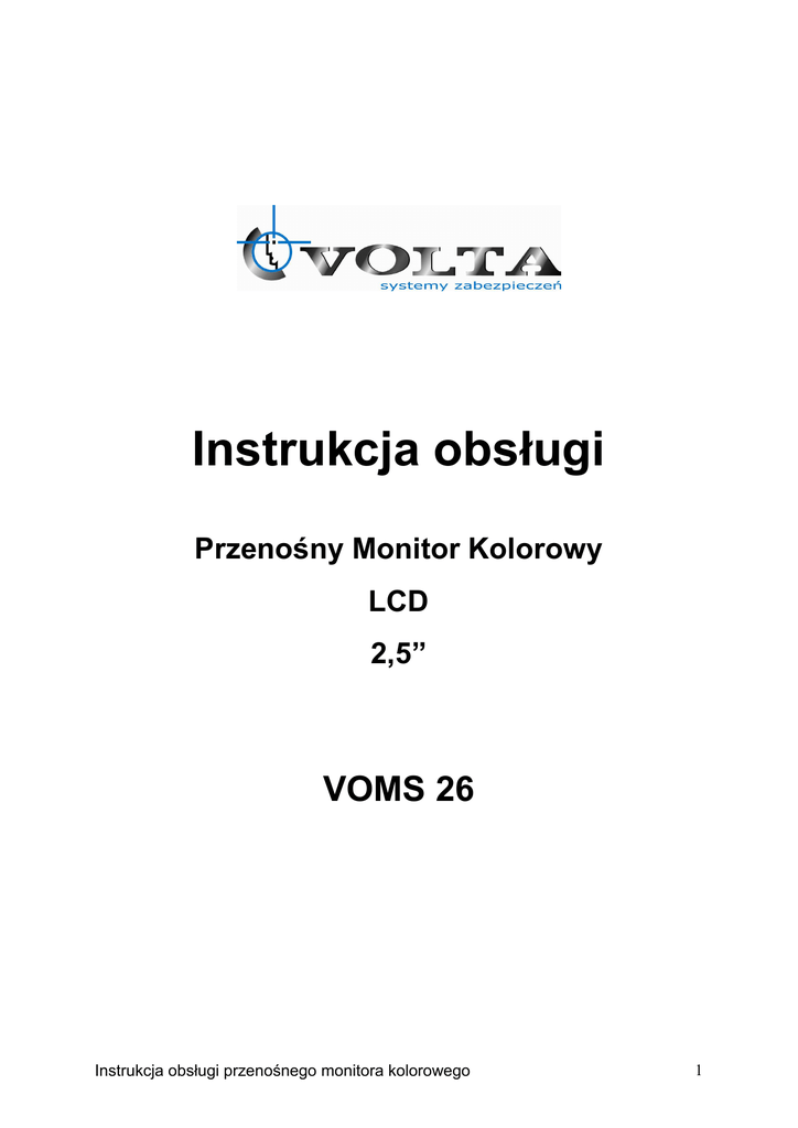 Instrukcja obsługi Przenośny Monitor Kolorowy LCD 2,5” VOMS 26 Instrukcja obsługi przenośnego monitora kolorowego 1 Dystrybucja: Volta Sp. z o.o., ul. Jutrzenki 94, 02-230 Warszawa tel. (22) 572 90 20, fax. (22) 572 90 30, www.volta.com.pl, [email protected] UWAGA!!! Wysokie napięcie!!! RYZYKO PORAśENIA PRĄDEM ELEKTRYCZNYM 230V NIE OTWIERAĆ !!! UWAGA: ABY ZREDUKOWAĆ RYZYKO PORAśENIA PRĄDEM ELEKTRYCZNYM NIE OTWIERAJ OBUDOWY URZĄDZENIA. W RAZIE NIEPRAWIDŁOWEGO DZIAŁANIA ODDAJ URZĄDZENIE DO AUTORYZOWANEGO SERWISU Błyskawica z symbolem strzałki wewnątrz trójkąta równobocznego ostrzega uŜytkownika urządzenia, Ŝe wewnątrz obudowy występują niebezpieczne napięcia, które przy niewłaściwym uŜytkowaniu mogą stworzyć niebezpieczeństwo poraŜenia prądem elektrycznym. Wykrzyknik wewnątrz trójkąta równobocznego ma na celu zwrócenie uwagi uŜytkownika na waŜne czynności związane z obsługą i konserwacją sprzętu. UWAGA! Nie naleŜy eksponować monitorów na deszcz lub inne źródła wilgoci, gdyŜ moŜe to spowodować poŜar lub poraŜenia elektryczne Proszę nie zdejmować tylnej obudowy monitora. MoŜe być to przyczyną poŜaru lub poraŜenia prądem. Instrukcja obsługi przenośnego monitora kolorowego 2 WSTĘP 1. Instrukcja ta zawiera informacje dotyczące instalacji i uŜytkowania kolorowego monitora. 2. Nasze monitory powinny być instalowane i uŜywane przy uŜyciu odpowiednich materiałów i okablowania. SPIS TREŚCI Opis……………………................................................................................................4 Główne parametry……................................................................................................5 Podstawowe funkcje…................................................................................................6 Ochrona środowiska wymiana baterii…………………………………………………..6 Instrukcja obsługi przenośnego monitora kolorowego 3 Monitor serwisowy VOMS26-intsrukcja obsługi Przed uŜyciem monitora proszę przeczytać dokładnie poniŜszą instrukcję. 1) Nie wolno uŜywać monitora w środowisku w którym panuje wysoka temperatura i duŜa wilgotność. Szczególnie nie zaleca się stosowania w łaźniach, saunach etc. Dopuszczalna temperatura pracy to -20℃-60℃. 2) Przetrzymywać z dala od wody i innych ciekłych substancji. W przypadku zawilgocenia moŜe dojść do poraŜenia a w skrajnych przypadkach do poŜaru. Do ładowania akumulatorów naleŜy stosować ładowarkę dostarczoną przez producenta. Za stosowanie zamienników producent nie ponosi odpowiedzialności. 3) Nie pozostawiać urządzenie w nasłonecznionych miejscach. 4) Nie pozostawiać urządzenia w zasięgu dzieci. 5) Nie ładować akumulatora uszkodzoną ładowarką. 6) Nie ładować akumulatora dłuŜej niŜ czas podany przez producenta. 7) W przypadku uŜycia pierwszy raz baterii lub uŜycia baterii po kilku miesięcznej przerwie naleŜy naładować baterię do “pełna”. 8)Po całkowitym naładowniu baterii naleŜy stosować monitor aŜ do momentu rozładowania się. Nie naleŜy doładowywać baterii po krótkim uŜyciu monitora. 9) Przeładowanie i całkowite rozładowanie skracają Ŝywotność baterii. 10)Kiedy czas pracy baterii jest zdecydowanie krótszy niŜ nowej, naleŜy wymienić baterię. 11) Czas pracy na baterii moŜe się wraz z uŜyciem skracać. Jest to normalny proces. . 12) NaleŜy zachować ostroŜność podłączając wtyk DC zasilacza do monitora. 13) Nie przeprowadzaj samodzielnych napraw urządzenia. JeŜeli masz jakieś pytania skontaktuj się ze sprzedawcą lub dystrybutorem.. 1、 、Opis Jest to 2.5” monitor LCD, obsługujący obydwa standard PAL/NTSC . Dedykowany jako monitor serwisowy do systemów CCTV. 2、 、Główne parametry Model: VOMS26 Instrukcja obsługi przenośnego monitora kolorowego 4 Obsługiwane systemy PAL/NTSC Rozdzielczość: 480*234 Kąt widzenia: ( góra/dół/lewo/prawo): (10/30/40/40) Jasność: 200cd/㎡ Wejście wideo: 1.0Vp-p 75ohm Zasilanie: DC 5V Pobór mocy:1.2W Bateria:3.7V 1000mA(kompatybilna z Nokia N73) Temperatura pracy:0-60℃ Temperatura magazynowania: -30~60℃ Wilgotność względna: 5-95%RH Wymiary zewnętrzne: D 85*W 64*G 21mm Waga (bez ładowarki):90g 3、 、Podstawowe funkcje N Opis 1 JASNOŚĆ 2 KOLOR 3 ZASILANIE-ON/OFF 4 WEJŚCIE AV 5 DC 5V 6 WSKAŹNIK LED 7 WEJŚCIE DO PODŁĄCZENIA BATERII o. 4、 、Akcesoria Instrukcja 1szt; ładowarka Bateria 1szt ; kabel AVe 1szt. 1szt. Instrukcja obsługi przenośnego monitora kolorowego 5 Uchwyt 1szt ; Kable podłączeniowe 1szt 5. Ochrona środowiska (wymiana baterii) Wyłączyć monitor wysunąć klapkęwyjąć zuŜytą baterięwłoŜyć nową baterięzamknąć klapkę ZuŜytą baterię naleŜy zwrócić do sprzedawcy , dystrybutora lub punktu zbioru zuŜytych ogniw bateryjnych Instrukcja obsługi przenośnego monitora kolorowego 6