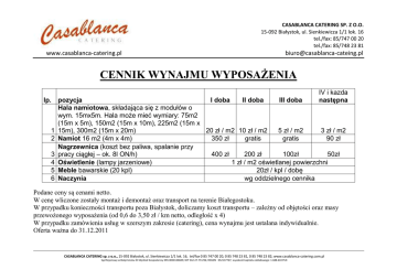 CASABLANCA CATERING SP. Z O.O. 15-092 Białystok, ul. Sienkiewicza 1/1 lok. 16 tel./fax: 85/747 00 20 tel./fax: 85/748 23 81 www.casablanca-catering.pl [email protected] CENNIK WYNAJMU WYPOSAŻENIA lp. 1 2 3 4 5 6 IV i kazda następna pozycja I doba II doba III doba Hala namiotowa, składająca się z modułów o wym. 15mx5m. Hala może mieć wymiary: 75m2 (15m x 5m), 150m2 (15m x 10m), 225m2 (15m x 15m), 300m2 (15m x 20m) 20 zł / m2 10 zł / m2 5 zł / m2 3 zł / m2 Namiot 16 m2 (4m x 4m) 350 zł gratis gratis 90 zł Nagrzewnica (koszt bez paliwa, spalanie przy pracy ciągłej – ok. 8l ON/h) 400 zł 200 zł 100zł 50zł Oświetlenie (lampy jarzeniowe) 1 zł / m2 oświetlanej powierzchni Meble bawarskie (20 kpl) 20zł / kpl / dobę Naczynia wg oddzielnego cennika Podane ceny są cenami netto. W cenę wliczone zostały montaż i demontaż oraz transport na terenie Białegostoku. W przypadku konieczności transportu poza Białystok, doliczamy koszt transportu – zależny od objętości oraz masy przewożonego wyposażenia (od 0,6 do 3,50 zł / km netto, odległość x 4) W przypadku zamówienia usług w szerszym zakresie (catering), cena wynajmu jest ustalana indywidualnie. Oferta ważna do 31.12.2011 CASABLANCA CATERING sp. z o.o., 15-092 Białystok, ul. Sienkiewicza 1/1 lok. 16, tel/fax 0 85 747 00 20, 0 85 748 23 81, 0 85 748 23 82; www.casablanca-catering.com.pl Sąd Rejonowy w Białymstoku XII Wydział Gospodarczy KRS 0000138609; NIP 542-27-79-296; REGON 052137767; wysokość kapitału zakładowego: 1.688.610 PLN