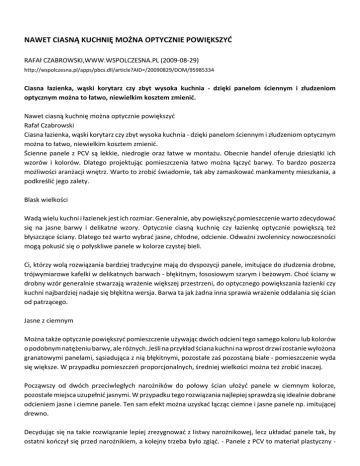 NAWET CIASNĄ KUCHNIĘ MOŻNA OPTYCZNIE POWIĘKSZYĆ RAFAł CZABROWSKI,WWW.WSPOLCZESNA.PL (2009-08-29) http://wspolczesna.pl/apps/pbcs.dll/article?AID=/20090829/DOM/95985334 Ciasna łazienka, wąski korytarz czy zbyt wysoka kuchnia - dzięki panelom ściennym i złudzeniom optycznym można to łatwo, niewielkim kosztem zmienić. Nawet ciasną kuchnię można optycznie powiększyć Rafał Czabrowski Ciasna łazienka, wąski korytarz czy zbyt wysoka kuchnia - dzięki panelom ściennym i złudzeniom optycznym można to łatwo, niewielkim kosztem zmienić. Ścienne panele z PCV są lekkie, niedrogie oraz łatwe w montażu. Obecnie handel oferuje dziesiątki ich wzorów i kolorów. Dlatego projektując pomieszczenia łatwo można łączyć barwy. To bardzo poszerza możliwości aranżacji wnętrz. Warto to zrobić świadomie, tak aby zamaskować mankamenty mieszkania, a podkreślić jego zalety. Blask wielkości Wadą wielu kuchni i łazienek jest ich rozmiar. Generalnie, aby powiększyć pomieszczenie warto zdecydować się na jasne barwy i delikatne wzory. Optycznie ciasną kuchnię czy łazienkę optycznie powiększą też błyszczące ściany. Dlatego też warto wybrać jasne, chłodne, odcienie. Odważni zwolennicy nowoczesności mogą pokusić się o połyskliwe panele w kolorze czystej bieli. Ci, którzy wolą rozwiązania bardziej tradycyjne mają do dyspozycji panele, imitujące do złudzenia drobne, trójwymiarowe kafelki w delikatnych barwach - błękitnym, łososiowym szarym i beżowym. Choć ściany w drobny wzór generalnie stwarzają wrażenie większej przestrzeni, do optycznego powiększania łazienki czy kuchni najbardziej nadaje się błękitna wersja. Barwa ta jak żadna inna sprawia wrażenie oddalania się ścian od patrzącego. Jasne z ciemnym Można także optycznie powiększyć pomieszczenie używając dwóch odcieni tego samego koloru lub kolorów o podobnym natężeniu barwy, ale różnych. Jeśli na przykład ściana kuchni na wprost drzwi zostanie wyłożona granatowymi panelami, sąsiadująca z nią błękitnymi, pozostałe zaś pozostaną białe - pomieszczenie wyda się większe. W przypadku pomieszczeń proporcjonalnych, średniej wielkości można też zrobić inaczej. Począwszy od dwóch przeciwległych narożników do połowy ścian ułożyć panele w ciemnym kolorze, pozostałe miejsca uzupełnić jasnymi. W przypadku tego rozwiązania najlepiej sprawdzą się idealnie dobrane odcieniem jasne i ciemne panele. Ten sam efekt można uzyskać łącząc ciemne i jasne panele np. imitującej drewno. Decydując się na takie rozwiązanie lepiej zrezygnować z listwy narożnikowej, lecz układać panele tak, by ostatni kończył się przed narożnikiem, a kolejny trzeba było zgiąć. - Panele z PCV to materiał plastyczny - mówi Błażej Korzeniewski z firmy Plastivan: - aby tak wykończyć narożniki wystarczy w tylnej ścianie panelu wyciąć pasek na całej jego długości. Jednak za skuteczność takiego rozwiązania mogę ręczyć tylko w przypadku naszych produktów. Te gorszej jakości, zawierające dużo kredy czy innych wypełniaczy mogą się kruszyć. Listwa na proporcje Inne problemy mają posiadacze pomieszczeń zbyt niskich lub zbyt wysokich. Niskie pokoje czy korytarze można podwyższyć stosując panele boazeryjne, których faktura przypominająca deski sprawi, że na ścianie pojawią się subtelne pionowe linie. Drugim wyjściem zastosowanie na łączeniu paneli specjalnie do tego przeznaczonych dekoracyjnych listew. Jeśli pomieszczenie jest zbyt wysokie można ułożyć panele na kształt lamperii, dolną i górną część oddzielając dekoracyjną listwą. Efekt będzie jeszcze lepszy, gdy górna część ścian będzie ciemniejsza niż dół. To rozwiązanie nadaje się jednak do zastosowania tylko tam, gdzie można sobie pozwolić na optyczną stratę metrażu. Źródło: Igraszki z perspektywą - www.gp24.pl