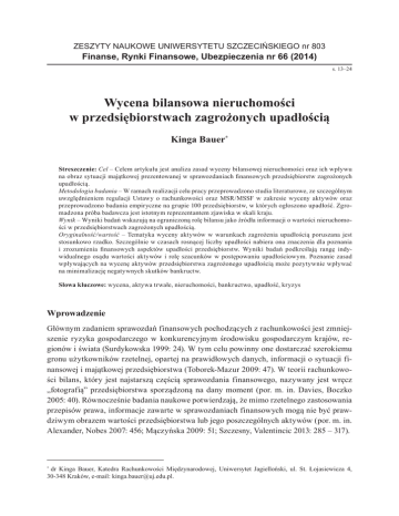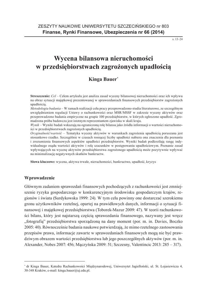 ZESZYTY NAUKOWE UNIWERSYTETU SZCZECIŃSKIEGO nr 803 Finanse, Rynki Finansowe, Ubezpieczenia nr 66 (2014) s. 13–24 Wycena bilansowa nieruchomości w przedsiębiorstwach zagrożonych upadłością Kinga Bauer* Streszczenie: Cel – Celem artykułu jest analiza zasad wyceny bilansowej nieruchomości oraz ich wpływu na obraz sytuacji majątkowej prezentowanej w sprawozdaniach finansowych przedsiębiorstw zagrożonych upadłością. Metodologia badania – W ramach realizacji celu pracy przeprowadzono studia literaturowe, ze szczególnym uwzględnieniem regulacji Ustawy o rachunkowości oraz MSR/MSSF w zakresie wyceny aktywów oraz przeprowadzono badania empiryczne na grupie 100 przedsiębiorstw, w których ogłoszono upadłość. Zgromadzona próba badawcza jest istotnym reprezentantem zjawiska w skali kraju. Wynik – Wyniki badań wskazują na ograniczoną rolę bilansu jako źródła informacji o wartości nieruchomości w przedsiębiorstwach zagrożonych upadłością. Oryginalność/wartość – Tematyka wyceny aktywów w warunkach zagrożenia upadłością poruszana jest stosunkowo rzadko. Szczególnie w czasach rosnącej liczby upadłości nabiera ona znaczenia dla poznania i zrozumienia finansowych aspektów upadłości przedsiębiorstw. Wyniki badań podkreślają rangę indywidualnego osądu wartości aktywów i rolę szacunków w postępowaniu upadłościowym. Poznanie zasad wpływających na wycenę aktywów przedsiębiorstwa zagrożonego upadłością może pozytywnie wpływać na minimalizację negatywnych skutków bankructw. Słowa kluczowe: wycena, aktywa trwałe, nieruchomości, bankructwo, upadłość, kryzys Wprowadzenie Głównym zadaniem sprawozdań finansowych pochodzących z rachunkowości jest zmniejszenie ryzyka gospodarczego w konkurencyjnym środowisku gospodarczym krajów, regionów i świata (Surdykowska 1999: 24). W tym celu powinny one dostarczać szerokiemu gronu użytkowników rzetelnej, opartej na prawidłowych danych, informacji o sytuacji finansowej i majątkowej przedsiębiorstwa (Toborek-Mazur 2009: 47). W teorii rachunkowości bilans, który jest najstarszą częścią sprawozdania finansowego, nazywany jest wręcz „fotografią” przedsiębiorstwa sporządzoną na dany moment (por. m. in. Davies, Boczko 2005: 40). Równocześnie badania naukowe potwierdzają, że mimo rzetelnego zastosowania przepisów prawa, informacje zawarte w sprawozdaniach finansowych mogą nie być prawdziwym obrazem wartości przedsiębiorstwa lub jego poszczególnych aktywów (por. m. in. Alexander, Nobes 2007: 456; Mączyńska 2009: 51; Szczesny, Valentincic 2013: 285 – 317). dr Kinga Bauer, Katedra Rachunkowości Międzynarodowej, Uniwersytet Jagielloński, ul. St. Łojasiewicza 4, 30-348 Kraków, e-mail: [email protected]. * 14 Kinga Bauer Jednym ze szczególnie trudnych zadań stawianych rachunkowości, jest wycena aktywów przedsiębiorstwa. Każdy składnik aktywów może być wyceniany, jednak z wyceną wiąże się niepewność (Damodaran 2012: 1). Zwłaszcza po ostatnim kryzysie finansowym, staje się ona coraz bardziej złożonym zadaniem. Niemniej jednak jest ona kluczowym zagadnieniem każdej decyzji inwestycyjnej, niezależnie od tego czy dotyczy sprzedaży, zakupu, czy utrzymania danego aktywu. Jest również nierozerwalnie związana z decyzjami podejmowanymi w warunkach zagrożenia utraty zdolności do kontynuacji działania. W warunkach zagrożenia kontynuacji działania, szczególnego znaczenia nabierają aktywa „uchwytne”, które mają wartość zbywczą lub które – w przypadku zawarcia układu z wierzycielami – będą miały wartość użytkową (Bauer 2013a: 603). Do grupy tych aktywów zaliczają się nieruchomości. Pojęcie wartości nieruchomości ma wiele znaczeń. Może np. oznaczać cenę, za którą zostanie sprzedana, wartość czynszu uzyskanego z jej wynajmu lub koszt poniesionej budowy. Wycena nieruchomości oznacza czynności prowadzone według określonych metod, procedur, modeli, analiz i opinii, służących oszacowaniu wartości nieruchomości gruntowej lub obiektowej (Niemczyk 2009: 134, 201). Istnieje wiele przyczyn, dla których sporządzane są wyceny nieruchomości, jak również istnieje wiele różnych metod ich dokonywania (Pagourtzi i in.: 2003). W rachunkowości wciąż dominujące jest podejście szacowania wartości nieruchomości na podstawie poniesionych nakładów. Wycena w koszcie historycznym nie uwzględnia jednak warunków rynkowych oraz niepowtarzalnego charakteru nieruchomości, które mogą mieć wpływ na ich wartość jako dóbr ekonomicznych. Problem ten może nabierać szczególnego znaczenia w przypadku zagrożenia kontynuacji działania, gdy jednym z głównych zagadnień jest oszacowanie wartości majątku, jako podstawy do określenia możliwości wszczęcia postępowania upadłościowego oraz zaspokojenia roszczeń wierzycieli. Celem artykułu jest analiza zasad wyceny bilansowej nieruchomości oraz ich wpływu na obraz sytuacji majątkowej prezentowanej w sprawozdaniach finansowych przedsiębiorstw zagrożonych upadłością. Artykuł i badania koncentrują się na nieruchomościach zaliczanych do aktywów trwałych, których proces budowy został zakończony. Podejście takie wynika z przekonania autorki, iż ich specyficzne cechy mogą mieć wpływ na różnice pomiędzy bilansową a szacunkową wartością możliwą do uzyskania ze sprzedaży. Na metodę badawczą składały się: –– studia literaturowe, ze szczególnym uwzględnieniem prawnych postaw wyceny nieruchomości w przedsiębiorstwach zagrożonych upadłością, –– przeprowadzone badania empiryczne, obejmujące dokumentację dotyczącą bilansowej i szacunkowej wyceny nieruchomości 100 przedsiębiorstw, w których sąd ogłosił upadłość w 2011 roku; próba stanowi 14% populacji i jest istotnym reprezentantem zjawiska w skali kraju. Wycena bilansowa nieruchomości w przedsiębiorstwach zagrożonych upadłością 15 1. 