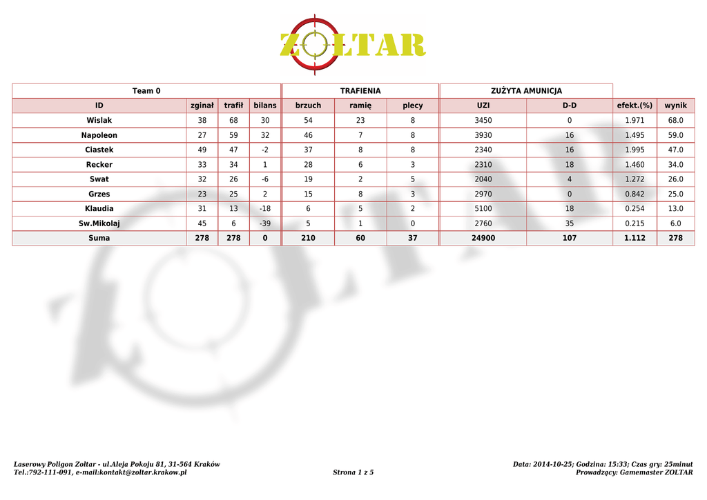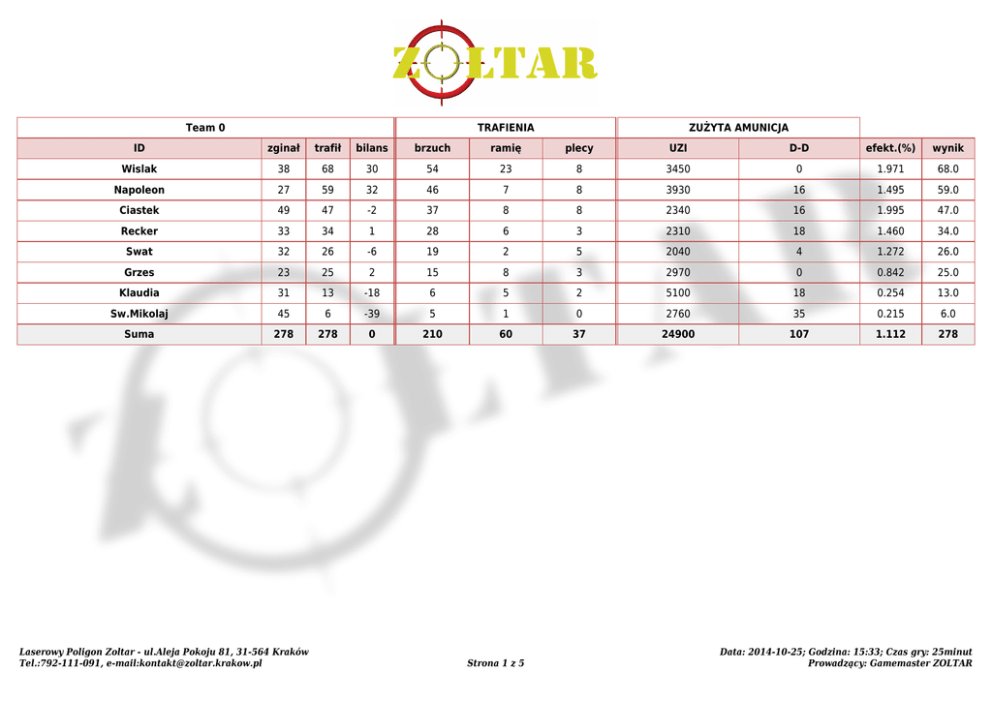 Team 0 TRAFIENIA ZUŻYTA AMUNICJA ID zginał trafił bilans brzuch ramię plecy UZI D-D efekt.(%) wynik Wislak 38 68 30 54 23 8 3450 0 1.971 68.0 Napoleon 27 59 32 46 7 8 3930 16 1.495 59.0 Ciastek 49 47 -2 37 8 8 2340 16 1.995 47.0 Recker 33 34 1 28 6 3 2310 18 1.460 34.0 Swat 32 26 -6 19 2 5 2040 4 1.272 26.0 Grzes 23 25 2 15 8 3 2970 0 0.842 25.0 Klaudia 31 13 -18 6 5 2 5100 18 0.254 13.0 Sw.Mikolaj 45 6 -39 5 1 0 2760 35 0.215 6.0 Suma 278 278 0 210 60 37 24900 107 1.112 278 Laserowy Poligon Zoltar - ul.Aleja Pokoju 81, 31-564 Kraków Tel.:792-111-091, e-mail:[email protected] Strona 1 z 5 Data: 2014-10-25; Godzina: 15:33; Czas gry: 25minut Prowadzący: Gamemaster ZOLTAR Team 1 TRAFIENIA ZUŻYTA AMUNICJA ID zginał trafił bilans brzuch ramię plecy UZI D-D efekt.(%) wynik Ciastek 26 44 18 29 12 11 1920 7 2.283 44.0 Napoleon 8 37 29 27 9 3 5580 23 0.660 37.0 Klaudia 10 18 18 10 4 5 1290 34 1.360 18.0 Grzes 10 2 -8 1 1 0 2520 0 0.079 2.0 Suma 54 101 57 67 26 19 11310 64 0.888 101 Team 2 TRAFIENIA ZUŻYTA AMUNICJA ID zginał trafił bilans brzuch ramię plecy UZI D-D efekt.(%) wynik Wislak 35 21 -14 18 4 3 2520 0 0.833 21.0 Recker 13 12 -1 10 1 1 3960 0 0.303 12.0 Swat 11 6 -5 5 0 1 2820 0 0.213 6.0 Sw.Mikolaj 42 5 -37 5 0 0 1560 81 0.305 5.0 Suma 101 44 -57 38 5 5 10860 81 0.402 44 Laserowy Poligon Zoltar - ul.Aleja Pokoju 81, 31-564 Kraków Tel.:792-111-091, e-mail:[email protected] Team 1 Team 2 101 44 Strona 2 z 5 Data: 2014-10-25; Godzina: 16:14; Czas gry: 20minut Prowadzący: Gamemaster ZOLTAR Drużyny Miejsce Laserowy Poligon Zoltar - ul.Aleja Pokoju 81, 31-564 Kraków Tel.:792-111-091, e-mail:[email protected] Rozgrywki Nazwa 1 2 Suma Team 1 - 101 101 Team 2 - 44 44 Strona 3 z 5 Data: 2014-10-25 Prowadzący: Gamemaster ZOLTAR Zestawienie wg wyniku Miejsce TRAFIENIA ZUŻYTA AMUNICJA ID zginał trafił bilans brzuch ramię plecy UZI D-D efekt.(%) wynik Napoleon 44.40 126.30 81.90 95.70 21.90 14.10 13086.00 53.70 0.961 126.30 Ciastek 97.80 122.40 24.60 87.90 27.60 26.10 5688.00 29.70 2.141 122.40 Wislak 98.10 113.10 15.00 91.80 33.60 14.10 7920.00 0.00 1.428 113.10 4 Recker 59.10 58.80 -0.30 48.60 8.70 5.10 8712.00 21.60 0.673 58.80 5 Klaudia 52.20 42.60 -9.60 22.20 12.00 9.90 8055.00 72.60 0.524 42.60 6 Swat 54.90 40.20 -14.70 30.30 2.40 7.50 6678.00 4.80 0.602 40.20 7 Grzes 42.60 33.00 -9.60 19.50 11.10 3.60 7344.00 0.00 0.449 33.00 8 Sw.Mikolaj 117.00 14.70 -102.30 13.50 1.20 0.00 5652.00 163.50 0.253 14.70 Zestawienie wg bilansu Miejsce TRAFIENIA ZUŻYTA AMUNICJA ID zginał trafił bilans brzuch ramię plecy UZI D-D efekt.(%) wynik Napoleon 44.40 126.30 81.90 95.70 21.90 14.10 13086.00 53.70 0.961 126.30 Ciastek 97.80 122.40 24.60 87.90 27.60 26.10 5688.00 29.70 2.141 122.40 Wislak 98.10 113.10 15.00 91.80 33.60 14.10 7920.00 0.00 1.428 113.10 Recker 59.10 58.80 -0.30 48.60 8.70 5.10 8712.00 21.60 0.673 58.80 Grzes 42.60 33.00 19.50 11.10 3.60 7344.00 0.00 0.449 33.00 Klaudia 52.20 42.60 22.20 12.00 9.90 8055.00 72.60 0.524 42.60 6 Swat 54.90 40.20 -14.70 30.30 2.40 7.50 6678.00 4.80 0.602 40.20 7 Sw.Mikolaj 117.00 14.70 -102.30 13.50 1.20 0.00 5652.00 163.50 0.253 14.70 4 5 Laserowy Poligon Zoltar - ul.Aleja Pokoju 81, 31-564 Kraków Tel.:792-111-091, e-mail:[email protected] -9.60 Strona 4 z 5 Data: 2014-10-25 Prowadzący: Gamemaster ZOLTAR Zestawienie wg efektywności Miejsce TRAFIENIA ZUŻYTA AMUNICJA ID zginał trafił bilans brzuch ramię plecy UZI D-D efekt.(%) wynik Ciastek 97.80 122.40 24.60 87.90 27.60 26.10 5688.00 29.70 2.141 122.40 Wislak 98.10 113.10 15.00 91.80 33.60 14.10 7920.00 0.00 1.428 113.10 Napoleon 44.40 126.30 81.90 95.70 21.90 14.10 13086.00 53.70 0.961 126.30 4 Recker 59.10 58.80 -0.30 48.60 8.70 5.10 8712.00 21.60 0.673 58.80 5 Swat 54.90 40.20 -14.70 30.30 2.40 7.50 6678.00 4.80 0.602 40.20 6 Klaudia 52.20 42.60 -9.60 22.20 12.00 9.90 8055.00 72.60 0.524 42.60 7 Grzes 42.60 33.00 -9.60 19.50 11.10 3.60 7344.00 0.00 0.449 33.00 8 Sw.Mikolaj 117.00 14.70 -102.30 13.50 1.20 0.00 5652.00 163.50 0.253 14.70 Laserowy Poligon Zoltar - ul.Aleja Pokoju 81, 31-564 Kraków Tel.:792-111-091, e-mail:[email protected] Strona 5 z 5 Data: 2014-10-25 Prowadzący: Gamemaster ZOLTAR