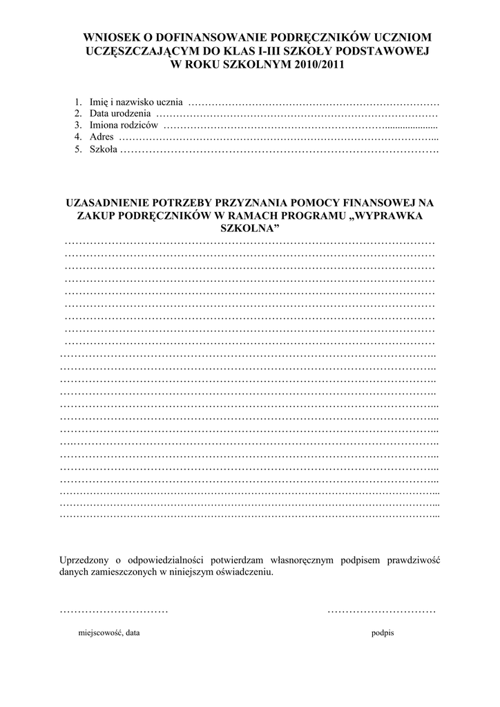WNIOSEK O DOFINANSOWANIE PODRĘCZNIKÓW UCZNIOM UCZĘSZCZAJĄCYM DO KLAS I-III SZKOŁY PODSTAWOWEJ W ROKU SZKOLNYM 2010/2011 1. 2. 3. 4. 5. Imię i nazwisko ucznia ………………………………………………………………… Data urodzenia ………………………………………………………………………… Imiona rodziców …………………………………………………………..................... Adres …………………………………………………………………………………... Szkoła ……………………………………………………………………………. UZASADNIENIE POTRZEBY PRZYZNANIA POMOCY FINANSOWEJ NA ZAKUP PODRĘCZNIKÓW W RAMACH PROGRAMU „WYPRAWKA SZKOLNA” ………………………………………………………………………………………… ………………………………………………………………………………………… ………………………………………………………………………………………… ………………………………………………………………………………………… ………………………………………………………………………………………… ………………………………………………………………………………………… ………………………………………………………………………………………… ………………………………………………………………………………………… ………………………………………………………………………………………… ………………………………………………………………………………………….. ………………………………………………………………………………………….. ………………………………………………………………………………………….. ………………………………………………………………………………………….. …………………………………………………………………………………………... …………………………………………………………………………………………... …………………………………………………………………………………………... ….……………………………………………………………………………………….. …………………………………………………………………………………………... …………………………………………………………………………………………... …………………………………………………………………………………………... …………………………………………………………………………………………………... …………………………………………………………………………………………………... …………………………………………………………………………………………………... Uprzedzony o odpowiedzialności potwierdzam własnoręcznym podpisem prawdziwość danych zamieszczonych w niniejszym oświadczeniu. ………………………… miejscowość, data ………………………… podpis Zasady udzielania pomocy 1. Przyznanie pomocy w formie podręcznika uczniom kl. I-III szkoły podstawowej następuje na wniosek rodziców ucznia (prawnych opiekunów), rodziców zastępczych, a takŜe nauczyciela, pracownika socjalnego lub innej osoby, za zgodą przedstawiciela ustawowego lub rodziców zastępczych. 2. W przypadkach określonych w art. 7 ustawy z dnia 12 marca 2004r. o pomocy społecznej ( ubóstwo, sieroctwo, bezdomność, bezrobocie, niepełnosprawność, długotrwała i cięŜka choroba, przemoc w rodzinie, wielodzietność, bezradność w sprawach opiekuńczo-wychowawczych, alkoholizm, narkomania, zdarzenie losowe, klęska Ŝywiołowa lub ekologiczna), pomoc moŜe być udzielana uczniom pochodzącym z rodzin, w których dochód na osobę w rodzinie przekracza kryterium dochodowe, tj. 351 złotych. 3. Wniosek, o którym mowa w ust. 1, składany jest do dyrektora szkoły , do której uczeń będzie uczęszczał w roku szkolnym 2010/2011. 4. We wniosku naleŜy uzasadnić potrzebę przyznania pomocy finansowej na zakup podręczników w formie wyprawki szkolnej. 5. Niezbędnym warunkiem zwrotu kosztów zakupu podręczników jest okazanie się fakturą VAT wystawioną imiennie na ucznia, rodzica (prawnego opiekuna, rodzica zastępczego), rachunkiem lub paragonem.