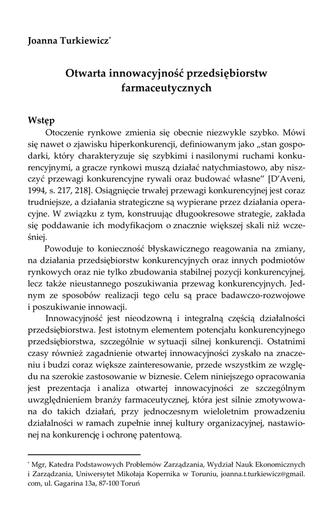 Joanna Turkiewicz* Otwarta innowacyjność przedsiębiorstw farmaceutycznych Wstęp Otoczenie rynkowe zmienia się obecnie niezwykle szybko. Mówi się nawet o zjawisku hiperkonkurencji, definiowanym jako „stan gospodarki, który charakteryzuje się szybkimi i nasilonymi ruchami konkurencyjnymi, a gracze rynkowi muszą działać natychmiastowo, aby niszczyć przewagi konkurencyjne rywali oraz budować własne” [D’Aveni, 1994, s. 217, 218]. Osiągnięcie trwałej przewagi konkurencyjnej jest coraz trudniejsze, a działania strategiczne są wypierane przez działania operacyjne. W związku z tym, konstruując długookresowe strategie, zakłada się poddawanie ich modyfikacjom o znacznie większej skali niż wcześniej. Powoduje to konieczność błyskawicznego reagowania na zmiany, na działania przedsiębiorstw konkurencyjnych oraz innych podmiotów rynkowych oraz nie tylko zbudowania stabilnej pozycji konkurencyjnej, lecz także nieustannego poszukiwania przewag konkurencyjnych. Jednym ze sposobów realizacji tego celu są prace badawczo-rozwojowe i poszukiwanie innowacji. Innowacyjność jest nieodzowną i integralną częścią działalności przedsiębiorstwa. Jest istotnym elementem potencjału konkurencyjnego przedsiębiorstwa, szczególnie w sytuacji silnej konkurencji. Ostatnimi czasy również zagadnienie otwartej innowacyjności zyskało na znaczeniu i budzi coraz większe zainteresowanie, przede wszystkim ze względu na szerokie zastosowanie w biznesie. Celem niniejszego opracowania jest prezentacja i analiza otwartej innowacyjności ze szczególnym uwzględnieniem branży farmaceutycznej, która jest silnie zmotywowana do takich działań, przy jednoczesnym wieloletnim prowadzeniu działalności w ramach zupełnie innej kultury organizacyjnej, nastawionej na konkurencję i ochronę patentową. Mgr, Katedra Podstawowych Problemów Zarządzania, Wydział Nauk Ekonomicznych i Zarządzania, Uniwersytet Mikołaja Kopernika w Toruniu, joanna.t.turkiewicz@gmail. com, ul. Gagarina 13a, 87-100 Toruń * 426 Joanna Turkiewicz 1. Otwarta innowacyjność jako nowe zjawisko w gospodarce Innowacje można podzielić na trzy kategorie [Weeks, Feeny, 2008, s. 130, 131]: – innowacje na poziomie operacyjnym, mające na celu usprawnienie działań i obniżenie kosztów, dotyczą przede wszystkim zmian technologicznych, – innowacje procesów biznesowych, zmieniające sposób prowadzenia biznesu w znaczący sposób, – innowacje strategiczne związane z poszerzeniem zakresu oferty przedsiębiorstwa lub wejściem na nowy rynek. Z pojęciem innowacji najczęściej kojarzony jest trzeci, najwyższy poziom innowacji, czyli poziom strategiczny. Przede wszystkim innowacje strategiczne są uznawane za nieodzowne w budowaniu pozycji konkurencyjnej przedsiębiorstwa, pozwalające wykreować nowe produkty, zwiększyć przychody. Innowacje procesowe z kolei wpływają w znacznej mierze na obniżenie kosztów przedsiębiorstwa. Kreowanie innowacji na tych poziomach nie byłoby możliwe bez innowacji na poziomie operacyjnym. Innowacyjność jest zatem zagadnieniem złożonym, wielopoziomowym, co wpływa także na większą trudność w kreowaniu innowacji. Rozwiązaniem może być przyjęcie odpowiedniej strategii. Gartner zaproponował sześć strategii dla przedsiębiorstw dążących do rozwijania potencjału innowacyjnego. Jedną z nich jest innowacyjność oparta na partnerstwie, polegająca na dzieleniu zasobów, przestrzeni rynkowej, zestawu produktów [Harris, 2009, s. 15]. Gospodarka światowa dostarcza wielu przykładów partnerstwa innowacyjnego, m. in. Calvin Klein i Barry Schwartz, Miuccia Prada i Patrizio Bertelli, Bill Hewlett i David Packard. Są to przykłady z branży kosmetycznej, odzieżowej oraz elektronicznej, przemawiające za opłacalnością współpracy podczas kreowania i wdrażania innowacji [Rigby i inni, 2009, s. 81, 82, 84]. Interesujące wydaje się przeanalizowanie w tym kontekście innowacyjności w innych branżach, w tym w branży farmaceutycznej, w której działalność wpisana była (i nadal jest) ścisła ochrona tajemnic przedsiębiorstwa, a także ochrona patentowa. Również z tego względu zarówno partnerstwo innowacyjne jak i otwarta innowacyjność jest zjawiskiem relatywnie nowym w tej branży. Polega ono na tym, że przedsiębiorstwa i inne organizacje, a także osoby fizyczne współpracując ze Otwarta innowacyjność przedsiębiorstw farmaceutycznych 427 sobą tworzą nową wartość, dzielą się pomysłami i wspólnie pracują nad innowacjami po to, aby zwiększyć efektywność tych działań. Według H. W. Chesbrough i A. R. Garman „otwarta innowacyjność umożliwia swobodny, dwukierunkowy przepływ własności intelektualnej, idei i ludzi miedzy firmą a jej otoczeniem”. Ponadto rozróżnili oni dwa rodzaje otwartej innowacyjności: otwartą innowacyjność odśrodkową, „czyli przesuwanie wybranych projektów i zasobów poza mury firmy”, oraz otwartą innowacyjność dośrodkową, polegającą na „współpracy ludzi z zewnątrz, umożliwiającej przedsiębiorstwu tworzenie ofert, których skala przekracza jego własny potencjał” [Chesbrough, Garman, 2010, s. 49]. Przykładem przedsięwzięcia z zakresu otwartej innowacyjności jest serwis InnoCentive, który początkowo był wewnętrznym projektem koncernu Eli Lilly. Celem przedsięwzięcia jest pozyskiwanie z zewnątrz pomysłów i wiedzy do opracowywania nowych leków [Chesbrough, Garman, 2010, s. 49]. Pomysły innowacyjne mogą pochodzić nie tylko od zwykłych internautów, również od ekspertów nie związanych z twórcami platformy. Dzielenie się nimi na forum pozwala uzyskać szerokie spektrum opinii, komentarzy, znaleźć potencjalnych współpracowników, co już na początkowym etapie procesu innowacyjnego pozwala obniżać koszty i ryzyko. Kolejnym interesującym projektem jest GamChanger, który został rozpoczęty w 1996 roku przez Shell Oil. Inicjatywa odniosła sp