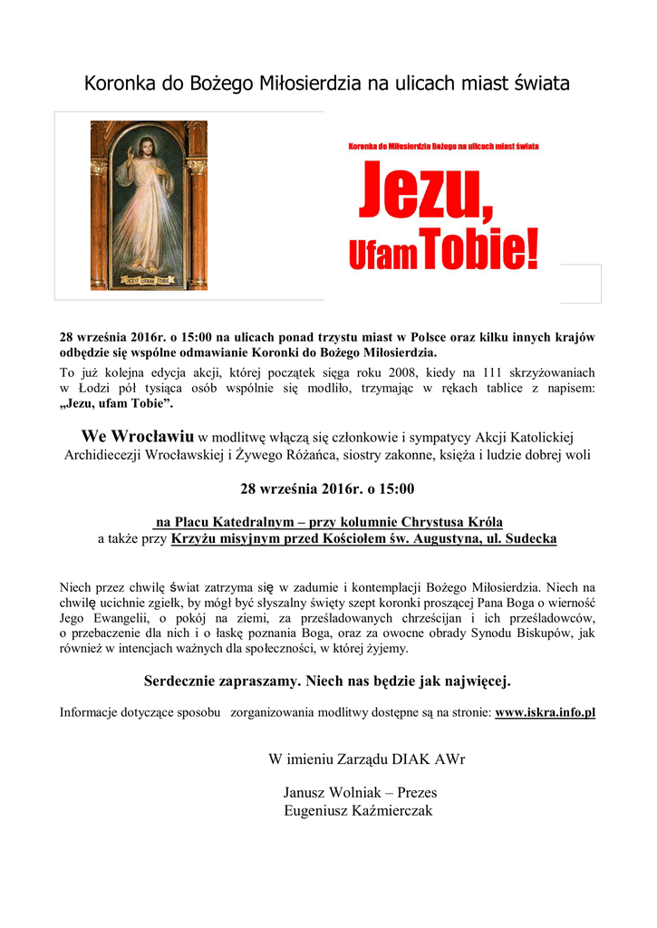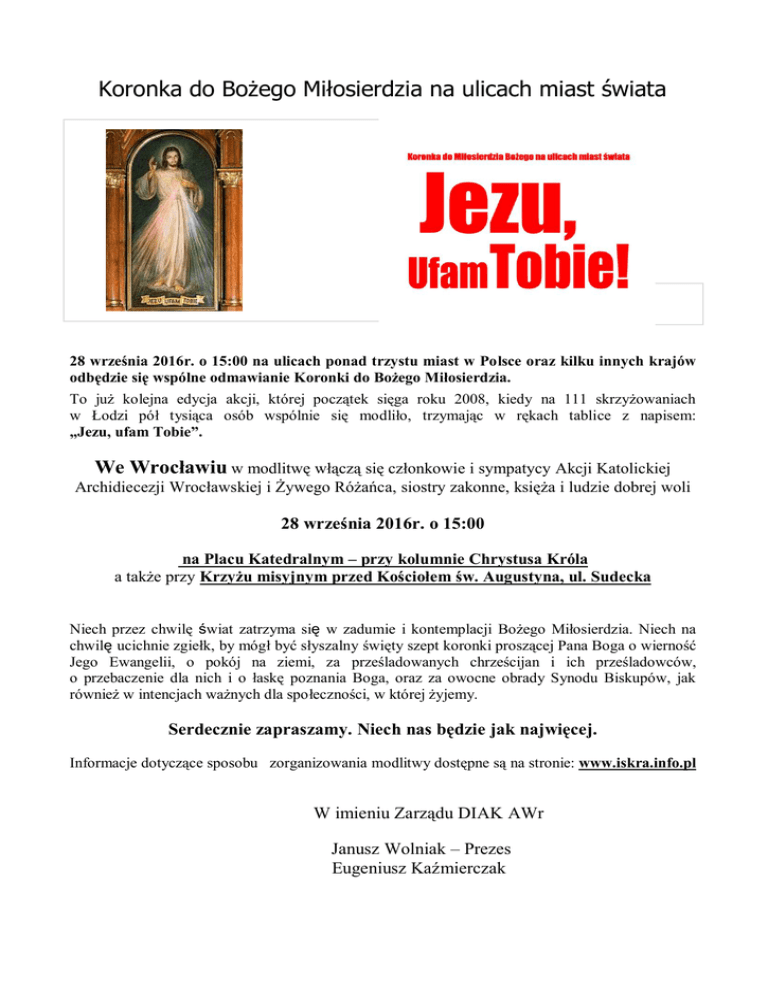 Koronka do Bożego Miłosierdzia na ulicach miast świata 28 września 2016r. o 15:00 na ulicach ponad trzystu miast w Polsce oraz kilku innych krajów odbędzie się wspólne odmawianie Koronki do Bożego Miłosierdzia. To już kolejna edycja akcji, której początek sięga roku 2008, kiedy na 111 skrzyżowaniach w Łodzi pół tysiąca osób wspólnie się modliło, trzymając w rękach tablice z napisem: „Jezu, ufam Tobie”. We Wrocławiu w modlitwę włączą się członkowie i sympatycy Akcji Katolickiej Archidiecezji Wrocławskiej i Żywego Różańca, siostry zakonne, księża i ludzie dobrej woli 28 września 2016r. o 15:00 na Placu Katedralnym – przy kolumnie Chrystusa Króla a także przy Krzyżu misyjnym przed Kościołem św. Augustyna, ul. Sudecka Niech przez chwilę świat zatrzyma się w zadumie i kontemplacji Bożego Miłosierdzia. Niech na chwilę ucichnie zgiełk, by mógł być słyszalny święty szept koronki proszącej Pana Boga o wierność Jego Ewangelii, o pokój na ziemi, za prześladowanych chrześcijan i ich prześladowców, o przebaczenie dla nich i o łaskę poznania Boga, oraz za owocne obrady Synodu Biskupów, jak również w intencjach ważnych dla społeczności, w której żyjemy. Serdecznie zapraszamy. Niech nas będzie jak najwięcej. Informacje dotyczące sposobu zorganizowania modlitwy dostępne są na stronie: www.iskra.info.pl W imieniu Zarządu DIAK AWr Janusz Wolniak – Prezes Eugeniusz Kaźmierczak