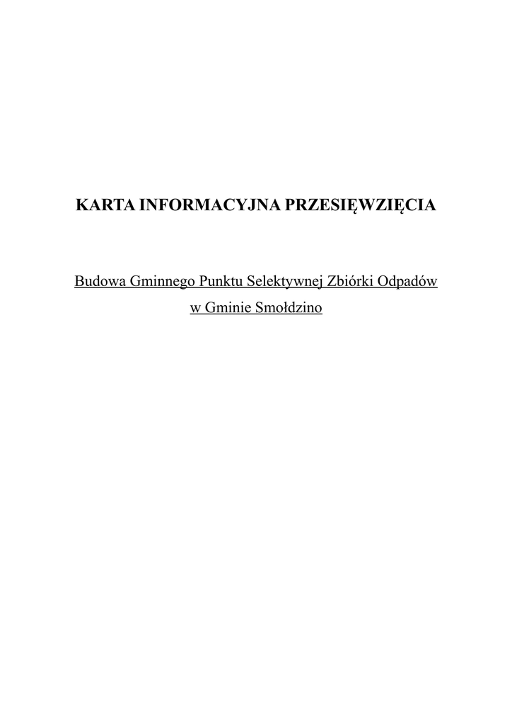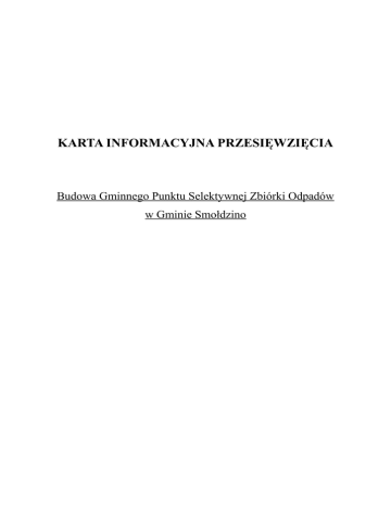 KARTA INFORMACYJNA PRZESIĘWZIĘCIA Budowa Gminnego Punktu Selektywnej Zbiórki Odpadów w Gminie Smołdzino 1. Opis przedsięwzięcia (rodzaj, usytuowanie, skala ) Zamierzonym przedsięwzięciem inwestycyjnym jest budowa Gminnego Punktu Selektywnej Zbiórki Odpadów (GPSZOK) na działce 348/7, na której zlokalizowana jest oczyszczalnia ścieków w Smołdzinie, poprzez zmianę w części sposobu użytkowania tej działki. Przedsięwzięcie umiejscowione jest w północno – zachodniej części miejscowości Smołdzino a jego położenie wskazano na mapie poglądowej: Źródło: www.geoportal.gov.pl Źródło: Opracowanie własne Omawiane zadanie kwalifikowane jest zgodnie z § 3 ust. 1 pkt 81 rozporządzenia Rady Ministrów z dnia 9 listopada 2010 r. w sprawie przedsięwzięć mogących znacząco oddziaływać na środowisko jako „punkty do zbierania lub przeładunku odpadów, w tym złomu”. Gminny Punkt Selektywnej Zbiórki Odpadów zostanie utworzony również na mocy wymogów ustawy o utrzymaniu czystości i porządku w gminach (Dz. U. z 2012 r. poz. 391 oraz 951), która to nakłada na gminy organizowanie takich miejsc selektywnej zbiórki odpadów. Punkt Selektywnej Zbiórki Odpadów będzie stanowić dla mieszkańców Gminy Smołdzino zbiorcze miejsce dobrowolnego gromadzenia wyselekcjonowanych odpadów komunalnych powstających w gospodarstwach domowych. 2. Powierzchnia działki oraz sposób jej wykorzystania Powierzchnia działki to około 15,50 ha. Teren nie posiada opracowanego planu zagospodarowania przestrzennego. W „Studium uwarunkowań przestrzennych dla Gminy Smołdzino” działka 348/7 położona jest w częściach na terenie oczyszczalni ścieków, obszaru projektowanego rozwoju osiedleńczego, terenu sportu i terenu lasu w obszarze narażonym na zalanie wodą stuletnią Załącznik Nr 1 do karty informacyjnej. Działka stanowi mienie gminne, a zarządzającym oczyszczalnią ścieków na mocy umowy koncesyjnej jest Zakład Usług Wodociągowych w Słupsku, który to pismem Nr DzT/4548/12 do Wójta Gminy Smołdzino po konsultacjach z WIOŚ Delegatura w Słupsku oraz organem wydającym pozwolenie wodno – prawne wyraził zgodę na odstąpienie części działki na której zlokalizowana jest oczyszczalnia ścieków na zorganizowanie punktu selektywnej zbiórki odpadów dla mieszkańców Gminy Smołdzino. Pismo Nr DzT/4548/12 Zakładu Usług Wodociągowych w Słupsku stanowi Załącznik Nr 2 do karty informacyjnej. Z ewidencji gruntów wynika, iż w granicach dz. 348/7 znajdują się następujące użytki: RV- 9.21 ha, RVI-1,76 ha, ŁV-0,26, PsIV-1,05 ha, W-RV-0,08 ha, LsV-0.19 ha, Ba-0,72 ha, Bz-2,24ha. Wypis z rejestru gruntów stanowi Załącznik Nr 3 do karty informacyjnej. Budowa Punktu Selektywnej Zbiórki Odpadów realizowana będzie w granicach wygrodzonej oczyszczalni ścieków, w obszarze gruntów Ba - (tereny przemysłowe) i nie będzie wymagała „odrolnienia gruntu”. Powierzchnia wyznaczona do utworzenia GPSZOK to około 0,1480 ha. Mapka w skali 1:500 z zaznaczonym obszarem pod budowę Punktu Selektywnej Zbiórki Odpadów w Smołdzinie stanowi Załącznik Nr 4 do karty informacyjnej. 3. Charakterystyka pokrycia roślinnością oraz występowania zwierząt 3.1Charakterystyka florystyczna oraz fitocenotyczna Powierzchnia przedmiotowej działki posiada niską wartość florystyczną i fitocenotyczną. Ekstensywny sposób użytkowania, przyczynił się do powstania, małowartościowych fitocenoz o niewielkiej atrakcyjności botanicznej. Stwierdza się na nim występowanie gatunków roślin ruderalnych. Skład florystyczny fitocenozy nie kwalifikuje jej do ochrony zachowawczej. Nie przewiduje się również zmniejszenia szaty roślinnej terenów biologicznie czynnych. 3.2 Charakterystyka faunistyczna Na terenie objętym opracowaniem zmniejszeniu nie ulegnie powierzchnia zajmowana przez kręgowce: ptaki, ssaki (kret, zając). Do występujących gatunków ptaków należą samotnik, skowronek, pokląskwa, świergotek łąkowy, kopciuszek, potrzeszcz, trznadel, pliszka siwa, potrzos, pokrzewka czarnołbista, szpak, dymówka, kruk, sroka rzadziej kuropatwa i grzywacz. Z ssaków na penetrowanej powierzchni można spotkać ślady bytności kreta i zająca. Zarówno występujące ptaki jak i ssaki należą do gatunków pospolitych i rozpowszechnionych w naszym kraju nie zagrożonych wyginięciem. Nie zostały ujęte w załączniku Nr 1 do Dyrektywy Rady 79/409/EWG z dnia 1979 r. w sprawie ochrony dzikich ptaków oraz w załącznikach Nr II i Nr IV do Dyrektywy Rady Rady 92/43/EWG z dnia 21 maja 1992 r. w sprawie ochrony siedlisk naturalnych oraz dzikiej fauny i flory. Inwestycja nie będzie miała wpływu na występowanie pozostałych gatunków ptaków i zwierząt ze względu na pozostawienie rzeki Łupawy w aktualnym stanie. Wprowadzone zmiany nie odbijają się negatywnie na zwierzęta występujące na terenach przyległych. 4. Teren inwestycji polegający na budowie Gminnego Punktu Selektywnej Zbiórki Odpadów w Smołdzinie W wyniku realizacji inwestycji nastąpi dalsze wykorzystanie istniejącego obszaru przy oczyszczalni ścieków. Działka wymaga niewielkich nakładów związanych z uzupełnieniem istniejącego ogrodzenia i oświetlenia, jest uzbrojona w wodę i prąd. Teren posiada drogę dojazdową gruntową. Kontenery do magazynowania opakowań materiałów niebezpiecznych oraz odpadów urządzeń elektrycznych i elektronicznych będą usytuowane na uszczelnionym podłożu oraz zadaszone. Teren w porze nocnej będzie zamknięty. W celu poprawy estetyki wskazane jest dosadzenie pasa zieleni. W utworzonym tzw. GPSZOK będą odbierane i magazynowane zgodnie z „Regulaminem utrzymania i czystości i porządku na terenie Gminy Smołdzino następujące odpady zebrane w sposób selektywny: 1) przeterminowane leki i chemikalia, 2) papier i tektura, 3) opakowania wielomateriałowe i metale, 4) zużyte baterie i akumulatory, 5) zużyty sprzęt elektryczny i ele
