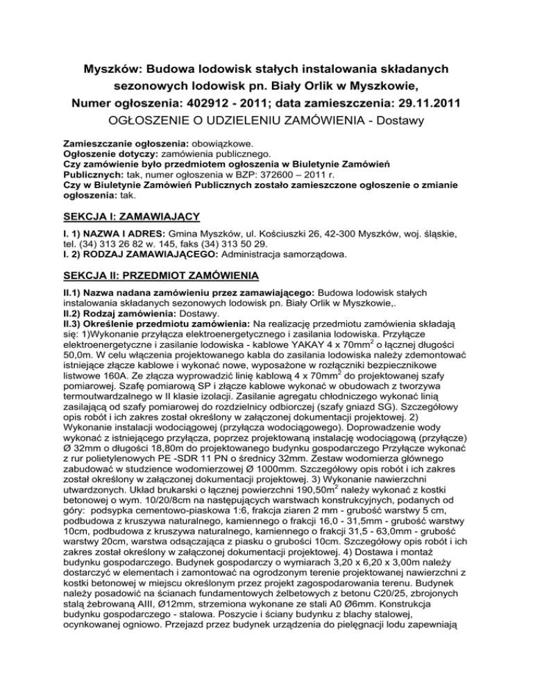 Myszków: Budowa lodowisk stałych instalowania składanych sezonowych lodowisk pn. Biały Orlik w Myszkowie, Numer ogłoszenia: 402912 - 2011; data zamieszczenia: 29.11.2011 OGŁOSZENIE O UDZIELENIU ZAMÓWIENIA - Dostawy Zamieszczanie ogłoszenia: obowiązkowe. Ogłoszenie dotyczy: zamówienia publicznego. Czy zamówienie było przedmiotem ogłoszenia w Biuletynie Zamówień Publicznych: tak, numer ogłoszenia w BZP: 372600 – 2011 r. Czy w Biuletynie Zamówień Publicznych zostało zamieszczone ogłoszenie o zmianie ogłoszenia: tak. SEKCJA I: ZAMAWIAJĄCY I. 1) NAZWA I ADRES: Gmina Myszków, ul. Kościuszki 26, 42-300 Myszków, woj. śląskie, tel. (34) 313 26 82 w. 145, faks (34) 313 50 29. I. 2) RODZAJ ZAMAWIAJĄCEGO: Administracja samorządowa. SEKCJA II: PRZEDMIOT ZAMÓWIENIA II.1) Nazwa nadana zamówieniu przez zamawiającego: Budowa lodowisk stałych instalowania składanych sezonowych lodowisk pn. Biały Orlik w Myszkowie,. II.2) Rodzaj zamówienia: Dostawy. II.3) Określenie przedmiotu zamówienia: Na realizację przedmiotu zamówienia składają się: 1)Wykonanie przyłącza elektroenergetycznego i zasilania lodowiska. Przyłącze elektroenergetyczne i zasilanie lodowiska - kablowe YAKAY 4 x 70mm2 o łącznej długości 50,0m. W celu włączenia projektowanego kabla do zasilania lodowiska należy zdemontować istniejące złącze kablowe i wykonać nowe, wyposażone w rozłączniki bezpiecznikowe listwowe 160A. Ze złącza wyprowadzić linię kablową 4 x 70mm2 do projektowanej szafy pomiarowej. Szafę pomiarową SP i złącze kablowe wykonać w obudowach z tworzywa termoutwardzalnego w II klasie izolacji. Zasilanie agregatu chłodniczego wykonać linią zasilającą od szafy pomiarowej do rozdzielnicy odbiorczej (szafy gniazd SG). Szczegółowy opis robót i ich zakres został określony w załączonej dokumentacji projektowej. 2) Wykonanie instalacji wodociągowej (przyłącza wodociągowego). Doprowadzenie wody wykonać z istniejącego przyłącza, poprzez projektowaną instalację wodociągową (przyłącze) Ø 32mm o długości 18,80m do projektowanego budynku gospodarczego Przyłącze wykonać z rur polietylenowych PE -SDR 11 PN o średnicy 32mm. Zestaw wodomierza głównego zabudować w studzience wodomierzowej Ø 1000mm. Szczegółowy opis robót i ich zakres został określony w załączonej dokumentacji projektowej. 3) Wykonanie nawierzchni utwardzonych. Układ brukarski o łącznej powierzchni 190,50m2 należy wykonać z kostki betonowej o wym. 10/20/8cm na następujących warstwach konstrukcyjnych, podanych od góry: podsypka cementowo-piaskowa 1:6, frakcja ziaren 2 mm - grubość warstwy 5 cm, podbudowa z kruszywa naturalnego, kamiennego o frakcji 16,0 - 31,5mm - grubość warstwy 10cm, podbudowa z kruszywa naturalnego, kamiennego o frakcji 31,5 - 63,0mm - grubość warstwy 20cm, warstwa odsączająca z piasku o grubości 10cm. Szczegółowy opis robót i ich zakres został określony w załączonej dokumentacji projektowej. 4) Dostawa i montaż budynku gospodarczego. Budynek gospodarczy o wymiarach 3,20 x 6,20 x 3,00m należy dostarczyć w elementach i zamontować na ogrodzonym terenie projektowanej nawierzchni z kostki betonowej w miejscu określonym przez projekt zagospodarowania terenu. Budynek należy posadowić na ścianach fundamentowych żelbetowych z betonu C20/25, zbrojonych stalą żebrowaną AIII, Ø12mm, strzemiona wykonane ze stali A0 Ø6mm. Konstrukcja budynku gospodarczego - stalowa. Poszycie i ściany budynku z blachy stalowej, ocynkowanej ogniowo. Przejazd przez budynek urządzenia do pielęgnacji lodu zapewniają dwie bramy uchylne, płytowe - ustawione naprzeciw siebie. Szczegółowy opis budynku gospodarczego został określony w projekcie budowlanym - branża architektoniczna. Zakres prac został podany w przedmiarze robót. 5) Wykonanie ogrodzenia terenu wraz z bramami i furtkami. Ogrodzenie terenu na słupkach stalowych, mocowanych w fundamentach betonowych z betonu C 25/30 na podbudowie z chudego betonu. Wypełnienie z siatki stalowej, ocynkowanej powlekanej PCV, krawędź oczka 35/35mm, grubość 2,2/3,4. Wysokość min. 4,0m. Furtki, bramy, słupki i poprzeczki wykonane ze stali ocynkowanej. Furtki i bramy rozwierane. Słupki ogrodzeniowe z kształtownika zamkniętego 60 x 60/3mm, poprzeczki z rur Ø 42/2mm, słupki przy furtkach z kształtownika zamkniętego 70/70/3mm. Słupki przy bramach z kształtownika zamkniętego 100/100/5. Furtki wykonane z kształtownika zamkniętego 40/40/3mm. Bramy wykonane z kształtownika zamkniętego 60/60/3mm. Furtki o świetle 126/220cm w istniejącym ogrodzeniu boiska wielofunkcyjnego 2 szt. Brama wjazdowa o świetle 294/300 w istniejącym ogrodzeniu boiska wielofunkcyjnego - 1 szt. Brama wjazdowa o świetle 294/300cm w projektowanym ogrodzeniu - 1 szt. Ogrodzenia projektowane o wys. 4,0m i długości 37,14m. Szczegółowy opis robót i ich zakres został określony w załączonej dokumentacji projektowej, na którą składają się projekt budowlany - branża architektoniczna, specyfikacja techniczna wykonania i odbioru robót, przedmiar robót. 6) Dostawa i montaż agregatu chłodniczego z podłączeniem do kolektorów. Agregat chłodniczy: wypełnienie wsadem ekologicznym (np. freonem ekologicznym lub innym gazem ekologicznym), moc chłodnicza min. 130 kW przy temperaturze otoczenia +10oC i temperaturach glikolu wej./wyj. -9/-12oC, wymagana moc zasilania elektrycznego nieprzekraczająca 60 kW, wyposażenie w pompę obiegową z płynną regulacją przepływu, wyposażenie w pompę ciepła służącą do szybkiego rozmrażania tafli lodowiska oraz programator temperatury wyjściowej czynnika chłodniczego. Agregat chłodniczy powinien posiadać płynną regulację wydajności lub min. 3 stopnie regulacji wydajności. System sterowania pracą agregatu: realizowany przez sterownik elektroniczny zamontowany w szafce sterowniczej w sposób uniemożliwiający dostęp osób niepowołanych. System sterowania