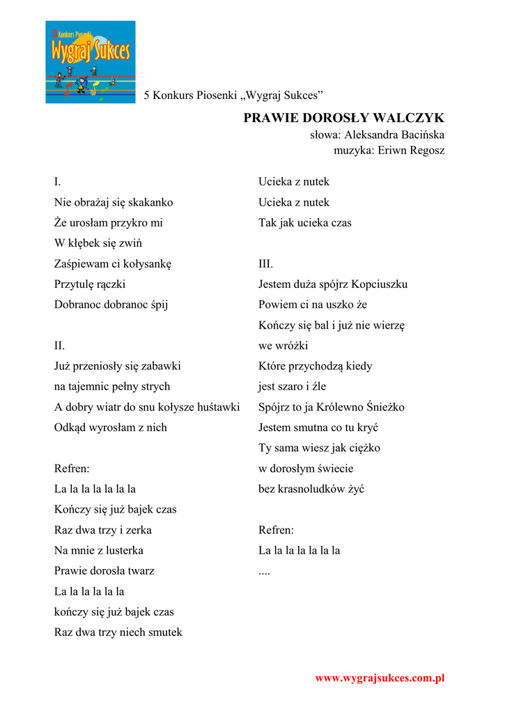 5 Konkurs Piosenki „Wygraj Sukces” PRAWIE DOROSŁY WALCZYK słowa: Aleksandra Bacińska muzyka: Eriwn Regosz I. Ucieka z nutek Nie obrażaj się skakanko Ucieka z nutek Że urosłam przykro mi Tak jak ucieka czas W kłębek się zwiń Zaśpiewam ci kołysankę III. Przytulę rączki Jestem duża spójrz Kopciuszku Dobranoc dobranoc śpij Powiem ci na uszko że Kończy się bal i już nie wierzę II. we wróżki Już przeniosły się zabawki Które przychodzą kiedy na tajemnic pełny strych jest szaro i źle A dobry wiatr do snu kołysze huśtawki Spójrz to ja Królewno Śnieżko Odkąd wyrosłam z nich Jestem smutna co tu kryć Ty sama wiesz jak ciężko Refren: w dorosłym świecie La la la la la la la bez krasnoludków żyć Kończy się już bajek czas Raz dwa trzy i zerka Refren: Na mnie z lusterka La la la la la la la Prawie dorosła twarz .... La la la la la la kończy się już bajek czas Raz dwa trzy niech smutek www.wygrajsukces.com.pl