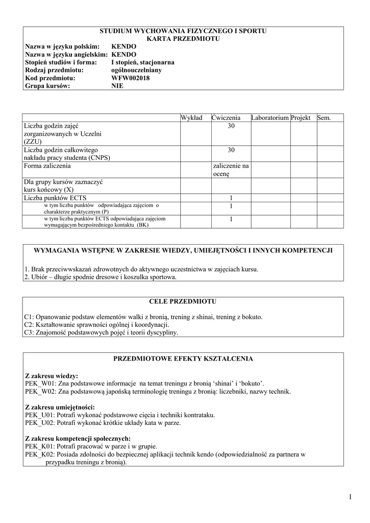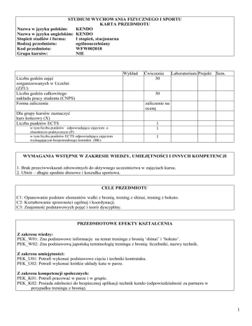 STUDIUM WYCHOWANIA FIZYCZNEGO I SPORTU KARTA PRZEDMIOTU Nazwa w języku polskim: KENDO Nazwa w języku angielskim: KENDO Stopień studiów i forma: I stopień, stacjonarna Rodzaj przedmiotu: ogólnouczelniany Kod przedmiotu: WFW002018 Grupa kursów: NIE Wykład Liczba godzin zajęć zorganizowanych w Uczelni (ZZU) Liczba godzin całkowitego nakładu pracy studenta (CNPS) Forma zaliczenia Ćwiczenia 30 Laboratorium Projekt Sem. 30 zaliczenie na ocenę Dla grupy kursów zaznaczyć kurs końcowy (X) Liczba punktów ECTS w tym liczba punktów odpowiadająca zajęciom o charakterze praktycznym (P) w tym liczba punktów ECTS odpowiadająca zajęciom wymagającym bezpośredniego kontaktu (BK) 1 1 1 WYMAGANIA WSTĘPNE W ZAKRESIE WIEDZY, UMIEJĘTNOŚCI I INNYCH KOMPETENCJI 1. Brak przeciwwskazań zdrowotnych do aktywnego uczestnictwa w zajęciach kursu. 2. Ubiór – długie spodnie dresowe i koszulka sportowa. CELE PRZEDMIOTU C1: Opanowanie podstaw elementów walki z bronią, trening z shinai, trening z bokuto. C2: Kształtowanie sprawności ogólnej i koordynacji. C3: Znajomość podstawowych pojęć i teorii dyscypliny. PRZEDMIOTOWE EFEKTY KSZTAŁCENIA Z zakresu wiedzy: PEK_W01: Zna podstawowe informacje na temat treningu z bronią ‘shinai’ i ‘bokuto’. PEK_W02: Zna podstawową japońską terminologię treningu z bronią: liczebniki, nazwy technik. Z zakresu umiejętności: PEK_U01: Potrafi wykonać podstawowe cięcia i techniki kontrataku. PEK_U02: Potrafi wykonać krótkie układy kata w parze. Z zakresu kompetencji społecznych: PEK_K01: Potrafi pracować w parze i w grupie. PEK_K02: Posiada zdolności do bezpiecznej aplikacji technik kendo (odpowiedzialność za partnera w przypadku treningu z bronią). 1 TREŚCI PROGRAMOWE Ćw. 1 Ćw. 2 Ćw. 3 Ćw. 4 Ćw. 5 Ćw. 6 Ćw. 7 Ćw. 8 Ćw. 9 Ćw. 10 Ćw. 11 Ćw. 12 Ćw. 13 Ćw. 14 Ćw. 15 Forma zajęć - ćwiczenia Szkolenie BHP, nauka zasad i ceremoniału zajęć. Podstawowe pozycje i formy ataków – uderzenie w głowę – ‘men’. Podstawowe pozycje i formy ataków – uderzenie w rękę – ‘kote’. Podstawowe pozycje i formy ataków – uderzenie w tułów – ‘do’. Podstawowe pozycje i formy ataków podwójnych: ręka- głowa [kote-men ], ręka – tułów [kote-do]. Techniki kontrataku - cięcie w głowę – unik - ‘nuki”. Pierwsza część kendo kata z długim drewnianym mieczem bokuto. Druga część kendo kata z długim drewnianym mieczem bokuto. Techniki kontrataku - cięcie w rękę - unik - ‘nuki”. Techniki wyjścia z klinczu : ‘hiki’ Trzy część kendo kata z długim drewnianym mieczem bokuto. Trzy część kendo kata z długim drewnianym mieczem bokuto - ciąg dalszy. 1, 2 ,3 kendo kata z długim drewnianym mieczem ‘bokuto’ Powtórka materiału. Powtórka materiału, wpis ocen. Suma godzin Liczba godzin 2 2 2 2 2 2 2 2 2 2 2 2 2 2 2 30 STOSOWANE NARZĘDZIA DYDAKTYCZNE N1. Ćwiczenia praktyczne indywidualne i w parze. N2. Demonstracja prowadzącego . N3. Pokaz. N4. Wykład. OCENA OSIĄGNIĘCIA PRZEDMIOTOWYCH EFEKTÓW KSZTAŁCENIA Oceny (F – formująca (w trakcie semestru), Numer efektu P – podsumowująca (na koniec semestru) kształcenia F1 PEK_W01, W02 F2 PEK_U01, U02 Sposób oceny osiągnięcia efektu kształcenia Weryfikacja w trakcie zajęć. Frekwencja, aktywność, test umiejętności. F3 PEK_K01, K02 Obserwacja w trakcie zajęć. P Frekwencja, aktywność i postawa na zajęciach oraz średnia z ocen F1 i F2 LITERATURA PODSTAWOWA I UZUPEŁNIAJĄCA LITERATURA PODSTAWOWA: [1] Ozawa H.: Kendo. Bydgoszcz Rekomendacja Polskiego Związku Kendo 1999. LITERATURA UZUPEŁNIAJĄCA: [1] Tokeshi J.: Kendo – podstawy, filozofia i zasady walki. Bydgoszcz Rekomendacja Polskiego Związku Kendo 2008. OPIEKUN PRZEDMIOTU (IMIĘ, NAZWISKO, ADRES E-MAIL) Wiesław Biel ; [email protected] ; 2 MACIERZ POWIĄZANIA EFEKTÓW KSZTAŁCENIA DLA PRZEDMIOTU KENDO Odniesienie przedmiotowego efektu do Cele Treści Przedmiotowy efektów kształcenia zdefiniowanych dla przedmiotu programowe efekt obszarowych efektów kształcenia ** ** kształcenia PEK_W01 C1, C2, C3 Ćw. 1-15 Posiada podstawową wiedzę z zakresu (wiedza) wybranej dyscypliny sportu (kursu wf) PEK_W02 spośród kilkudziesięciu oferowanych C1, C2, C3 Ćw. 1-15 (wiedza) PEK_U01 Posiada podstawowe umiejętności z zakresu C1, C2, C3 Ćw. 1-15 (umiejętności) dyscyplin, którą wybrał, posiada, umiejętność włączenia się w prozdrowotny styl życia z wybraniem aktywności na całe życie oraz C1, C2, C3 Ćw. 1-15 PEK_U02 kształtowania postaw sprzyjających całożyciowej aktywności fizycznej. PEK_K01 Promuje społeczne i kulturowe znaczenie C1, C2 Ćw. 1-15 (kompetencje) sportu i aktywności fizycznej oraz pielęgnuje PEK_K02 własne upodobania z zakresu kultury C1, C2, C3 Ćw. 1-15 fizycznej. Numer narzędzia dydaktycznego ** N2, N4 N4 N1, N2, N3, N4 N1, N2, N3, N4 N1, N2, N3, N4 N1, N2, N3, N4 ** - z tabel powyżej 3
