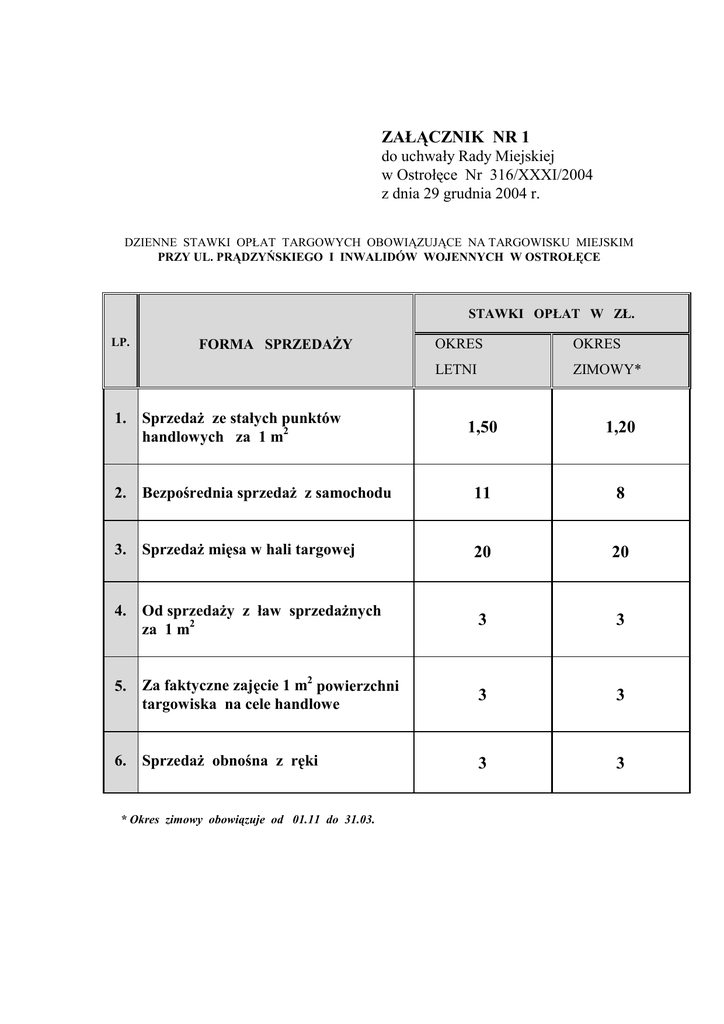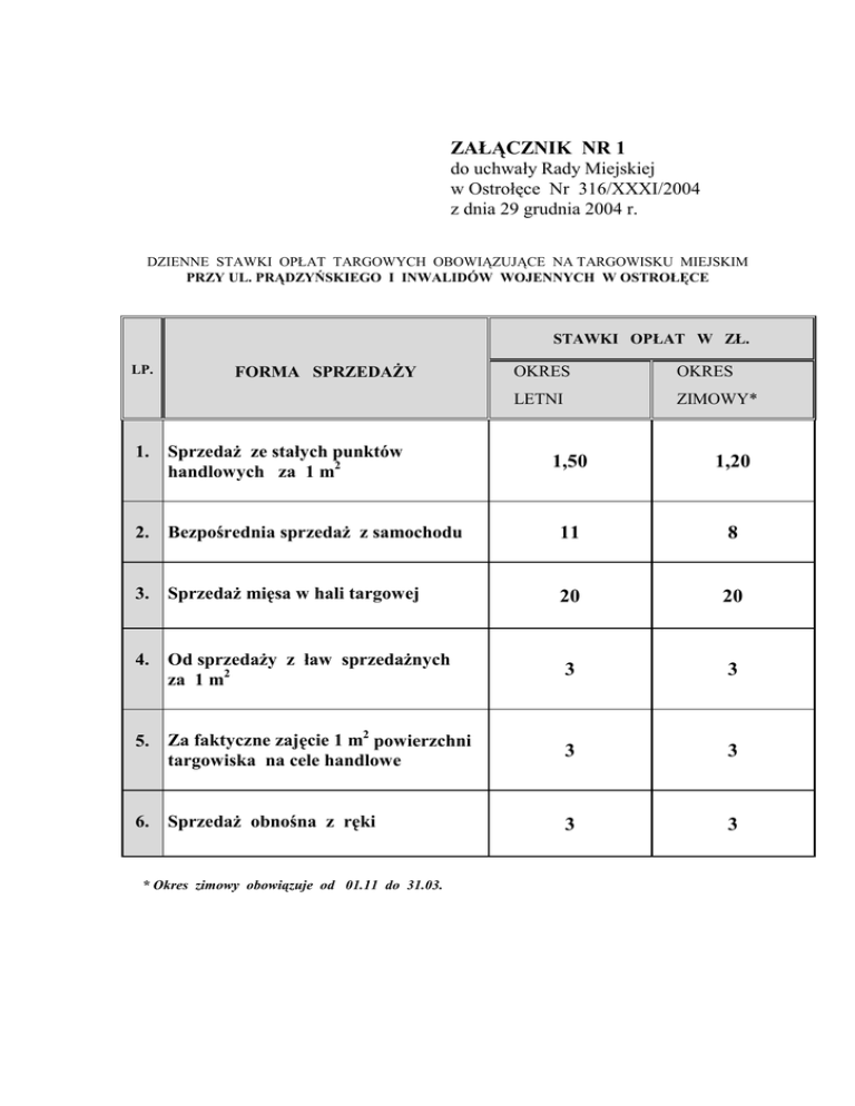 ZAŁĄCZNIK NR 1 do uchwały Rady Miejskiej w Ostrołęce Nr 316/XXXI/2004 z dnia 29 grudnia 2004 r. DZIENNE STAWKI OPŁAT TARGOWYCH OBOWIĄZUJĄCE NA TARGOWISKU MIEJSKIM PRZY UL. PRĄDZYŃSKIEGO I INWALIDÓW WOJENNYCH W OSTROŁĘCE STAWKI OPŁAT W ZŁ. LP. FORMA SPRZEDAśY 1. SprzedaŜ ze stałych punktów handlowych za 1 m2 OKRES OKRES LETNI ZIMOWY* 1,50 1,20 2. Bezpośrednia sprzedaŜ z samochodu 11 8 3. SprzedaŜ mięsa w hali targowej 20 20 4. Od sprzedaŜy z ław sprzedaŜnych za 1 m2 3 3 5. Za faktyczne zajęcie 1 m2 powierzchni targowiska na cele handlowe 3 3 6. SprzedaŜ obnośna z ręki 3 3 * Okres zimowy obowiązuje od 01.11 do 31.03. ZAŁĄCZNIK NR 2 do uchwały Rady Miejskiej w Ostrołęce Nr 316/XXXI/2004 z dnia 29 grudnia 2004 r. DZIENNE STAWKI OPŁAT TARGOWYCH OBOWIĄZUJĄCE NA TARGOWISKU MIEJSKIM PRZY UL. TARGOWEJ I ZAWADZKIEGO LP. 1. FORMA SPRZEDAśY Bezpośrednia sprzedaŜ z : - samochodu osobowego i osobowego z przyczepą 12 - samochodu dostawczego z przyczepą do 3,5 t. 15 - samochodu cięŜarowego 18 - samochodu cięŜarowego z przyczepą 20 2. Od sprzedaŜy z ław sprzedaŜnych za 1 m2 3. Od wystawionego do sprzedaŜy pojazdu : 4. STAWKI OPŁAT W ZŁ. 3 - samochodu osobowego, dostawczego, cięŜarowego i ciągnika 10 - przyczepy i naczepy 5 - motocykle 3 Za faktyczne zajęcie 1 m2 powierzchni targowiska na cele handlowe 2 Dzienne stawki opłat targowych obowiązują w przypadku dokonywania sprzedaŜy we wtorki i niedziele. ZAŁĄCZNIK NR 3 do uchwały Rady Miejskiej w Ostrołęce Nr 316/XXXI/2004 z dnia 29 grudnia 2004 r. DZIENNE STAWKI OPŁAT TARGOWYCH OBOWIĄZUJĄCE NA TARGOWISKU MIEJSKIM PRZY UL. TARGOWEJ I BOHATERÓW WESTERPLATTE STAWKI LP. FORMA SPRZEDAśY OPŁAT W ZŁ. 1. 2. Bezpośrednia sprzedaŜ z : - samochodu osobowego i osobowego z przyczepą 12 - samochodu dostawczego z przyczepą do 3,5 t. 16 - samochodu cięŜarowego 18 - samochodu cięŜarowego z przyczepą 21 - ciągnika rolniczego i ciągnika z przyczepą 5 - wozu konnego 4 (nie dotyczy pkt. 2 i 3 ) SprzedaŜ zwierząt gospodarskich za 1 szt. : - koń, krowa 7 - cielę, owca, koza 5 3. SprzedaŜ wnoszonego ptactwa domowego 2 4. Za faktyczne zajęcie 1 m2 powierzchni targowiska na cele handlowe 2 ZAŁĄCZNIK NR 4 do uchwały Rady Miejskiej w Ostrołęce Nr 316/XXXI/2004 z dnia 29 grudnia 2004 r. DZIENNE STAWKI OPŁAT TARGOWYCH OBOWIĄZUJĄCE WE WSZELKICH INNYCH MIEJSCACH GDZIE PROWADZONY JEST HANDEL Lp. FORMA SPRZEDAśY 1. Od bezpośredniej sprzedaŜy z samochodu : - - osobowego i osobowego z przyczepą 5 - - dostawczego do 3,5 t. 10 - - cięŜarowego 15 2. 3. STAWKI OPŁAT W ZŁ. Od sprzedaŜy z ziemi, ręki , stoiska, straganu, ławy, stolika itp. za 1 m2 2 Od wystawionego do sprzedaŜy pojazdu : - samochodu osobowego, dostawczego, cięŜarowego i ciągnika - przyczepy i naczepy - motocykle 2,5 1 1