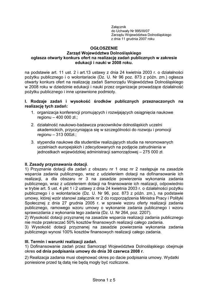 Załącznik do Uchwały Nr 995/III/07 Zarządu Województwa Dolnośląskiego z dnia 11 grudnia 2007 roku OGŁOSZENIE Zarząd Województwa Dolnośląskiego ogłasza otwarty konkurs ofert na realizację zadań publicznych w zakresie edukacji i nauki w 2008 roku. na podstawie art. 11 ust. 2 i art.13 ustawy z dnia 24 kwietnia 2003 r. o działalności poŜytku publicznego i o wolontariacie (Dz. U. Nr 96 poz. 873 z późn. zm.) ogłasza otwarty konkurs ofert na realizację zadań Samorządu Województwa Dolnośląskiego w 2008 roku w dziedzinie edukacji i nauki przez organizacje prowadzące działalność poŜytku publicznego i inne uprawnione podmioty. I. Rodzaje zadań i wysokość środków publicznych przeznaczonych na realizację tych zadań: 1. organizacja konferencji promujących i rozwijających osiągnięcia naukowe regionu – 400 000 zł.; 2. działalność naukowo-badawcza pracowników dolnośląskich uczelni akademickich, przyczyniająca się w szczególności do rozwoju i promocji regionu – 313 000zł.; 3. stypendia naukowe dla studentów realizujących studia na renomowanych uczelniach europejskich i zdecydowanych na podjęcie zatrudnienia w jednostkach wojewódzkiej administracji samorządowej – 275 000 zł. II. Zasady przyznawania dotacji. 1) Przyznanie dotacji dla zadań z obszaru nr 1 oraz nr 2 następuje na zasadzie wsparcia zadania publicznego, wraz z udzieleniem dotacji na dofinansowanie ich realizacji, a dla obszaru nr 3 na zasadzie powierzenia wykonania zadania publicznego, wraz z udzieleniem dotacji na finansowanie ich realizacji, odpowiednio w trybie art. 5 ust. 4 pkt 1 i 2 ustawy z dnia 24 kwietnia 2003 r. o działalności poŜytku publicznego i o wolontariacie (Dz. U. Nr 96, poz. 873 z późn. zm.), na podstawie umowy, której wzór stanowi załącznik nr 2 do rozporządzenia Ministra Pracy i Polityki Społecznej z dnia 27 grudnia 2005 r. w sprawie wzoru oferty realizacji zadania publicznego, ramowego wzoru umowy o wykonanie zadania publicznego i wzoru sprawozdania z wykonania tego zadania (Dz. U. Nr 264, poz. 2207). 2) Wysokość dotacji przyznanej na zasadzie wsparcia realizacji zadania publicznego nie moŜe przekraczać 50% kosztów finansowych realizacji całego zadania. 3) Wysokość dotacji przyznanej na zasadzie powierzenia wykonania zadania publicznego wynosi 100% kosztów finansowych realizacji całego zadania. III. Termin i warunki realizacji zadań. 1) Dofinansowanie zadań przez Samorząd Województwa Dolnośląskiego obejmuje okres od dnia podpisania umowy do dnia 30 czerwca 2008 r. 2) Realizacja zadania musi obejmować okres po dacie podpisania umowy. Wydatki poniesione przed tą datą nie będą mogły być rozliczone. Strona 1 z 5 3) Podmiot składający ofertę powinien mieć niezbędne doświadczenie w organizacji danego typu zadań oraz odpowiednie zasoby osobowe i rzeczowe zapewniające wykonanie zadania. 4) W ofertach powinny być uwzględnione takŜe następujące warunki dotyczące realizacji poszczególnych zadań: - w zadaniu 1 – polegającym na organizowaniu konferencji promujących i rozwijających osiągnięcia naukowe regionu w pierwszej kolejności uwzględnić naleŜy: • udział wybitnych naukowców z kraju i zagranicy; • tematykę korespondującą z priorytetami strategii rozwoju województwa i innymi regionalnymi opracowaniami o charakterze strategicznym. - w zadaniu 2 – zgłoszone oferty w zakresie działalności naukowo-badawczej dotyczyć powinny: • działalności naukowo-badawczej samodzielnych pracowników dolnośląskich uczelni akademickich, w szczególności przygotowania monografii, publikacji ksiąŜkowych, podręczników, prowadzenia badań i wdroŜeń; • następujących dziedzin naukowych: nauki przyrodnicze, nauki matematyczne, nauki medyczne, nauki prawne, nauki ekonomiczne, nauki humanistyczne, nauki techniczne, sztuki muzyczne, plastyczne, teatralne. - w zadaniu 3 - zgłoszone oferty w zakresie stypendiów naukowych dla studentów zdecydowanych na podjęcie pracy w jednostkach wojewódzkiej administracji samorządowej uwzględniać powinny: - stypendia dla uczestników studiów drugiego stopnia, realizowanych w renomowanych uczelniach europejskich, na kierunkach zgodnych z zapotrzebowaniem zgłoszonym przez kierowników jednostek wojewódzkiej administracji samorządowej; - stypendia dla uczestników programów współpracy międzynarodowej w zakresie wymiany studentów, realizowanych w uczelni polskiej lub zagranicznej i trwających co najmniej dwa semestry, zgodnych z zapotrzebowaniem zgłoszonym przez kierowników jednostek wojewódzkiej administracji samorządowej; - zasady udzielania stypendiów dla uczniów i studentów określone przez Sejmik Województwa Dolnośląskiego. 5) Szczegółowe i ostateczne warunki realizacji, finansowania i rozliczenia zadania reguluje umowa pomiędzy Województwem Dolnośląskim a wnioskodawcą. IV. Termin i tryb stosowany przy składaniu i wyborze ofert. 1) Warunkiem przystąpienia do konkursu jest złoŜenie w terminie do dnia 14 stycznia 2008 roku oferty według wzoru określonego Rozporządzeniem Ministra Pracy i Polityki Społecznej z dnia 27 grudnia 2005 r. w sprawie wzoru oferty realizacji zadania publicznego, ramowego wzoru umowy o wykonanie zadania publicznego i wzoru sprawozdania z wykonania tego zadania (Dz. U. Nr 264, poz. 2207) w zamkniętej kopercie z dopiskiem „Otwarty konkurs ofert w dziedzinie edukacji i nauki, zadanie nr …”. 2) Oferty w jednym egzemplarzu naleŜy składać w sekretariacie Wydziału Edukacji i Nauki Urzędu Marszałkowskiego Województwa Dolnośląskiego, ul. Mazowiecka 17, 50-411 Wrocław (4 piętro, pok. 408) lub przesłać pocztą na adres: Urząd Marszałkowski Województwa Dolnośląskiego, Departament Spraw Społecznych – Wydział Edukacji, WybrzeŜe Słowackiego 12-14, 50-411 Wrocław. BliŜsze informacje pod nr tel. (071) 776 93 56, 776 93 40 . 3) Do oferty naleŜy dołączyć: Strona 2 z 5 - aktualny odpis z rejest