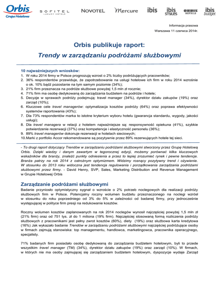 Informacja prasowa Warszawa 11 czerwca 2014r. Orbis publikuje raport: Trendy w zarządzaniu podróżami służbowymi 10 najważniejszych wniosków: 1. W roku 2014 firmy w Polsce prognozują wzrost o 2% liczby podróżujących pracowników; 2. 36% respondentów przewiduje, że zapotrzebowanie na usługi hotelowe ich firm w roku 2014 wzrośnie o ok. 10% bądź pozostanie na tym samym poziomie (34%); 3. 21% firm przeznacza na podróże służbowe powyżej 1,5 mln zł rocznie; 4. 71% firm ma osobę dedykowaną do zarządzania budżetem na podróże i hotele; 5. Decyzje w sprawach podróży podejmują: travel manager (34%), dyrektor działu zakupów (19%) oraz zarząd (10%); 6. Kluczowe cele travel managerów: optymalizacja kosztów podróży (64%) oraz poprawa efektywności systemów raportowania (43%); 7. Dla 73% respondentów marka to istotne kryterium wyboru hotelu (gwarancja standardu, wygody, jakości usługi); 8. Dla travel managera w relacji z hotelem najważniejsze są: responsywność opiekuna (41%), szybkie potwierdzenie rezerwacji (37%) oraz kompetencje i elastyczność personelu (36%); 9. 89% travel managerów dokonuje rezerwacji w hotelach sieciowych; 10. Marki z portfolio Accor rekomendowane są pozytywnie przez 89% rezerwujących hotele tej sieci. - To drugi raport dotyczący Trendów w zarządzaniu podróżami służbowymi stworzony przez Grupę Hotelową Orbis. Dzięki wiedzy i danym zawartym w tegorocznej edycji, możemy porównać kilka kluczowych wskaźników dla branży, znaleźć punkty odniesienia a przez to lepiej zrozumieć rynek i pewne tendencje. Branża patrzy na rok 2014 z ostrożnym optymizmem. Widzimy rosnący pozytywny trend i ożywienie. W stosunku do 2013 roku widoczna jest tendencja regulowania i porządkowania zarządzania podróżami służbowymi przez firmy. - David Henry, SVP, Sales, Marketing Distribution and Revenue Management w Grupie Hotelowej Orbis Zarządzanie podróżami służbowymi Badanie przyniosło optymistyczny sygnał o wzroście o 2% potrzeb noclegowych dla realizacji podróży służbowych firm w Polsce. Potencjalny roczny wolumen budżetu przeznaczonego na noclegi wzrósł w stosunku do roku poprzedniego od 3% do 5% w zależności od badanej firmy, przy jednocześnie występującej w polityce firm presji na redukowanie kosztów. Roczny wolumen kosztów zaplanowanych na rok 2014 noclegów wynosił najczęściej powyżej 1,5 mln zł (21% firm) oraz od 751 tys. zł do 1 miliona (19% firm). Najczęściej stosowaną formą rozliczenia podróży służbowych z pracownikami jest pełny zwrot kosztów (60%), diety (19%) oraz służbowa karta kredytowa (16%) Jak wykazało badanie Trendów w zarządzaniu podróżami służbowymi najczęściej podróżujące osoby w firmach zajmują stanowiska: top managementu, handlowca, marketingowca, pracownika operacyjnego, specjalisty. 71% badanych firm posiadało osobę dedykowaną do zarządzania budżetem hotelowym, byli to przede wszystkim travel manager (TM) (34%), dyrektor działu zakupów (19%) oraz zarząd (10%). W firmach, w których nie ma osoby zajmującej się zarządzaniem budżetem hotelowym, dyspozycje wydaje Zarząd (14%) bądź wyższa kadra zarządzająca (11%). W strukturach firm travel manager jest najczęściej pracownikiem działu zakupów (15%). Polityka podróży służbowych i kluczowe cele travel managerów W 45% badanych firm funkcjonują podstawowe wytyczne dotyczące wybranych elementów podróży służbowych m.in. w zakresie: rezerwacji hotelowych, biletów lotniczych czy raportowania, natomiast 44% ankietowanych podmiotów wykazuje ustrukturyzowaną politykę podróży. Kluczowe cele travel managerów na 2014 rok to: optymalizacja kosztów podróży (64%), poprawa efektywności systemów raportowania (43%) oraz promocja korzyści wynikających z polityki podróży wśród pracowników (36%). Rynkowy trend porównując 2013 i 2014: brak wytycznych/reguły zdrowego rozsądku: w 2013 r. (27%), w 2014 r. (11%) podstawowe wytyczne: w 2013 r. (54%), w 2014 r. (45%) zaawansowana polityka podróży: w 2013 r. (19%), 2014 r. (44%). Tegoroczne badanie wykazało, iż 36% travel managerów przewiduje, że zapotrzebowanie na usługi hotelowe ich firm w roku 2014 wzrośnie o ok. 10% bądź pozostanie na tym samym poziomie (34%). Regularną współpracę z wyspecjalizowanymi firmami zapewniającymi optymalizacje budżetów na podróże służbowe (Travel Management Companies – TMC) potwierdziło 56% badanych firm. Do kluczowych czynników istotnych przy wyborze TMC należy: relacja ceny do jakości usług (37%), kompleksowość (31%) oraz szybkość i efektywność działania (29%). Do zadań wspierających realizowanych przez TMC najczęściej należy rezerwacja biletów lotniczych (56%), hoteli (39%) oraz biletów kolejowych (28%). Wybór hotelu: źródła, kryteria, rezerwacje Największą rolę w pozyskiwaniu informacji o hotelach zarówno dla TM, jak i dla innych osób rezerwujących jest Internet, ze szczególnym wskazaniem na booking platforms, engines, portale opiniotwórcze, organizatorzy podróży biznesowych typu Tripit. travel managerowie- Internet 42%, TMC 41%, hotele 39% inni rezerwujący- Internet 68% doświadczenie (własne, współpracowników, znajomych) 22% Główne kryteria wyboru hotelu podczas organizacji podróży korporacyjnych to odpowiednio lokalizacja (64% TM, 71% inni rezerwujący), cena (58% TM, 66% inni rezerwujący) oraz standard (51% TM, 59% inni rezerwujący). Wśród 73% respondentów marka hotelu jest istotnym czynnikiem warunkującym wybór miejsca noclegu, jest ona gwarantem odpowiedniego standardu, wygody oraz jakości oferowanych usług. Dla TM w relacji z hotelem ważna jest responsywność opiekuna (41%), szybkie potwierdzenie rezerwacji (37%) oraz kompetencje i elastyczność personelu (36%). Podczas organizacji podróży korporacyjnej brane są najczęściej pod uwagę 3 hotele, taką odpowiedź podało odpowiednio: 38% TM, 45% podróżujących man