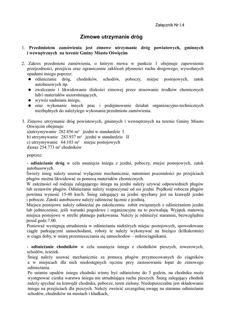 Załącznik Nr I.4 Zimowe utrzymanie dróg 1. Przedmiotem zamówienia jest zimowe utrzymanie dróg powiatowych, gminnych i wewnętrznych na terenie Gminy Miasto Oświęcim 2. Zakres przedmiotu zamówienia, o którym mowa w punkcie 1 obejmuje zapewnienie przejezdności, przejścia oraz ograniczenie zakłóceń płynności ruchu drogowego, wywołanych opadami śniegu poprzez: ● odśnieżanie dróg, chodników, schodów, poboczy, miejsc postojowych, zatok autobusowych itp. ● zwalczanie i likwidowanie śliskości zimowej przez stosowanie środków chemicznych lub/i materiałów uszorstniających, ● wywóz nadmiaru śniegu, ● oraz wykonanie innych prac i podejmowanie działań organizacyjno-technicznych niezbędnych do należytego wykonania przedmiotu zamówienia. 3. Zimowe utrzymanie dróg powiatowych, gminnych i wewnętrznych na terenie Gminy Miasto Oświęcim obejmuje: a)utrzymywanie 282.856 m² jezdni w standardzie I b) utrzymywanie 283.937 m² jezdni w standardzie II c) utrzymywanie 64.103 m² miejsc postojowych d)oraz 254.773 m² chodników poprzez: - odśnieżanie dróg w celu usunięcia śniegu z jezdni, poboczy, miejsc postojowych, zatok autobusowych. Świeży śnieg należy usuwać wyłącznie mechanicznie, natomiast pozostałości po przejściach pługów można likwidować za pomocą materiałów chemicznych. W zależności od rodzaju zalegającego śniegu na jezdni należy używać odpowiednich pługów lub zestawów pługów. Odśnieżanie należy rozpoczynać od osi jezdni. Prędkość robocza pługów powinna wynosić 15-40 km/h. Śnieg zalegający na jezdni spychany jest na krawędź jezdni i pobocze. Zatoki autobusowe należy odśnieżać łącznie z jezdnią. Miejsca postojowe należy odśnieżać po zakończeniu robót związanych z odśnieżaniem jezdni lub jednocześnie, jeśli warunki pogodowe i organizacyjne na to pozwalają. Wyjątek stanowią miejsca postojowe w strefie płatnego parkowania. Należy je odśnieżyć starannie, bezwzględnie przed godz.7.00. Ponieważ występują utrudnienia w odśnieżaniu niektórych miejsc postojowych, spowodowane ciągle parkującymi samochodami, roboty te należy wykonywać na bieżąco (kilkakrotnie) w ciągu doby, w miarę przemieszczania się samochodów – mikrociągnikami, - odśnieżanie chodników w celu usunięcia śniegu z chodników pieszych, rowerowych, schodów, ścieżek. Śnieg należy usuwać mechanicznie za pomocą pługów przymocowanych do ciągników a w miejscach dla nich niedostępnych ręcznie przy zastosowaniu łopat do zimowego odśnieżania. Po ustaniu opadów śniegu chodniki winny być odśnieżone do 5 godzin, na chodniku może występować cienka warstwa śniegu nie utrudniająca ruchu pieszych. Śnieg zalegający chodnik należy spychać na krawędź chodnika, pobocze, teren zielony. Niedopuszczalne jest składowanie śniegu na przejściach dla pieszych. Należy zwrócić szczególną uwagę na staranne odśnieżanie schodów, chodników na mostach i kładkach, - zwalczanie, zapobieganie, likwidowanie śliskości zimowej natychmiast po zaistnieniu takich warunków. Szczególną uwagę należy zwracać na posypywanie schodów. Jezdnie utrzymywane w II standardzie posypywane będą na całej długości, w zależności od panujących warunków, gdy wystąpi gołoledź lodowica itp. Powierzchnia posypywania środkami służącymi do zwalczania śliskości na jezdniach musi obejmować 90 % (0,9) szerokości jezdni. Przejazd jednostki sprzętowej odbywa się środkiem prawego pasa drogowego. Do posypywania jezdni, miejsc postojowych można stosować mieszankę piaskowo-solną lub sól drogową w ilości odpowiednio 300 g/m2 lub 20 g/m2. Przy temperaturach niższych niż -10 °C do mieszanki piaskowo solnej lub soli drogowej należy dodawać chlorku wapnia. Do posypywania chodników należy stosować piasek o uziarnieniu do 2 mm, w ilości 300g/m 2. W szczególnych przypadkach, przy dużych oblodzeniach chodników, można zastosować jednorodną mieszaninę piasku z solą w stosunku proporcjonalnym 70-80 % piasku i 20-30 % soli, - wywóz śniegu w przypadku jego nadmiaru oraz gdy warunki pogodowe wskazują, że nie stopnieje lub brak możliwości dalszego składowania należy go wywozić, po wcześniejszym uzgodnieniu z Zamawiającym, na miejsce wskazane przez Zamawiającego, na terenie miasta Oświęcim. Szczególną uwagę należy zwrócić na płatne miejsca postojowe oraz chodniki na kładkach, mostach. Wykonawca zobowiązany jest także do wykonywania takich robót jak: usuwanie śniegu, likwidowanie śliskości zimowej, usuwanie zalegającej wody (w tym udrażnianie kratek ściekowych) – z chodników, przejść dla pieszych, itp, na bieżąco w czasie zaistnienia takiej potrzeby, - monitorowanie warunków pogodowych, - pełnienie całodobowych dyżurów dyspozytorskich i prowadzenia dokumentacji. Podstawą do zmiany powierzchni, standardów utrzymania jezdni będzie protokół spisany w tej sprawie pomiędzy przedstawicielami Zamawiającego i Wykonawcy. 4. Szczegółowe wykazy dróg z wyszczególnieniem powierzchni: jezdni, miejsc postojowych, chodników (pieszych, rowerowych), standardów utrzymania jezdni, płatnych miejsc postojowych stanowią załączniki Nr I.4a-e. 5. Warunki realizacji i odbioru przedmiotu zamówienia oraz zasady rozliczenia: a) definicje stosowane w zimowym utrzymaniu dróg: Droga - budowla wraz z drogowymi obiektami inżynierskimi, urządzeniami oraz instalacjami, stanowiąca całość techniczno-użytkową, przeznaczona do prowadzenia ruchu drogowego, zlokalizowana w pasie drogowym. Akcja interwencyjna – wykonanie na wymagającej interwencji części dróg czynności zapobiegawczych polegających na jednokrotnym usunięciu śniegu i/lub zapobiegnięciu powstaniu śliskości bądź likwidacji śliskości. Akcja podstawowa - wykonanie na drogach czynności związanych z utrzymaniem przejezdności, przejścia, polegających na usuwaniu śniegu i zwalczaniu śliskośc