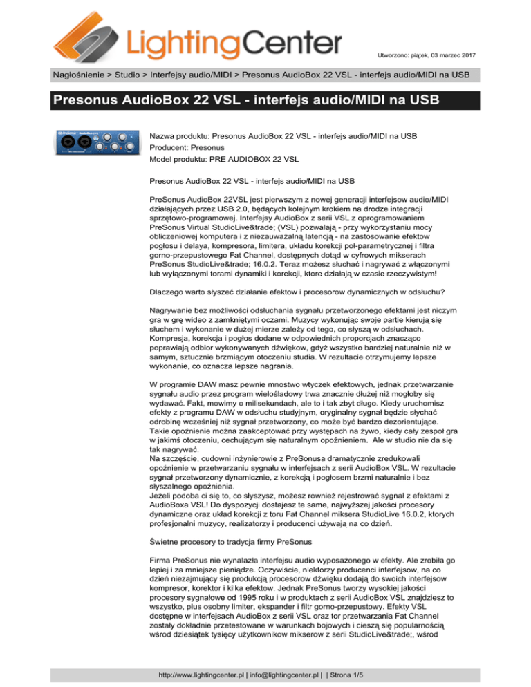 Utworzono: piątek, 03 marzec 2017 Nagłośnienie > Studio > Interfejsy audio/MIDI > Presonus AudioBox 22 VSL - interfejs audio/MIDI na USB Presonus AudioBox 22 VSL - interfejs audio/MIDI na USB Nazwa produktu: Presonus AudioBox 22 VSL - interfejs audio/MIDI na USB Producent: Presonus Model produktu: PRE AUDIOBOX 22 VSL Presonus AudioBox 22 VSL - interfejs audio/MIDI na USB PreSonus AudioBox 22VSL jest pierwszym z nowej generacji interfejsow audio/MIDI działających przez USB 2.0, będących kolejnym krokiem na drodze integracji sprzętowo-programowej. Interfejsy AudioBox z serii VSL z oprogramowaniem PreSonus Virtual StudioLive™ (VSL) pozwalają - przy wykorzystaniu mocy obliczeniowej komputera i z niezauważalną latencją - na zastosowanie efektow pogłosu i delaya, kompresora, limitera, układu korekcji poł-parametrycznej i filtra gorno-przepustowego Fat Channel, dostępnych dotąd w cyfrowych mikserach PreSonus StudioLive™ 16.0.2. Teraz możesz słuchać i nagrywać z włączonymi lub wyłączonymi torami dynamiki i korekcji, ktore działają w czasie rzeczywistym! Dlaczego warto słyszeć działanie efektow i procesorow dynamicznych w odsłuchu? Nagrywanie bez możliwości odsłuchania sygnału przetworzonego efektami jest niczym gra w grę wideo z zamkniętymi oczami. Muzycy wykonując swoje partie kierują się słuchem i wykonanie w dużej mierze zależy od tego, co słyszą w odsłuchach. Kompresja, korekcja i pogłos dodane w odpowiednich proporcjach znacząco poprawiają odbior wykonywanych dźwiękow, gdyż wszystko bardziej naturalnie niż w samym, sztucznie brzmiącym otoczeniu studia. W rezultacie otrzymujemy lepsze wykonanie, co oznacza lepsze nagrania. W programie DAW masz pewnie mnostwo wtyczek efektowych, jednak przetwarzanie sygnału audio przez program wielośladowy trwa znacznie dłużej niż mogłoby się wydawać. Fakt, mowimy o milisekundach, ale to i tak zbyt długo. Kiedy uruchomisz efekty z programu DAW w odsłuchu studyjnym, oryginalny sygnał będzie słychać odrobinę wcześniej niż sygnał przetworzony, co może być bardzo dezorientujące. Takie opoźnienie można zaakceptować przy występach na żywo, kiedy cały zespoł gra w jakimś otoczeniu, cechującym się naturalnym opoźnieniem. Ale w studio nie da się tak nagrywać. Na szczęście, cudowni inżynierowie z PreSonusa dramatycznie zredukowali opoźnienie w przetwarzaniu sygnału w interfejsach z serii AudioBox VSL. W rezultacie sygnał przetworzony dynamicznie, z korekcją i pogłosem brzmi naturalnie i bez słyszalnego opoźnienia. Jeżeli podoba ci się to, co słyszysz, możesz rownież rejestrować sygnał z efektami z AudioBoxa VSL! Do dyspozycji dostajesz te same, najwyższej jakości procesory dynamiczne oraz układ korekcji z toru Fat Channel miksera StudioLive 16.0.2, ktorych profesjonalni muzycy, realizatorzy i producenci używają na co dzień. Świetne procesory to tradycja firmy PreSonus Firma PreSonus nie wynalazła interfejsu audio wyposażonego w efekty. Ale zrobiła go lepiej i za mniejsze pieniądze. Oczywiście, niektorzy producenci interfejsow, na co dzień niezajmujący się produkcją procesorow dźwięku dodają do swoich interfejsow kompresor, korektor i kilka efektow. Jednak PreSonus tworzy wysokiej jakości procesory sygnałowe od 1995 roku i w produktach z serii AudioBox VSL znajdziesz to wszystko, plus osobny limiter, ekspander i filtr gorno-przepustowy. Efekty VSL dostępne w interfejsach AudioBox z serii VSL oraz tor przetwarzania Fat Channel zostały dokładnie przetestowane w warunkach bojowych i cieszą się popularnością wśrod dziesiątek tysięcy użytkownikow mikserow z serii StudioLive™, wśrod http://www.lightingcenter.pl | [email protected] | | Strona 1/5 Utworzono: piątek, 03 marzec 2017 Nagłośnienie > Studio > Interfejsy audio/MIDI > Presonus AudioBox 22 VSL - interfejs audio/MIDI na USB Presonus AudioBox 22 VSL - interfejs audio/MIDI na USB ktorych jest wielu znanych profesjonalistow. Ogromne znaczenie ma też to, że sygnał można przetwarzać, a także tworzyć i ładować ustawienia, korzystając z dostępnej w VSL, wygodnej funkcji „przeciągnij i upuść”. Profesjonalne przetwarzanie sygnału i jakże prosta obsługa oznaczają lepsze rezultaty i dużo lepszą zabawę! Przenośny, wytrzymały interfejs i najwyższa jakość brzmienia Zasilany przez USB, kompaktowy i solidny interfejs AudioBox 22VSL posiada dwa poręczne, ulokowane na panelu przednim wejścia mikrofonowo-instrumentalne typu combo z zasilaniem fantomowym, oraz dwa wyjścia liniowe. Wyposażony jest w te same, dynamiczne przedwzmacniacze XMAX™ klasy A, ktore znajdują się w mikserach StudioLive i dzięki konwerterom 24-bit/96 kHz o zakresie dynamiki 114 dB zapewnia czyste, transparentne brzmienie. Interfejs wyposażono też w słynne, wyjątkowo głośnie (120 mW) wyjście słuchawkowe znane z wielu produktow PreSonusa. (Uważaj z poziomem głośności!) AudioBox 22VSL jest wyjątkowo wytrzymały - to nie przechwałki. Posiada tę samą, solidną stalową obudowę, co oryginalny AudioBox USB - urządzenie, ktore przeszło słynny test upuszczania na ziemię, kopania, przejeżdżania po nim samochodem zanim użyto go do, jakże udanych nagrań. Właśnie to znaczą słowa “wytrzymały i przenośny” w wydaniu PreSonusa. Ten potężny maluch mieści się w jednej trzeciej skrzyni rack i można go umocować w standardowym uchwycie racka (nie ma go w zestawie). Funkcjonalność i potęga oprogramowania System VSL pozwala w prosty sposob zarządzać procesami miksu z poziomu komputerow MacŽ lub PC z WindowsŽ i zapewnia funkcje edycji i zapisywania ustawień, dzięki czemu bardzo łatwo można tworzyć i korzystać z biblioteki presetow. Na dobry początek otrzymujesz ten sam zestaw ponad 50 presetow Fat Channel, ktore są dostarczane razem z mikserami StudioLive. Ustawienia te zostały stworzone przez profesjonalnych muzykow i inżynierow dźwięku i pozwalają 