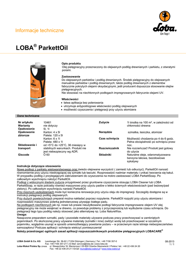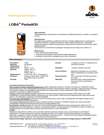 Informacje techniczne LOBA® ParkettOil Opis produktu Olej pielęgnacyjny przeznaczony do olejwanych podłóg drewnianych i parkietu, z otwratymi porami. Zastosowanie Do olejowanych parkietów i podłóg drewnianych. Środek pielęgnacyjny do olejowanych manualnie parkietów i podłóg drewnianych; także podłóg drewnianych z elementów fabrycznie pokrytych olejami oksydacyjnymi, jeśli producent dopuszcza stosowanie olejów pielęgnacyjnych. Nie stosować na niechłonnych podłogach impregnowanych fabrycznie olejami UV. Właściwości łatwa aplikacja bez polerowania utrzymuje antypoślizgowe właściwości podłóg olejowanych możliwość czyszczenia i pielęgnacji przy użyciu atomizera Dane techniczne Nr artykułu Warianty Opakowanie Opakowanie zbiorcze Składowanie i transport Giscode 10461 nie dotyczy 5l, 1l Karton: 4 x 5l Paleta: 120 x 5l Karton: 6 x 1l Paleta: 480 x 1l od +5°C do +25°C, 36 miesięcy w stabilnych warunkach. Produkt nie jest niebezpieczny wg ADR. Ö 60 Zużycie 1l środka na 100 m², w zależności od chłonności drewna Narzędzie szmatka, łasiczka, atomizer Czas schnięcia Możliwość chodzenia po 4 do 6 godz. Pełna obciążalność po schnięciu przez noc. Nie rozcieńczać! Produkt jest gotowy do użycia Naturalne oleje, odaromatyzowana benzyna lakowa, bezołowiowe sykatywy Rozcieńczalnik Składniki Instrukcje dotyczące stosowania Nowe podłogi z parkietu wielowarstwowego oraz świeżo olejowane wyczyścić ( zamieść lub odkurzyć). ParkettOil nanosić równomiernie przy użyciu niestrzępiącej się szmatki lub łasiczki. Rozprowadzić nadmiar materiału i unikać tworzenia się kałuż. W przypadku podłóg z przylegającymi zabrudzeniami do czyszczenia na mokro zastosować LOBA ParkettSoap. Po całkowitym wyschnięciu nałożyć ParkettOil. Podłogi z widocznymi śladami zużycia przygotować przez gruntowne czyszczenie stosując LOBA Cleaner lub LOBA ParkettSoap, w razie potrzeby również maszynowo przy użyciu padów o lekko ściernych właściwościach (pad beżowy/pad zielony). Po całkowitym wyschnięciu nanieść ParkettOil. Przy mocnych uszkodzeniach może być konieczna renowacja przy użyciu oleju do impregnacji. Szczegóły dostępne są w instrukcji pielęgnacji podłóg olejowanych. Przy dużych powierzchniach preparat można nakładać poprzez rozpylenie. ParkettOil rozpylić przy użyciu atomizera i rozprowadzić maszynowo polerką jednotarczową używając białego padu. Na podłogach niechłonnych jak np. nowe lub prawie nieużytkowane podłogi fabrycznie impregnowane olejem UV olej pielęgnacyjny nie może wsiąknać w drewno, co powoduje problemy z przyczepnością lub wydłużenie czasu schnięcia. Do pielęgnacji tego typu podłóg należy stosować jako alternatywę np. Loba NatureWax. Uwaga: Nasączone preparatem szmatki, pady i pozostałe materiały używane podczas pracy przechowywać w zamkniętych pojemnikach. Po skończonej pracy używane materiały (szmatki i inne) zwilżyć wodą lub przechowywać w szczelnym pojemniku, względnie usunąć w sposób uniemożliwiający powstanie pożaru – w przeciwnym razie istnieje niebezpieczeństwo samozapłonu! Podczas aplikacji i schnięcia wietrzyć pomieszczenia! ® Należy przestrzegać ogólnych zasad aplikacji rozpuszczalnikowych produktów pielęgnacyjnych LOBACARE LOBA GmbH & Co. KG Leonberger Str. 56-62 | 71254 Ditzingen | Germany | Tel.: +49 7156 357-0 Fax: +49 7156 357-211 | E-Mail: [email protected] | www.loba.de Loba-Wakol Polska Sp. z o.o. ul. Sławęcińska 16, Macierzysz I 05-850 Ożarów Mazowiecki I Polska I tel.: +48 22 436 24 20 Fax: +48 22 436 24 21 I Email: [email protected] I www.loba-wakol.pl 08-2013 1/1