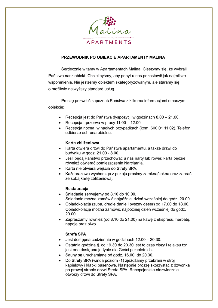 PRZEWODNIK PO OBIEKCIE APARTAMENTY MALINA Serdecznie witamy w Apartamentach Malina. Cieszymy się, że wybrali Państwo nasz obiekt. Chcielibyśmy, aby pobyt u nas pozostawił jak najmilsze wspomnienia. Nie jesteśmy obiektem skategoryzowanym, ale staramy się o możliwie najwyższy standard usług. Proszę pozwolić zapoznać Państwa z kilkoma informacjami o naszym obiekcie: Recepcja jest do Państwa dyspozycji w godzinach 8.00 – 21.00. Recepcja - przerwa w pracy 11.00 – 12.00 Recepcja nocna, w nagłych przypadkach (kom. 600 01 11 02). Telefon odbierze ochrona obiektu. Karta zbliżeniowa Karta otwiera drzwi do Państwa apartamentu, a także drzwi do budynku w godz. 21.00 - 8.00. Jeśli będą Państwo przechować u nas narty lub rower, karta będzie również otwierać pomieszczenie Narciarnia. Karta nie otwiera wejścia do Strefy SPA. Każdorazowo wychodząc z pokoju prosimy zamknąć okna oraz zabrać ze sobą kartę zbliżeniową. Restauracja Śniadanie serwujemy od 8.10 do 10.00. Śniadanie można zamówić najpóźniej dzień wcześniej do godz. 20.00 Obiadokolacja (zupa, drugie danie i pyszny deser) od 17.00 do 18.00. Obiadokolację można zamówić najpóźniej dzień wcześniej do godz. 20.00 Zapraszamy również (od 8.10 do 21.00) na kawę z ekspresu, herbatę, napoje oraz piwo. Strefa SPA Jest dostępna codziennie w godzinach 12.00 – 20.30. Ostatnia godzina tj. od 19.30 do 20.30 jest to czas ciszy i relaksu tzn. jest ona dostępna jedynie dla Gości pełnoletnich. Sauny są uruchamiane od godz. 16.00. do 20.30. Do Strefy SPA (winda poziom -1) zjeżdżamy przebrani w strój kąpielowy i klapki basenowe. Następnie proszę skorzystać z dzwonka po prawej stronie drzwi Strefa SPA. Recepcjonista niezwłocznie otworzy drzwi do Strefy SPA. Po wejściu do Strefy SPA czeka na Państwa czysty ręcznik. Przed skorzystaniem z basenu, należy wziąć prysznic. Temperatura wody w basenie i brodziku jest sterowana komputerowo i wynosi 30 C Wi-Fi – hasło: 12345678 Książki i gazety znajdujące się przy windzie (poziom 0) można wypożyczyć do apartamentu lub poczytać w Restauracji. Sprzątanie Począwszy od drugiej doby po przyjeździe, Pokojowa będzie Państwa odwiedzać (w godz. 11.00 – 14.00) co drugi dzień, aby wynieść śmieci, uzupełnić papier toaletowy oraz odkurzyć podłogę. Informujemy, że nie ścielimy łóżek. Dodatkowy papier toaletowy oraz worki na śmieci są dostępne w szafce przy windzie (poziom 0). Na korytarzach są zostawione odkurzacze. Można z nich skorzystać. Pobyt tygodniowy (np. sobota-sobota) – cena zawiera wymianę ręczników na czyste w połowie pobytu. Pobyt dłuższy niż tydzień – cena zawiera wymianę ręczników (co 4 dni) oraz wymianę pościeli i sprzątanie (po 7 dniach). Recepcja uzgadnia z gościem dogodny termin, aby nie zakłócać urlopu. Dodatkowa wymiana ręczników – cena 10 zł komplet. Dodatkowa wymiana pościeli – 20 zł komplet. Użytkowanie klimatyzacji Klimatyzacja może być użytkowana jedynie przy zamkniętych oknach i w obecności Gościa w apartamencie. Pod żadnym pozorem nie wolno zostawiać włączonej klimatyzacji po wyjściu z apartamentu. Doba hotelowa rozpoczyna się o godz. 15:00, a kończy o godz. 11:00 Prosimy o zarezerwowanie 5 min. podczas wyjazdu na odebranie apartamentu przez Recepcję. Zakaz palenia W całym budynku, jak również na balkonach, obowiązuje zakaz palenia. Palarnia znajduje się na zewnątrz budynku przy filarach restauracji.