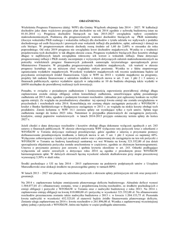 OBJAŚNIENIA Wieloletnia Prognoza Finansowa (dalej: WPF) dla Gminy Więcbork obejmuje lata 2014 – 2027. W kalkulacji dochodów jako dane wyjściowe przyjęto plan dochodów na rok 2014 zgodnie z uchwałą budżetową (stan na 01.01.2014 r.). Prognoza dochodów bieżących na lata 2015-2027 uwzględnia wpływ czynników makroekonomicznych. Podstawą dla prognozowanych wartości dochodów bieżących są: PKB nominalny (iloczyn wskaźnika PKB realnego i wskaźnika inflacji) dla dochodów z tytułu udziału we wpływach z podatku dochodowego od osób fizycznych i prawnych oraz wskaźnik inflacji dla podatków, opłat, subwencji i dotacji na cele bieżące. W prognozowanym okresie dochody rosną średnio od 1,60 do 2,60% w stosunku do roku poprzedniego. Od roku 2019 prognoza nie uwzględnia kwot dochodów majątkowych. Wynika to z trudności projektowania tych dochodów w tak długim okresie czasu. Prognoza wydatków bieżących (bez kosztów obsługi długu) w najbliższych latach uwzględnia rokroczny ich wzrost o wskaźnik inflacji. Dane dotyczące prognozowanej inflacji i PKB zostały zaczerpnięte z wytycznych dotyczących założeń makroekonomicznych na potrzeby wieloletnich prognoz finansowych jednostek samorządu terytorialnego sporządzonych przez Ministerstwo Finansów. W przypadku prognozowanych wydatków majątkowych, ich wartość w okresie prognozy kształtuje się na niższym choć względnie stałym poziomie. Wynika to z faktu stopniowego ograniczania wydatków majątkowych. Wysokość wydatków majątkowych rok rocznie uzależniana będzie od pozyskania zewnętrznych źródeł finansowania. Ujęte w WPF na 2014 r. wydatki majątkowe na programy, projekty lub zadania finansowane z udziałem środków o których mowa w art. 5 ust. 1 pkt 2 i 3 ustawy o finansach publicznych, oprócz wydatków ujętych w załączniku nr 10 do budżetu obejmują także wydatki w §6050 niezbędne do prawidłowej realizacji tych inwestycji. Ponadto, w związku z posiadanym zadłużeniem i koniecznością zapewnienia prawidłowej obsługi długu zaplanowana została emisja obligacji celem konsolidacji zadłużenia, umożliwiająca spłatę posiadanego zadłużenia od 2015 roku, zgodnie z podanymi kwotami rozchodów. (aktualnie jest ogłoszony konkurs na wybór agenta emisji). Ze względu na pozabudżetowy charakter tej operacji kwota emisji nie została uwzględniona w przychodach i rozchodach roku 2014. Konsolidacją nie zostaną objęte zaciągnięte pożyczki z WFOŚiGW i kredyt z Banku Spółdzielczego w Bydgoszczy zaciągnięty w 2013 r. ze względu na niskie koszty obsługi tych produktów. Zatem kolumna w WPF 14.1 zawiera spłaty rat wynikające tylko z tych umów. Spłata tego zadłużenia nastąpi do końca 2023 roku. Natomiast w przypadku planowanych do zaciągnięcia pożyczek, kredytów, emisji papierów wartościowych w latach 2014-2015 przyjęto ostateczny termin spłaty do końca 2027 r. Jeżeli chodzi o dane dotyczące rozchodów i kosztów obsługi długu dokonano wyłączeń zgodnych z art. 243 ustawy o finansach publicznych. W okresie obowiązywania WPF wyłączono raty pożyczek wraz z odsetkami z WFOŚiGW w Toruniu dotyczące realizacji przedsięwzięć, gdzie zgodnie z umową o przyznanie pomocy dofinansowanie przedsięwzięcia środkami, o których mowa w art. 5 ust. 1 pkt 2 wynosi co najmniej 60%. Wyłączono zobowiązania z tytułu już zawartych umów oraz z planowanej do zaciągnięcia na ten rok pożyczki z WFOŚiGW w Toruniu na budowę kanalizacji sanitarnej we wsi Witunia na kwotę 321.552,00 zł (na dzień sporządzenia objaśnienia pożyczka została uruchomiona w częściowo, zgodnie ze złożonym harmonogramem). Umowa o przyznanie pomocy jest zawarta i spełnia kryteria określone w art. 243. Odsetki podlegające wyłączeniu od umów zawartych a dotyczące roku 2014 są zgodne z przesłanym przez WFOŚiGW harmonogramem spłat. W dalszych okresach łączną wysokość odsetek skalkulowano przy stopie procentowej wynoszącej 3,50% w skali roku. Środki pochodzące z UE na lata 2014 – 2015 zaplanowano na podstawie podpisanych umów z Urzędem Marszałkowski oraz alokacji środków na poszczególne gminy w ramach RPO. W latach 2013 – 2027 nie planuje się udzielania pożyczek z okresem spłaty późniejszym niż rok oraz poręczeń i gwarancji. Na 2014 r. zaplanowano kolejne zmniejszenie planowanego deficytu budżetowego. Aktualnie deficyt wynosi 1.584.077,01 zł i sfinansowany zostanie, wraz z projektowaną kwotą rozchodów, ze środków pochodzących z emisji obligacji i pożyczki z WFOŚiGW w Toruniu oraz z nadwyżki budżetowej z roku 2013. Na 2014 r. zaplanowano emisję obligacji na kwotę 810.000,00 zł i pożyczkę w wysokości 321.552,00 zł. Na sfinansowanie rozchodów przeznaczona zostanie także nadwyżka budżetowa z 2013 r. w kwocie 1.204.153,75 zł. Pozostała kwota nadwyżki w wysokości 452.525,01 zł stanowić będzie źródło finansowania planowanego deficytu. Zmianie ulega zaplanowana na 2014 r. kwota rozchodów o 261.896,00 zł. Wynika z zaplanowanej wcześniejszej spłaty jednej z pożyczek z WFOŚiGW, która nie będzie w części podlegała umorzeniu. Również na 2015 r. zaplanowano deficyt budżetowy w wysokości 665.358,24 zł, który sfinansowany zostanie, wraz z projektowaną kwotą rozchodów, ze środków kredytowych w łącznej wysokości 1.335.840,00 zł. Nadwyżki budżetowe od 2016 r. przeznacza się na finansowanie rozchodów, tj. na spłatę kredytów, pożyczek oraz wykup wyemitowanych obligacji w taki sposób, iż nadwyżka finansuje rozchody roku budżetowego w którym została zaplanowana. Do wyliczenia kwoty długu przyjęto przewidywaną kwotę długu na koniec 2013 r. w wysokości 18.515.941,98 zł. Wieloletnia Prognoza Finansowa nie przewiduje umorzeń pożyczek z WFOŚiGW. Prognozuje się całkowitą spłatę długu do 2027 roku natomiast planowana nadwyżka budżetowa od 2016 r. zgodnie z wyjaśnieniem przedstawio