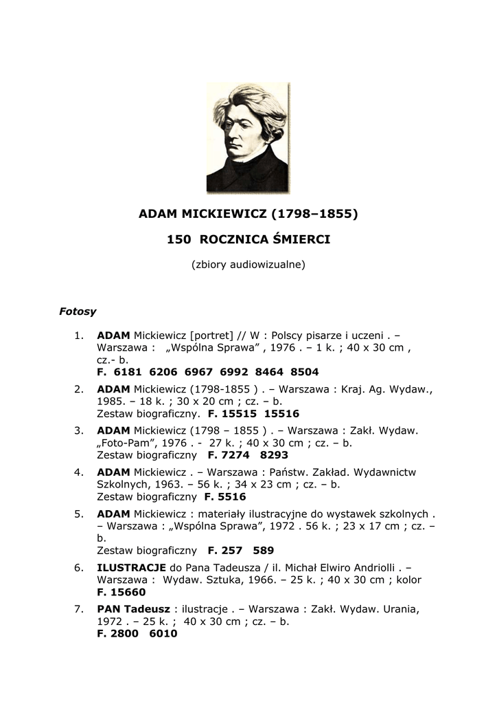 ADAM MICKIEWICZ (1798–1855) 150 ROCZNICA ŚMIERCI (zbiory audiowizualne) Fotosy 1. ADAM Mickiewicz [portret] // W : Polscy pisarze i uczeni . – Warszawa : „Wspólna Sprawa” , 1976 . – 1 k. ; 40 x 30 cm , cz.- b. F. 6181 6206 6967 6992 8464 8504 2. ADAM Mickiewicz (1798-1855 ) . – Warszawa : Kraj. Ag. Wydaw., 1985. – 18 k. ; 30 x 20 cm ; cz. – b. Zestaw biograficzny. F. 15515 15516 3. ADAM Mickiewicz (1798 – 1855 ) . – Warszawa : Zakł. Wydaw. „Foto-Pam”, 1976 . - 27 k. ; 40 x 30 cm ; cz. – b. Zestaw biograficzny F. 7274 8293 4. ADAM Mickiewicz . – Warszawa : Państw. Zakład. Wydawnictw Szkolnych, 1963. – 56 k. ; 34 x 23 cm ; cz. – b. Zestaw biograficzny F. 5516 5. ADAM Mickiewicz : materiały ilustracyjne do wystawek szkolnych . – Warszawa : „Wspólna Sprawa”, 1972 . 56 k. ; 23 x 17 cm ; cz. – b. Zestaw biograficzny F. 257 589 6. ILUSTRACJE do Pana Tadeusza / il. Michał Elwiro Andriolli . – Warszawa : Wydaw. Sztuka, 1966. – 25 k. ; 40 x 30 cm ; kolor F. 15660 7. PAN Tadeusz : ilustracje . – Warszawa : Zakł. Wydaw. Urania, 1972 . – 25 k. ; 40 x 30 cm ; cz. – b. F. 2800 6010 8. PAN Tadeusz : ilustracje wybranych fragmentów / il. Marcin Szancer . – Warszawa : Biuro Wydaw. Ruch, 1971 .- 12 k. ; 15 x 10 cm ; kolor F. 6923 6935 Taśmy kasetowe 9. ARCYDRAMAT / oprac. Hanna Zawiślak . – Warszawa : Polskie Radio ; [Nagr. własne, 1990] . – 1 kas. dźw. (30 min) Tematem audycji są Dziady, Adama Mickiewicza. Geneza powstania utworu oraz znaczenie w literaturze. TMK. 5569 5803 5860 5926 10. BAJKI / Adam Mickiewicz ; czyta Andrzej Łapicki . – Warszawa : Polskie Nagrania, 1987 . – 1 kas. dźw. (15 min) Tytuły bajek : 1. Przyjaciele. 2. Golono, strzyżono. 3. Koza, kózka i wilk. 4. Pies i wilk TMK. 5451 11. BALLADY / Adam Mickiewicz ; rec. Danuta Michałowska, Ignacy Gogolewski . – Warszawa : Polskie Nagrania, 1985 . – 1 kas. dźw. (40 min) Tytuły utworów : 1. Alpuhara. 2. Świtezianka. 3. Powrót taty. 4. Pani Twardowska. 5. Romantyczność. 6. Czaty, 7. Lilie TMK. 5065 5066 12. BALLADY i romanse / Adam Mickiewicz; rec. Grażyna Barszczewska, Henryk Talar, Jerzy Bończak [i in.] . – Warszawa : Dydakta, 1994 . – 1 kas. dźw. (30 min) Tytuły utworów : 1. Romantyczność : fragm. 2. Lilie : fragm. 3. Świtezianka : fragm. 4. Pani Twardowska TMK. 4273 6345 13. BOHATER w utworach Adama Mickiewicza /Adam Mickiewicz : scen. Barbara Kuligowska ;rec. : Jerzy Bończak, Henryk Talar, Marek Kondrat [i in.] . – Warszawa : Dydakta, 1994 . – 1 kas. dźw. (30 min) Analiza tematu na podstawie utworów : Do M... : fragm, Konrad Wallenrod : fragm, Pan Tadeusz : fragm. TMK. 6347 14. BRĄZOWNICY / aut. Ewa Prządka . – Warszawa : Polskie Radio ; [Nagr. własne, 1991] . – 1 kas. dźw. (30 min) W audycji zawarte są krytyczne spojrzenia na sylwetkę Adama Mickiewicza, m. in. potyczki literackie Tadeusza Boya-Żeleńskiego. TMK. 5733 15. DZIADY – część III (fragm.) / Adam Mickiewicz ; reż. Marek Kulesza . – Warszawa : Polskie Radio, 1987 ; [nagr. własne, 1993 ] . – 1 kas. dźw. (30 min) TMK. 5332 5905 16. DZIADY – część. III: opracowanie / scen. Andrzej Kordela ; muz. Andrzej Masłowski – Warszawa : Studio Paspartu, 1992 . – 1 kas. dźw. (43 min) Plan opracowania : 1. Życie i twórczość Adama Mickiewicza. 2. Streszczenie utworu i główne problemy. TMK. 6323 6324 6339 6340 17. DZIAŁALNOŚĆ publicystyczna Adama Mickiewicza / scen. Maria Ballod . – Warszawa : Polskie Radio, 1981 ; [ nagr. własne, 1994] . – 1 kas. dźw. (15 min) TMK. 6273 18. GRAŻYNA / Adam Mickiewicz ; czyta Krzysztof Kolberger . – Warszawa : Zakł. Wydaw. i nagr. PZN, 1986 . – 1 kas. dźw. (45 min) TMK. 5255 5257 19. JA TYLKO jedną wiosnę miałem w życiu / scen. Lidia Wojtasik . – Polskie Radio, 1984 ; [nagr. własne, 1994] . – 1 kas. dźw. (30 min) Elementy historii w Panu Tadeuszu. Stosunek Adama Mickiewicza do historii. TMK. 6220 20. KONRAD Wallenrod / Adam Mickiewicz ; czyta Gustaw Holoubek . – Warszawa : Zakł. Wydaw. I Nagr. PZN, 1985. – 3 kas. dźw. (3 x 50 min) TMK. 5158/I-III 5161/I-III 21. KONRAD Wallenrod bohater romantyczny /Adam Mickiewicz ; scen. Maria Grabowska . – Warszawa : Polskie Radio, 1982 ; [nagr. własne, 1993] . – 1 kas. dźw. (15 min) Omówienie wartości utworu. TMK. 5967 22. MICKIEWICZ w oczach współczesnych / scen. Maria Ballod . – Warszawa : Polskie Radio, 1985 ; [nagr. własne, 1995] . – 1 kas. dźw.(15 min) Ocena klasyków romantyzmu. Sądy o poecie i jego twórczości wypowiadane w okresie klasycyzmu. TMK. 6357 23. MONOLOGI romantyczne / Adam Mickiewicz ; oprac. Barbara Kuligowska ; wyk. : Jerzy Zelnik, Marek Kondrat, Olgierd Łukaszewicz [i in]. – Warszawa : Dydakta, 1994 . – 1 kas. dźw. (15 min) Tytuły utwów : 1. Dziady : cz. III (fragmenty) : Wielka Improwizacja, Widzenie księdza Piotra. TMK. 6344 24. NAD Świtezią i Wilejką / Adam Mickiewicz :oprac. Zbigniew Kopalka . – Warszawa : Polskie Radio, 1984 ; [nagr. własne, 1989] . – 1 kas. dźw. (20 min) Słuchowisko poetyckie do utworów A. Mickiewicza : Świteź, Pan Tadeusz – fragm. poematu : opowiadanie Wojskiego. TMK. 5538 25. OPOWIADANIE w Panu Tadeuszu / Adam Mickiewicz ; oprac. Maria Ballod . – Warszawa : Polskie Radio, 1979 ; [nagr. własne, 1994] . – 1 kas. dźw. (15 min) Elementy narracji jako forma wypowiedzi. W audycji wykorzystano, jako przykład fragm. opowieści Gerwazego o śmierci Stolnika oraz opowiadanie Dowejki i Domejki. TMK. 6273 26. PAN Adam opowiada / Adam Mickiewicz ; oprac. Elżbieta Hartwig . – Warszawa : Polskie Radio, 1983 ; [nagr. własne, 1993] . – 1 kas. dźw. (25 min) Słuchacz poznaje A. Mickiewicza jako autora wspaniałych, plastycznych opisów oraz człowieka o dużym poczuciu humoru. W audycji wykorzystano fragmenty : Pana Tadeusza, bajek i ballad. TMK. 6084 27. PAN Tadeusz / Adam Mickiewicz ; czyta Krzysztof Kolberger . – Warszawa : Zakł. Wydaw.i Nagr. PZN,1978 . 12 kas. 