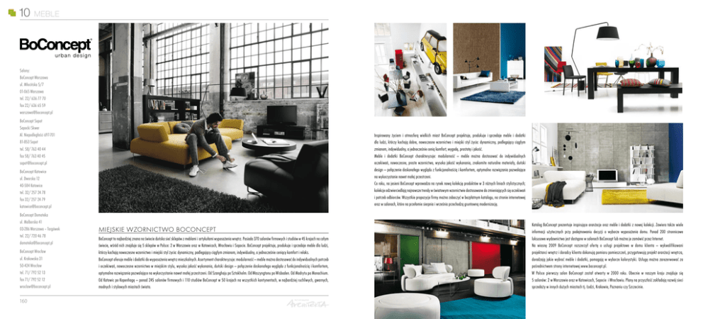 10 meble Salony: BoConcept Warszawa ul. Młocińska 5/7 01-065 Warszawa tel. 22/ 636 77 70 fax 22/ 636 65 59 [email protected] BoConcept Sopot Sopocki Skwer Al. Niepodległości 697-701 81-853 Sopot tel. 58/ 763 40 44 fax 58/ 763 40 45 [email protected] Inspirowany życiem i atmosferą wielkich miast BoConcept projektuje, produkuje i sprzedaje meble i dodatki dla ludzi, którzy kochają dobre, nowoczesne wzornictwo i miejski styl życia: dynamiczny, podlegający ciągłym zmianom, indywidualny, a jednocześnie cenią komfort, wygodę, prostotę i jakość. Meble i dodatki BoConcept charakteryzuje: modularność — meble można dostosować do indywidualnych oczekiwań, nowoczesne, proste wzornictwo, wysoka jakość wykonania, znakomite naturalne materiały, duński design — połączenie doskonałego wyglądu z funkcjonalnością i komfortem, optymalne rozwiązania pozwalające na wykorzystanie nawet małej przestrzeni. Co roku, na jesieni BoConcept wprowadza na rynek nową kolekcję produktów w 3 różnych liniach stylistycznych; kolekcje odzwierciedlają najnowsze trendy w światowym wzornictwie dostosowane do zmieniających się oczekiwań i potrzeb odbiorców. Wszystkie propozycje firmy można zobaczyć w bezpłatnym katalogu, na stronie internetowej oraz w salonach, które na przełomie sierpnia i września przechodzą gruntowną modernizację. BoConcept Katowice ul. Dworska 12 40-584 Katowice tel. 32/ 257 24 78 fax 32/ 257 24 79 [email protected] BoConcept Domoteka ul. Malborska 41 03-286 Warszawa – Targówek tel. 22/ 720 46 78 [email protected] BoConcept Wrocław ul. Krakowska 31 50-424 Wrocław tel. 71/ 792 52 13 fax 71/ 792 52 12 [email protected] 160 160 Miejskie wzornictwo BoConcept BoConcept to najbardziej znana na świecie duńska sieć sklepów z meblami i artykułami wyposażenia wnętrz. Posiada 370 salonów firmowych i studiów w 45 krajach na całym świecie, wśród nich znajduje się 5 sklepów w Polsce: 2 w Warszawie oraz w Katowicach, Wrocławiu i Sopocie. BoConcept projektuje, produkuje i sprzedaje meble dla ludzi, którzy kochają nowoczesne wzornictwo i miejski styl życia: dynamiczny, podlegający ciągłym zmianom, indywidualny, a jednocześnie ceniący komfort i relaks. BoConcept oferuje meble i dodatki do wyposażenia wnętrz mieszkalnych. Asortyment charakteryzuje: modularność — meble można dostosować do indywidualnych potrzeb i oczekiwań, nowoczesne wzornictwo w miejskim stylu, wysoka jakość wykonania, duński design — połączenie doskonałego wyglądu z funkcjonalnością i komfortem, optymalne rozwiązania pozwalające na wykorzystanie nawet małej przestrzeni. Od Szanghaju po Sztokholm. Od Waszyngtonu po Wisbaden. Od Madrytu po Monachium. Od Katowic po Kopenhagę — ponad 245 salonów firmowych i 110 studiów BoConcept w 50 krajach na wszystkich kontynentach, w najbardziej ruchliwych, gwarnych, modnych i stylowych miastach świata. Katalog BoConcept prezentuje inspirujące aranżacje oraz meble i dodatki z nowej kolekcji. Zawiera także wiele informacji użytecznych przy podejmowaniu decyzji o wyborze wyposażenia domu. Ponad 200 stronnicowe luksusowe wydawnictwo jest dostępne w salonach BoConcept lub można je zamówić przez Internet. Na wiosnę 2009 BoConcept rozszerzył ofertę o usługi projektowe w domu klienta — wykwalifikowani projektanci wnętrz i doradcy klienta dokonują pomiaru pomieszczeń, przygotowują projekt aranżacji wnętrza, doradzają jakie wybrać meble i dodatki, pomagają w wyborze kolorystyki. Usługę można zarezerwować za pośrednictwem strony internetowej www.boconcept.pl. W Polsce pierwszy salon BoConcept został otwarty w 2000 roku. Obecnie w naszym kraju znajduje się 5 salonów: 2 w Warszawie oraz w Katowicach, Sopocie i Wrocławiu. Plany na przyszłość zakładają rozwój sieci sprzedaży w innych dużych miastach tj. Łodzi, Krakowie, Poznaniu czy Szczecinie.