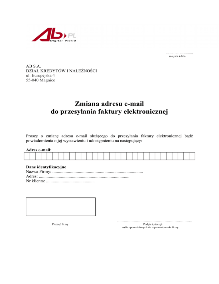 ………………………. miejsce i data AB S.A. DZIAŁ KREDYTÓW I NALEŻNOŚCI ul. Europejska 4 55-040 Magnice Zmiana adresu e-mail do przesyłania faktury elektronicznej Proszę o zmianę adresu e-mail służącego do przesyłania faktury elektronicznej bądź powiadomienia o jej wystawieniu i udostępnieniu na następujący: Adres e-mail: Dane identyfikacyjne Nazwa Firmy: .................................................................................. Adres: .................................................................................. Nr klienta: ............................................ ………………………………………………………….. Pieczęć firmy Podpis i pieczęć osób upoważnionych do reprezentowania firmy