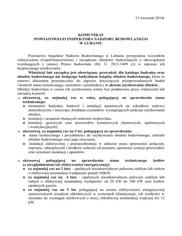 12 wrzesień 2014r KOMUNIKAT POWIATOWEGO INSPEKTORA NADZORU BUDOWLANEGO W LUBANIU Powiatowy Inspektor Nadzoru Budowlanego w Lubaniu przypomina wszystkim właścicielom (współwłaścicielom) i zarządcom obiektów budowlanych o obowiązkach wynikających z ustawy Prawo budowlane (Dz. U. 2013.1409 j.t) w zakresie ich bezpiecznego użytkowania. Właściciel lub zarządca jest obowiązany prowadzić dla każdego budynku oraz obiektu budowlanego nie bedącego budynkiem książkę obiektu budowlanego, która to stanowi dokument przeznaczony do zapisów dotyczących przeprowadzanych badań i kontroli stanu technicznego, remontów i przebudowy w okresie użytkowania obiektu. Obiekty budowlane w czasie ich użytkowania winny być poddawane przez właściciela lub zarządcę kontroli: okresowej, co najmniej raz w roku, polegającej na sprawdzeniu stanu technicznego: elementów budynku, budowli i instalacji narażonych na szkodliwe wpływy atmosferyczne i niszczące działania czynników występujących podczas użytkowania obiektu, instalacji i urządzeń służących ochronie środowiska, instalacji gazowych oraz przewodów kominowych (dymowych, spalinowych i wentylacyjnych); okresowej, co najmniej raz na 5 lat, polegającej na sprawdzeniu: stanu technicznego i przydatności do użytkowania obiektu budowlanego, estetyki obiektu budowlanego oraz jego otoczenia; instalacji elektrycznej i piorunochronnej w zakresie stanu sprawności połączeń, osprzętu, zabezpieczeń i środków ochrony od porażeń, oporności izolacji przewodów oraz uziemień instalacji i aparatów; okresowej polegającej na sprawdzeniu stanu technicznego kotłów (z uwzględnieniem ich efektywności energetycznej): co najmniej raz na 2 lata – opalanych nieodnawialnym paliwem ciekłym lub stałym o efektywnej nominalnej wydajności ponad 100kW, co najmniej raz na 4 lata – opalonych nieodnawialnym paliwem ciekłym lub stałym o efektywnej nominalnej wydajności od 20 kW do 100 kW oraz kotłów opalanych gazem, co najmniej raz na 5 lat, polegającej na ocenie efektywności energetycznej zastosowanych urządzeń chłodniczych w systemach klimatyzacji, ich wielkości w stosunku do wymagań użytkowych o mocy chłodniczej nominalnej większej niż 12 kW. Kontrole, o których mowa powyżej, przeprowadzają osoby posiadające uprawnienia budowlane w odpowiedniej specjalności. Kontrole stanu technicznego instalacji elektrycznych, piorunochronnych, gazowych i urządzeń chłodniczych, mogą przeprowadzać osoby posiadające kwalifikacje wymagane przy wykonywaniu dozoru nad eksploatacją urządzeń, instalacji oraz sieci energetycznych i gazowych. Natomiast kontrolę stanu technicznego przewodów kominowych powinny przeprowadzać: 1) osoby posiadające kwalifikacje mistrza w rzemiośle kominiarskim — w odniesieniu do przewodów dymowych oraz grawitacyjnych przewodów spalinowych i wentylacyjnych; 2) osoby posiadające uprawnienia budowlane odpowiedniej specjalności — w odniesieniu do przewodów kominowych, o których mowa w pkt 1, oraz do kominów przemysłowych, kominów wolno stojących oraz kominów lub przewodów kominowych, w których ciąg kominowy jest wymuszony pracą urządzeń mechanicznych. Dodatkowo organ informuje, że prawa i obowiązki właścicieli samodzielnych lokali mieszkalnych oraz sposób zarządu nieruchomością wspólną reguluje ustawa o własności lokali (Dz.U.2000.80.903 -j.t.) Nieruchomość wspólną stanowi grunt oraz części budynku i urządzenia, które nie służą wyłącznie do użytku właścicieli lokali. Przepisy kodeksu cywilnego i kodeksu postępowania cywilnego o współwłasności mają zastosowanie do tzw. ,,małych wspólnot” tj. obiektów, gdzie liczba lokali wyodrębnionych (i lokali niewyodrębnionych) nie jest większa niż siedem. Jeżeli lokali wyodrębnionych bądź niewyodrębnionych jest więcej niż siedem, właściciele lokali są obowiązani podjąć uchwałę o wyborze jednoosobowego lub kilkuosobowego zarządu. Członkiem zarządu może być osoba fizyczna wybrana spośród właścicieli lokali lub spoza ich grona. Z obowiązku prowadzenia książki obiektu budowlanego zwolnieni są wyłącznie właściciele i zarządcy budynków mieszkalnych jednorodzinnych lub budownictwa letniskowego i zagrodowego. Jednocześnie, z uwagi na pojawiające się przypadki równoczesnego istnienia w budynkach mieszkalnych wielorodzinnych instalacji gazowych zasilanych gazem płynnym (z butli) i instalacji gazowych zasilanych z sieci gazowej, organ przypomina iż zgodnie z § 157 pkt 6 Rozporządzenia Ministra Infrastruktury z 12.04.2002r (Dz. U z 2002r., nr 75, poz.690) w sprawie warunków technicznych, jakim powinny odpowiadać budynki i ich usytuowanie istnieje całkowity zakaz stosowania w jednym budynku gazu płynnego i gazu z sieci gazowej. W przypadku nieprzestrzegania nałożonych ustawą Prawo budowlane obowiązków utrzymania obiektów budowlanych w należytym stanie technicznym bądź użytkowania obiektu w sposób niezgodny z przepisami lub niezapewnienia bezpieczeństwa użytkowania obiektu właściciel (właściciele) bądź zarządca podlega karze grzywny nie mniejszej niż 100 stawek dziennych karze ograniczenia wolności albo pozbawienia wolności do roku.