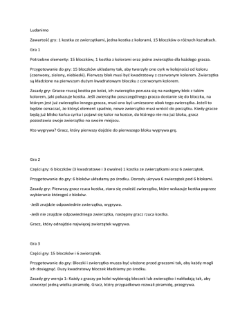 Ludanimo Zawartość gry: 1 kostka ze zwierzątkami, jedna kostka z kolorami, 15 bloczków o różnych kształtach. Gra 1 Potrzebne elementy: 15 bloczków, 1 kostka z kolorami oraz jedno zwierzątko dla każdego gracza. Przygotowanie do gry: 15 bloczków układamy tak, aby tworzyły one cyrk w kolejności od koloru (czerwony, zielony, niebieski). Pierwszy blok musi być kwadratowy z czerwonym kolorem. Zwierzątka są kładzione na pierwszym dużym kwadratowym bloczku z czerwonym kolorem. Zasady gry: Gracze rzucaj kostka po kolei, ich zwierzątko porusza się na następny blok z takim kolorem, jaki pokazuje kostka. Jeśli zwierzątko poszczególnego gracza dostanie się do bloczku, na którym jest już zwierzątko innego gracza, musi ono być umieszone obok tego zwierzątka. Jeżeli to będzie oznaczać, że któryś element spadnie, nowe zwierzątko musi wrócić do początku. Kiedy gracze będą już blisko końca cyrku i pojawi się kolor na kostce, do którego nie ma już bloku, gracz pozostawia swoje zwierzątko na swoim miejscu. Kto wygrywa? Gracz, który pierwszy dojdzie do pierwszego bloku wygrywa grę. Gra 2 Części gry: 6 bloczków (3 kwadratowe i 3 owalne) 1 kostka ze zwierzątkami oraz 6 zwierzątek. Przygotowanie do gry: 6 bloków układamy po środku. Dorosły ukrywa 6 zwierzątek pod 6 blokami. Zasady gry: Pierwszy gracz rzuca kostka, stara się znaleźć zwierzątko, które wskazuje kostka poprzez wybieranie któregoś z bloków. -Jeśli znajdzie odpowiednie zwierzątko, wygrywa. -Jeśli nie znajdzie odpowiedniego zwierzątka, następny gracz rzuca kostka. Gracz, który odnajdzie najwięcej zwierzątek wygrywa. Gra 3 Części gry: 15 bloczków i 6 zwierzątek. Przygotowanie do gry: Bloczki i zwierzątka musza być ułożone przed graczami tak, aby każdy mogli ich dosięgnąć. Duzy kwadratowy bloczek kładziemy po środku. Zasady gry wersja 1: Każdy z graczy po kolei wybierają bloczek lub zwierzątko i nakładają tak, aby utworzyć jedną wielka piramidę. Gracz, który przypadkowo rozwali piramidę, przegrywa. Wersja 2: Z dwoma kostkami. Każdy z graczy rzuca po kolei dwoma kostkami. Kolor na kostce wskazuje na blok, którego gracz musi użyć, aby dołączyć go do piramidy lub zwierzątko które również musi dołączyć do piramidy. Kiedy pod koniec gry ani jeden z bloczków nie pasuje do koloru, który wskazuje kostka, ten gracz traci kolejkę. Gracz, który przypadkowo straci jakiś element z piramidy przegrywa.