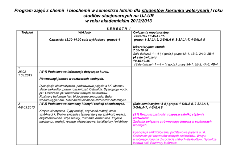 Program zajęć z chemii i biochemii w semestrze letnim dla studentów kierunku weterynarii I roku studiów stacjonarnych na UJ-UR w roku akademickim 2012/2013 SEMESTR I Tydzień Wykłady Czwartek: 12.30-14.00 sala wykładowa grupa1-4 Ćwiczenia repetytoryjne: czwartek 10.45-12.15 grupa: 1-SALA 5, 2-SALA 6, 3-SALA-7, 4-SALA 8 laboratoryjne: wtorek 7.30-10.30 Sale ćwiczeń 1 – 4 ( 4 godz.) grupa:1A-1, 1B-2, 2A-3, 2B-4 (4 sale ćwiczeń) 10.45-13.45 (Sale ćwiczeń 1 – 4 – (4 godz.) grupy 3A-1, 3B-2, 4A-3, 4B-4 1 25.021.03.2013 (W 1) Podstawowe informacje dotyczące kursu. Równowagi jonowe w roztworach wodnych. 2 4-8.03.2013 Dysocjacja elektrolityczna, podstawowe pojęcia α i K. Mocne i słabe elektrolity, prawo rozcieńczeń Ostwalda. Dysocjacja wody, pH. Obliczanie pH roztworów słabych elektrolitów. Roztwory buforowe i ich biologiczne znaczenie. Bufor wodorowęglanowi. Mechanizm działania roztworów buforowych. (W 2) Podstawowe elementy kinetyki reakcji chemicznych. Krzywe kinetyczne. Typy reakcji, szybkość reakcji, stała szybkości k. Wpływ stężenia i temperatury na szybkość reakcji, cząsteczkowość i rząd reakcji, równanie Arrheniusa. Pojęcie mechanizu reakcji, reakcje wieloetapowe, katalizatory i inhibitory (Sale seminaryjne: 5-8 ) grupa: 1-SALA 5, 2-SALA 6, 3-SALA-7, 4-SALA 8 (S1) Rozpuszczalność, rozpuszczalniki, stężenia roztworów. Zadania związane z równowagą jonową w roztworach wodnych. Dysocjacja elektrolityczna, podstawowe pojęcia α i K. Obliczanie pH roztworów słabych elektrolitów. Wpływ wspólnego jonu na dysocjację słabych elektrolitów. Hydroliza jonowa soli. Roztwory buforowe. 3 1115.03.2013 (W 3) Teoretyczne podstawy kolorymetrii. Prawo Lamberta-Beera. Sporządzanie i wykreślanie krzywych standardowych Hemoglobina i jej własności widmowe (1h) (Sale seminaryjne: 5-8 ) grupa: 1-SALA 5, 2-SALA 6, 3-SALA-7, 4-SALA 8 (S2)Obliczenia związane z równowagami jonowymi w roztworach ciąg dalszy. Podstawowe pojęcia termochemii i termodynamiki. Pojęcie entalpii swobodnej G, entalpii i entropii. Reakcje endo i egzoenergiczne. Stała równowagi a zmiana standardowej entalpii swobodnej, Reakcje odwracalne i nieodwracalne. 4 1822.03.2013 (W 4) Własności niekoligatywne roztworów wodnych. Charakterystyka roztworów ze szczególnym uwzględnieniem roztworów koloidowych. Liofilowe roztwory koloidowe w komórkach ich własności fizykochemiczne, czynniki wywołujące koagulację i ich znaczenie biologiczne. Ciśnienie osmotyczne roztworów nieelektrolitów i elektrolitów i jego znaczenie biologiczne. Równowaga Donnana i jej znaczenie biologiczne. Roztwory hypo-, hyper- i izotoniczne. Oporność osmotyczna erytrocytów. 1. Ćwiczenie laboratoryjne I Alkacymetria I i II 7.30-10.30 Sale ćwiczeń 1 – 4 ( 4 godz.) grupa:1A-1, 1B-2, 2A-3, 2B-4 (4 sale ćwiczeń) 10.45-13.45 (Sale ćwiczeń 1 – 4 – (4 godz.)grupy 3A-1, 3B-2, 4A-3, 4B-4 (4 sale ćwiczeń) (Sale seminaryjne: 5-8 ) grupa: 1-SALA 5, 2-SALA 6, 3-SALA-7, 4-SALA 8 (S 3) Procesy oksydacyjno-redukcyjne. Utleniacz i reduktor , struktura elektronowa cząsteczki. Reakcje połowkowe re-dox. Biologiczne układy redox. Określenie kierunku reakcji redox, równanie Nernsta, Potencjały redukcji standardowe i warunkach biologicznych. Obliczenia 5 2529.03.2013 wolne X 2. Ćwiczenie laboratoryjne II Spektrofotometria 7.30-10.30 Sale ćwiczeń 1 – 4 ( 4 godz.) grupa:1A-1, 1B-2, 2A-3, 2B-4 (4 sale ćwiczeń) 10.45-13.45 (Sale ćwiczeń 1 – 4 – (4 godz.)grupy 3A-1, 3B-2, 4A-3, 4B-4 (4 sale ćwiczeń) 6 1-5.04.2013 1-2.04.2012 wolne 7 812.04.20132 (W 5) Sprawdzian z chemii nieorganicznej 4.04.2013 (czwartek) (Sale seminaryjne: 5-8 ) grupa: 1-SALA 5, 2-SALA 6, 3-SALA-7, 4-SALA 8 (S 4) Podstawy chemii organicznej. (W 6) Budowa i własności chemiczne cukrów. Budowa i występowanie homoglikanów i heteroglikanów, głównie zwierzęcych. Ważne biologicznie pochodne cukrów: Aminocukry, deoksycukry. Rodzaje kwasów wywodzących się z cukrów. Rodzaje glikozydów. Hybrydyzacja a krotność i moc wiązań. Polaryzacja i polaryzowalność i ich wpływ na wiązania. Elektrofilowe i nukleofilowe reakcje addycji substytucji. Reakcje wolnorodnikowe. Ogólne mechanizmy tego typu reakcji (SN1, SN2, AN, AE). Izomerie: strukturalne i przestrzenne 3. Ćwiczenie laboratoryjne III Oporność erytrocytów 7.30-10.30 Sale ćwiczeń 1 – 4 ( 4 godz.) grupa:1A-1, 1B-2, 2A-3, 2B-4 (4 sale ćwiczeń) 10.45-13.45 (Sale ćwiczeń 1 – 4 – (4 godz.)grupy 3A-1, 3B-2, 4A-3, 4B-4 (4 sale ćwiczeń) (Sale seminaryjne: 5-8 ) grupa: 1-SALA 5, 2-SALA 6, 3-SALA-7, 4-SALA 8 (S 5) Związki organiczne z jedną grupą funkcyjną. - alkohole jedno i wielowodorotlenowe. Budowa i własności chemiczne, mechanizmy ważniejszych reakcji. - fenole. Budowa i własności chemiczne. - etery. Budowa i własności chemiczne. - związki zawierające grupę karboksylową: aldehydy, ketony, estry. Własności chemiczne, produkty utleniania i redukcji. Mechanizmy reakcji addycji nukleofilowej do grupy karboksylowej. - kwasy organiczne i ich bezwodniki, amidy. Budowa i własności chemiczne. - związki organiczne zawierające azot. Budowa i własności amin włącznie z aminami katecholowymi. - aminokwasy. Zasady syntezy peptydów. - chlorowcokwasy, oksokwasy, hydroksykwasy. 8 1519.04.2013 Wtorek (W 7) Lipidy. Lipidy występujące w komórkach żywych. - woski, triacyloglicerole. Procesy utleniania (jełczenie) - fosfolipidy, fosfoglicerydy, sfingomiezyna. - glikolipidy. Budowa, znaczenie biologiczne tłuszczów złożonych. - cholesterol, kwasy żółciowe, witamina D. Budowa, znaczenie. - hormony sterydowe. Czwartek (W 8)Aminokwasy, peptydy i białka. Podział aminokwasów, właściwości kwasowo-zasadowe aminokwasów (wyznaczanie pI aminokwasów i ich pochodnych), wykrywanie aminokwasów. Peptydy charakter wiązania peptydowego. Struktura i funkcje białek. Funkcje katalityczne białek : enzymy. 9 2226.04.2013 Wykład biochemia -wto