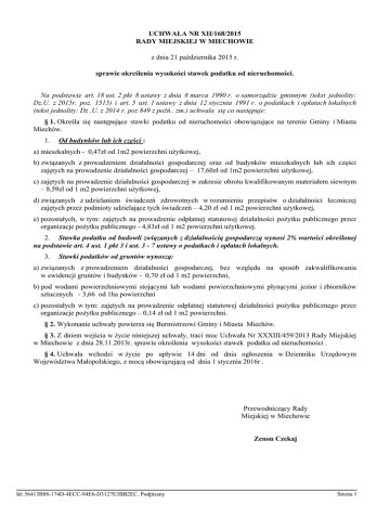 UCHWAŁA NR XII/168/2015 RADY MIEJSKIEJ W MIECHOWIE z dnia 21 października 2015 r. sprawie określenia wysokości stawek podatku od nieruchomości. Na podstawie art. 18 ust. 2 pkt 8 ustawy z dnia 8 marca 1990 r. o samorządzie gminnym (tekst jednolity: Dz.U. z 2015r. poz. 1515) i art. 5 ust. 1 ustawy z dnia 12 stycznia 1991 r. o podatkach i opłatach lokalnych (tekst jednolity: Dz .U. z 2014 r. poz 849 z poźń.. zm.) uchwala się co następuje: § 1. Określa się następujące stawki podatku od nieruchomości obowiązujące na terenie Gminy i Miasta Miechów. 1. Od budynków lub ich części : a) mieszkalnych - 0,47zł od 1m2 powierzchni użytkowej, b) związanych z prowadzeniem działalności gospodarczej oraz od budynków mieszkalnych lub ich części zajętych na prowadzenie działalności gospodarczej – 17,60zł od 1m2 powierzchni użytkowej, c) zajętych na prowadzenie działalności gospodarczej w zakresie obrotu kwalifikowanym materiałem siewnym – 8,59zł od 1 m2 powierzchni użytkowej, d) związanych z udzielaniem świadczeń zdrowotnych w rozumieniu przepisów o działalności leczniczej zajętych przez podmioty udzielające tych świadczeń – 4,20 zł od 1 m2 powierzchni użytkowej, e) pozostałych, w tym: zajętych na prowadzenie odpłatnej statutowej działalności pożytku publicznego przez organizacje pożytku publicznego - 4,83zł od 1 m2 powierzchni użytkowej. 2. Stawka podatku od budowli związanych z działalnością gospodarczą wynosi 2% wartości określonej na podstawie art. 4 ust. 1 pkt 3 i ust. 3 - 7 ustawy o podatkach i opłatach lokalnych. 3. Stawki podatków od gruntów wynoszą: a) związanych z prowadzeniem działalności gospodarczej, bez względu na sposób zakwalifikowania w ewidencji gruntów i budynków - 0,70 zł od 1 m2 powierzchni, b) pod wodami powierzchniowymi stojącymi lub wodami powierzchniowymi płynącymi jezior i zbiorników sztucznych - 3,66 od 1ha powierzchni c) pozostałych w tym: zajętych na prowadzenie odpłatnej statutowej działalności pożytku publicznego przez organizacje pożytku publicznego – 0,14 zł od 1 m2 powierzchni. § 2. Wykonanie uchwały powierza się Burmistrzowi Gminy i Miasta Miechów. § 3. Z dniem wejścia w życie niniejszej uchwały, traci moc Uchwała Nr XXXIII/459/2013 Rady Miejskiej w Miechowie z dnia 28.11.2013r. sprawie określenia wysokości stawek podatku od nieruchomości . § 4. Uchwała wchodzi w życie po upływie 14 dni od dnia ogłoszenia w Dzienniku Urzędowym Województwa Małopolskiego, z mocą obowiązującą od dnia 1 stycznia 2016r . Przewodniczący Rady Miejskiej w Miechowie Zenon Czekaj Id: 56413B88-174D-4ECC-94E6-D3127E3BB2EC. Podpisany Strona 1 UZASADNIENIE Zgodnie z art. 5 ust. 1 ustawy z dnia 12 stycznia 1991 roku o podatkach i opłatach lokalnych (Dz. U. z 2014 r., poz. 849 z późn. zm.) Rada Gminy w drodze uchwały, określa wysokość stawek podatku od nieruchomości, z tym że roczne stawki nie mogą przekroczyć stawek ustalonych przez Ministra Finansów. W przedkładanym projekcie uchwały na rok podatkowy 2016 stawki pozostawiono na poziomie roku 2015, za wyjątkiem stawki od budynków lub ich części związanych z działalnością gospodarczą oraz budynków mieszkalnych lub ich części zajętych na prowadzenie działalności gospodarczej gdzie przyjęto stawkę – 17,60zł od 1m2 powierzchni użytkowej, od gruntów związanych z prowadzeniem działalności gospodarczej, bez względu na sposób zakwalifikowania w ewidencji gruntów i budynków - 0,70 zł od 1 m2 powierzchni oraz od budynków lub ich części związanych z udzielaniem świadczeń zdrowotnych w rozumieniu przepisów o działalności leczniczej, zajętych przez podmioty udzielające tych świadczeń, proponowana stawka - 4,20 zł od 1m². Przy określeniu wzrostu stawek w przytoczonych wyżej kategoriach brano pod uwagę między innymi stawki w ościennych gminach powiatu miechowskiego. Po analizie stawek obowiązujących na rok 2015 w naszej gminie ze stawkami obowiązującymi w gminach ościennych, widać znaczną różnicę: - od budynków lub ich części związanych z działalnością gospodarczą oraz budynków mieszkalnych lub ich części zajętych na prowadzenie działalności gospodarczej w roku bieżącym wynosi – 16,07 zł za 1m 2 po zmianie 17,60zł ( różnica 1,53zł ) - grunty związane z działalnością gospodarczą bez względu na sposób zakwalifikowania w ewidencji gruntów i budynków w roku bieżącym stawka na poziomie- 0,65zł za 1m 2 po zmianie 0,70 za 1m 2 ( różnica 0,05zł) - od budynków lub ich części związanych z udzielaniem świadczeń zdrowotnych w rozumieniu przepisów o działalności leczniczej, zajętych przez podmioty udzielające tych świadczeń, Id: 56413B88-174D-4ECC-94E6-D3127E3BB2EC. Podpisany Strona 1 obowiązująca obecnie stawka – 3,80 zł od 1m² po zmianie 4,20zł ( różnica 0,40zł) Podatki i opłaty lokalne to jedno z głównych źródeł finansowania zadań własnych. Utrzymanie ich na stosownym poziomie pozwoli je w pełni realizować. Szczególne znaczenie mają stawki od gruntów i budynków związanych z prowadzeniem działalności gospodarczej (dotyczy to przede wszystkim osób prawnych), ponieważ to one w zdecydowanej większości przynoszą dochody dla gmin z tytułu podatku od nieruchomości. Ze względu na powyższe podjęcie uchwały w proponowanym brzmieniu jest uzasadnione. Id: 56413B88-174D-4ECC-94E6-D3127E3BB2EC. Podpisany Strona 2