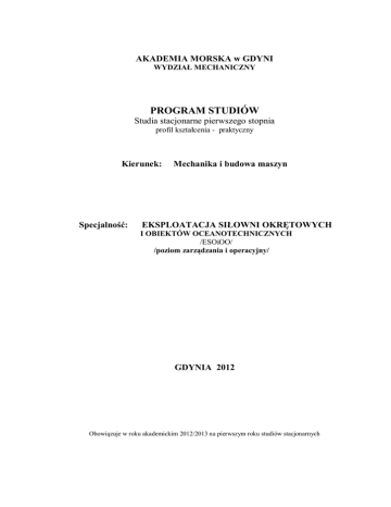 AKADEMIA MORSKA w GDYNI WYDZIAŁ MECHANICZNY PROGRAM STUDIÓW Studia stacjonarne pierwszego stopnia profil kształcenia - praktyczny Kierunek: Specjalność: Mechanika i budowa maszyn EKSPLOATACJA SIŁOWNI OKRĘTOWYCH I OBIEKTÓW OCEANOTECHNICZNYCH /ESOiOO/ /poziom zarządzania i operacyjny/ GDYNIA 2012 Obowiązuje w roku akademickim 2012/2013 na pierwszym roku studiów stacjonarnych Plan studiów zatwierdzono Uchwałą Rady Wydziału Mechanicznego dnia 19.04.2012 r., Program kształcenia dostosowany jest do kierunkowych efektów kształcenia dla kierunku mechanika i budowa maszyn (obszar studiów technicznych) określonych przez Senat Akademii Morskiej w Gdyni dnia 31 maja 2012 roku (Uchwała Nr 152) Program spełnia wymagania (dział maszynowy w specjalności mechanicznej na poziomie zarządzania i operacyjnym) zawarte w Rozporządzeniu Ministra Infrastruktury z dnia 13 lipca 2005 roku w sprawie programów szkoleń i wymagań egzaminacyjnych w zakresie kwalifikacji zawodowych marynarzy (Dz. U. Nr 173, poz. 1445) wraz ze zmianami (Dz. U. Nr 55, poz. 334) OGÓLNA CHARAKTERYSTYKA STUDIÓW a) nazwa kierunku studiówa. - MECHANIKA I BUDOWA MASZYN b) poziom kształcenia - studia pierwszego stopnia c) profil kształcenia – profil praktyczny d) forma studiów – studia stacjonarne e) tytuł zawodowy uzyskiwany przez absolwenta – inżynier f) obszar kształcenia - obszar studiów technicznych g) dziedzina nauki - dziedzina nauk technicznych h) dyscyplina naukowa – budowa i eksploatacja maszyn W - zajęcia audytoryjne, C - ćwiczenia, L - laboratorium, P - projekt, S - seminarium Objaśnienie oznaczeń w symbolach dla efektów kształcenia (EK) dla kierunku (programu) K – kierunkowe efekty kształcenia Symbole po podkreśleniu W – kategoria wiedzy U – kategoria umiejętności K - kategoria kompetencji społecznych 01, 02, 03, i kolejne – numer efektu kształcenia Zebrał: dr inż. Mirosław Czechowski 2 Spis przedmiotów Lp 1. Język angielski * Nazwa przedmiotu Strona 5 2. Podstawy informatyki 9 3. Socjologia 4. Podstawy ekonomii i zarządzania Podstawy ekonomii i zarządzania 5. Ochrona własności intelektualnej 11 6. Bezpieczeństwo pracy i ergonomia 16 7. Wychowanie fizyczne 18 8. Matematyka I, II 19 9. Fizyka I, II 21 13 15 10. Mechanika techniczna* I, II 24 11. Wytrzymałość materiałów * I, II 28 12. Mechanika płynów* 31 13. Grafika inżynierska * I, II 33 14. Podst. konstrukcji maszyn + CAD I, II, III 36 15. Projekt z podstaw konstrukcji maszyn 40 16. Eksploatacja maszyn I, II 42 17. Nauka o materiałach * I, II, III 44 18. Podst. inżynierii wytwarzania* I, II, III 48 19. Termodynamika techniczna* I, II 52 20. Elektrotechnika i elektronika * I, II 57 21. Automatyka i robotyka* 61 22. Metrologia i systemy pomiarowe 64 23. Ochrona środowiska morskiego* 66 24. Technologia remontów* 69 25. Budowa i teoria okrętu* 72 26. Siłownie okrętowe* I, II,III 76 27. Diagnostyka techniczna* 83 28. Zarządzanie bezpieczną eksploatacją statku* 85 29. Okrętowe silniki tłokowe* I,II,III 87 30. Kotły okrętowe* I,II 93 31. Turbiny okrętowe* 98 32. Maszyny i urządzenia okrętowe* I,II,III 99 33. Chłodnictwo i klimatyzacja* I,II 106 34. Elektrotechnika i elektronika okrętowa* I,II 110 35. Automatyka okrętowa* 112 36. Chemia wody, paliw i smarów* 114 37. Prawo i ubezpieczenia morskie* 119 38. Symulator siłowni okrętowej* 121 39. Podstawy napędu statku* 123 Eksploatacja siłowni z silnikami tłokowymi** 125 40. Urządzenia platform wiertniczych** 127 Eksploatacja siłowni turbinowych** 128 41. Praktyki morskie * 130 42. Seminarium dyplomowe 132 43. Praca dyplomowa 133 44. Sylwetka absolwenta 135 136 45. Plan studiów * - przedmioty konwencyjne wg STCW 78/95 ** - przedmioty do wyboru 3 Lista referencyjna identyfikacji programu szkolenia na poziomie zarządzania i operacyjnym w dziale maszynowym w specjalności mechanicznej zawartych w Rozporządzeniu Ministra Infrastruktury z dnia 13 lipca 2005 r. (Dz. U. Nr 173, poz. 1445) ze zmianami (Dz. U. Nr 55, poz. 334) z programem kształcenia dla studiów I stopnia specjalności ESOiOO Wydziału Mechanicznego Akademii Morskiej w Gdyni. Lp. Przedmiot wg programu Nr tematu Nr/Przedmiot wg programu Sem. Nr tematu Rozp. Min. Infrastruktury z studiów I stopnia ESOiOO 13 lipca 2005 1. 1,2,3,4,5,6,7 10. Mechaniczna techniczna II 3,7,12 Mechanika i hydromechanika III 7,8,11 (5.2.1) 8,9 12. Mechanika płynów IV 1,3,7,9,11 2. Siłownie okrętowe (5.3.2; 5.2.5) 1-7 9-12 26. Siłownie okrętowe 3. Maszyny i urządzenia okrętowe (5.3.3.; 5.2.8) 4. Okrętowe silniki tłokowe (5.3.1; 5.2.4) 1-9 10-21 29. Okrętowe silniki tłokowe 5. Kotły okrętowe (5.3.4; 5.2.7) 1-13 30. Kotły okrętowe 1-19 1. Język angielski 1-5 6-14 1-23 13. Grafika inżynierska 1-16 1-10 1-15 19. Termodynamika techniczna 1-19 36.Chemia wody, paliw i smarów 38. Symulator siłowni okrętowych 20. Elektrotechnika i elektronika 34. Elektrotechnika i elektronika okrętowa 21. Automatyka i robotyka 35. Automatyka okrętowa 18. Podstawy inżynierii wytwarzania 23. Ochrona środowiska morskiego 24. Technologia remontów 6. 32. Maszyny i urządzenia okrętowe Język angielski (5.3.5; 5.2.9) 7. Rysunek techniczny (5.3.6) 8. Materiałoznawstwo okrętowe (5.3.7) 9. Termodynamika techniczna (5.3.8), (5.2.6) 10. Chłodnictwo, wentylacja i klimatyzacja okrętowa 11. Chemia wody, paliw i smarów (5.3.10; 5.2.11)) 12. Symulator siłowni okrętowych (5.3.11; 5.2.12) 13. Elektrotechnika i elektronika okrętowa (5.3.12; 5.2.13) 14. Automatyka okrętowa (5.3.13; 5.2.14) 15. Praktyka warsztatowa (5.3.14) 16. Ochrona środowiska (5.3.16; 5.2.15) 17. Technologia remontów i badania nieniszczące (5.3.15; 5.2.2) 1-3 1-10 7 10-13 1-6 7-12 1-13 1-3 4-13 5 11a,12(5.3.15) 2, 3 1 11(5.3.15) 18. 1,2,3,6, 7,8,9,11, 12, 18, Budowa i teoria okrętu (5.3.17; 19, 20 5.2.3) 10 4,5,13,14, 15,16,17,19 19. Zarządzanie bezpieczną eksploatacją statku (5.2.17) 20. Prawo i ubezpieczenia morskie (5.2.16) 17