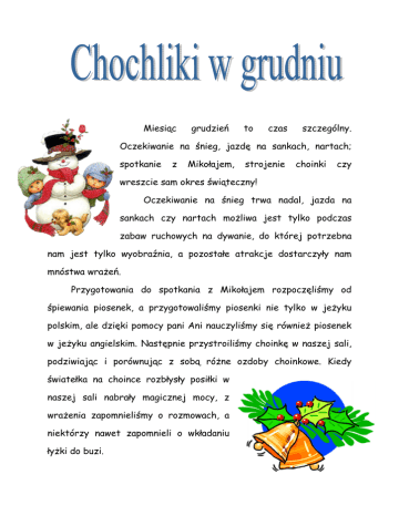 Miesiąc grudzień to czas szczególny. Oczekiwanie na śnieg, jazdę na sankach, nartach; spotkanie z Mikołajem, strojenie choinki czy wreszcie sam okres świąteczny! Oczekiwanie na śnieg trwa nadal, jazda na sankach czy nartach możliwa jest tylko podczas zabaw ruchowych na dywanie, do której potrzebna nam jest tylko wyobraźnia, a pozostałe atrakcje dostarczyły nam mnóstwa wrażeń. Przygotowania do spotkania z Mikołajem rozpoczęliśmy od śpiewania piosenek, a przygotowaliśmy piosenki nie tylko w jeżyku polskim, ale dzięki pomocy pani Ani nauczyliśmy się również piosenek w jeżyku angielskim. Następnie przystroiliśmy choinkę w naszej sali, podziwiając i porównując z sobą różne ozdoby choinkowe. Kiedy światełka na choince rozbłysły posiłki w naszej sali nabrały magicznej mocy, z wrażenia zapomnieliśmy o rozmowach, a niektórzy nawet zapomnieli o wkładaniu łyżki do buzi. 6 grudzień wreszcie nadszedł. To szczególny dzień, w którym niemal wszyscy czekamy na tajemnicze odwiedziny Św. Mikołaja, który ni stąd ni z owąd, pojawia się w naszych domach, by obdarować nas podarkami. Nie wszyscy jednak mamy okazję przyłapać go na gorącym uczynku, gdy zostawia nam prezenty w różnych dziwnych miejscach /np.: w wyczyszczonych czysto butach?/. Natomiast z dumą możemy powiedzieć, że tegoż dnia Św. Mikołaja na pewno spotkam w naszym przedszkolu. To tu mamy okazję zobaczyć go w całej jego okazałości i zaprezentować przygotowany przez nas program i usiąść mu na kolanach. Tego dnia prezenty odgrywają drugorzędną rolę, bo największą atrakcją i wydarzeniem jest SAM ON. I tak 6 grudnia spędziliśmy bardzo miłe chwile w towarzystwie Św. Mikołaja. Każdy z nas odebrał paczkę od Mikołaja, a poza tym otrzymaliśmy Duzy worek z zabawkami do naszej sali. Nowe gry, klocki czy książki od razu znalazły się w rękach, które doskonale wiedziały co z nimi zrobić. W miesiącu grudniu bawiliśmy się z literką K – rozmawialiśmy o tym, że okres świąteczny to okres wysyłania Zastanawialiśmy kartek się komu z życzeniami. możemy złożyć życzenia, a przede wszystkim czego możemy życzyć bliskim. Oprócz zdrowia i radości, wielkiej ilości prezentów życzyliśmy śniegu, śniegu, śniegu… Literka „K” wspólnie z naszą panią zaprosiły nas na przedstawienie pt. „O Koronczarce Klaruni i zimowych wróżkach” E. Szerburg – Zarembiny. Bajka bardzo nam się podobała, a w szczególności wróżki śniegu, mrozu i szronu. Zastanawialiśmy się nad tym co to jest morał i jaki morał ukryty jest w tej bajce. Ustaliliśmy, że warto wierzyć w marzenia, bo wiele z nich może się spełnić. Poza tym główna bohaterka Klarunia przekonała nas, że dzięki pracowitości możemy wiele osiągnąć. Zastanawialiśmy się również jak wyglądają koronki robione przez koronczarki. Koronki mogliśmy oglądnąć i porównać ich wzory i kształty. Staraliśmy się dostrzec w serwetkach koronkowych kwiaty, owoce czy zwierzątka. Oprócz dobrze znanych nam kształtów wskazywaliśmy kształty owalne i romby. Sami również próbowaliśmy wymalować artystyczne wzory najpierw w powietrzu z wykorzystaniem apaszki, a następnie próbowaliśmy ułożyć najróżniejsze wzory z wykorzystaniem nitek. Powstały piłki, bałwanki, płatki śniegu i inne ciekawe wzory. W grudniu wybraliśmy się również do teatru na przedstawienie pt. „Królowa Śniegu”. Baśń ta różniła się od tej, którą znamy. Jednak również bardzo nam się podobała, w szczególności piękne piosenki śpiewane przez bohaterów. W grudniu rozmawialiśmy również o zachowaniach zwierząt zimową porą roku. Rozmawialiśmy o tym, że zwierzętom czasem potrzebna jest nasza pomoc. Pomagać możemy szczególnie ptakom poprzez dosypywanie pokarmu do karmników. Przy okazji tego tematu bawiliśmy się z literką „t” zastanawiając się co to są tropy i co mogą oznaczać. Muzyka pomogła nam stworzyć gawry dla niedźwiedzia, a kiedy domki te były już gotowe umieściliśmy tam właśnie niedźwiadki. Próbowaliśmy je ułożyć z kółek różnej wielkości. Prawie żaden niedźwiedź nie spał: niektóre stały, inne podskakiwały, a chyba wszystkie zastanawiały się „co z tą zimą i naszym zimowym snem” ? Kolejne dni minęły nam głównie na intensywnych przygotowaniach do uroczystej wigilijki. W nastrój świąteczny wprowadziła nas Mała Filharmonia, z którą wspólnie śpiewaliśmy kolędy. Każdy z nas przygotował świąteczny stroik z szyszek. Po czym przystąpiliśmy do regularnych prób przedstawienia – jasełek. Każdy z nas pilnie ćwiczył swoją rolę i dzielnie śpiewał kolędy. Przekonaliśmy się na własnej skórze ile pracy, zaangażowania i prób musi przejść każdy aktor począwszy od nauczenia się roli do efektu końcowego jakim jest wystawienie przedstawienia. Dzięki temu przedsięwzięciu uświadomiliśmy sobie, że nawet bardzo krótkie przedstawienie wymaga dobrej reżyserii, choreografii i oczywiście dobrej gry aktorów, i wielu, wielu prób, na których nieustannie trzeba poprawiać różne detale. Wszyscy w tym okresie byliśmy wielce podekscytowani, czasami nasze emocje sięgały zenitu o czym najlepiej wiedzą nasze panie, które czuwały nad całym przedsięwzięciem. Chcieliśmy bardzo podziękować panu Andrzejowi, pani Eli, pani Anetce za pomoc i serce włożone w przygotowanie i obsługę uroczystości. Najbardziej dziękujemy za uśmiech i gorące serca NASZYCH RODZICÓW. GRUDZIEŃ w grupie CHOCHLIKI Drodzy Rodzice, grudzień upłynął Chochlikom zimowo i świątecznie. Mimo, iż pogoda była bardziej jesienna niż zimowa, poczuliśmy klimat świąt ucząc się świątecznych piosenek, nowych słówek (np. nazw zabawek, części ciała i ubrań jakie nosi bałwanek) i zwrotów. Dwie piosenki (Little snowflake i We wish you a Merry Christmas) mogliście usłyszeć na naszej przedszkolnej wigil