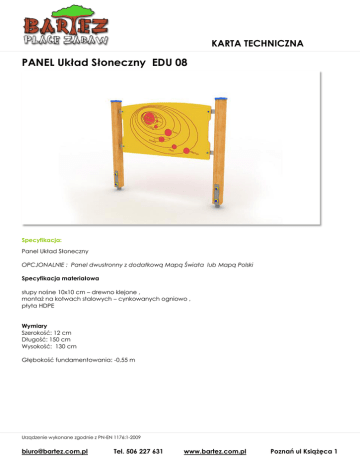 KARTA TECHNICZNA PANEL Układ Słoneczny EDU 08 Specyfikacja: Panel Układ Słoneczny OPCJONALNIE : Panel dwustronny z dodatkową Mapą Świata lub Mapą Polski Specyfikacja materiałowa słupy nośne 10x10 cm – drewno klejone , montaż na kotwach stalowych – cynkowanych ogniowo , płyta HDPE Wymiary Szerokość: 12 cm Długość: 150 cm Wysokość: 130 cm Głębokość fundamentowania: -0,55 m Urządzenie wykonane zgodnie z PN-EN 1176:1-2009 [email protected] Tel. 506 227 631 www.bartez.com.pl Poznań ul Książęca 1