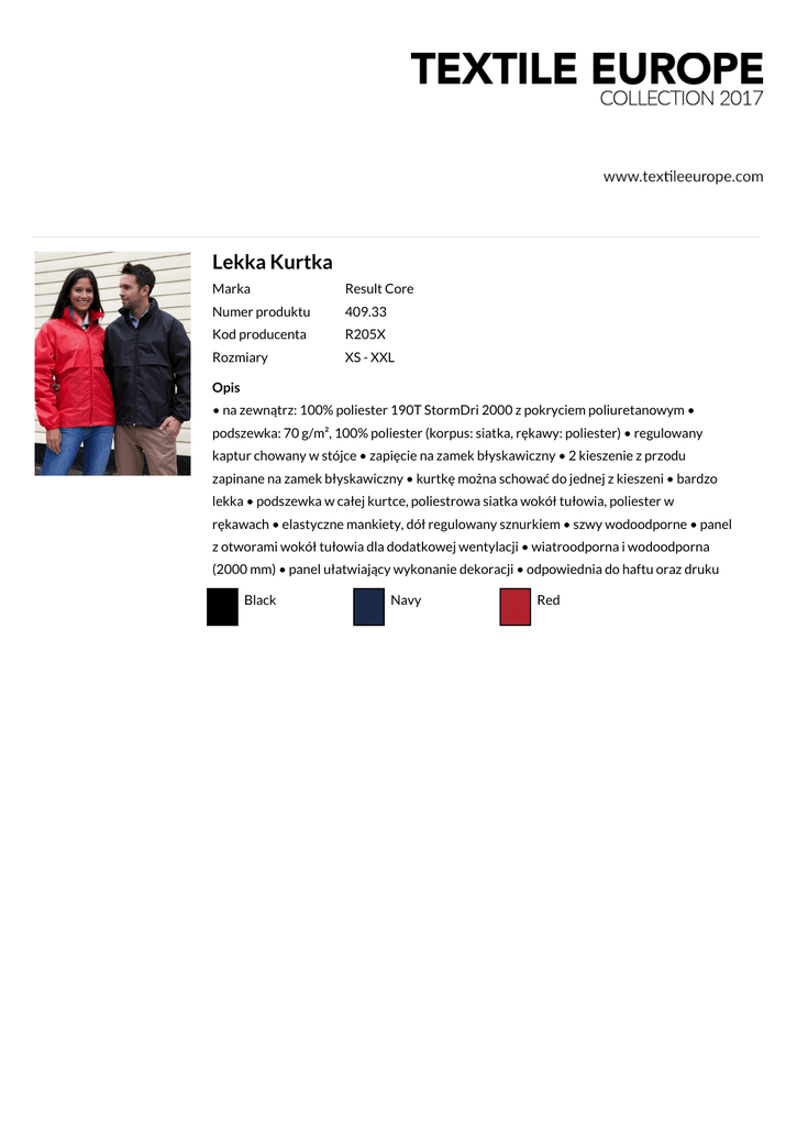 Lekka Kurtka Marka Result Core Numer produktu 409.33 Kod producenta R205X Rozmiary XS - XXL Opis • na zewnątrz: 100% poliester 190T StormDri 2000 z pokryciem poliuretanowym • podszewka: 70 g/m², 100% poliester (korpus: siatka, rękawy: poliester) • regulowany kaptur chowany w stójce • zapięcie na zamek błyskawiczny • 2 kieszenie z przodu zapinane na zamek błyskawiczny • kurtkę można schować do jednej z kieszeni • bardzo lekka • podszewka w całej kurtce, poliestrowa siatka wokół tułowia, poliester w rękawach • elastyczne mankiety, dół regulowany sznurkiem • szwy wodoodporne • panel z otworami wokół tułowia dla dodatkowej wentylacji • wiatroodporna i wodoodporna (2000 mm) • panel ułatwiający wykonanie dekoracji • odpowiednia do haftu oraz druku Black Navy Red
