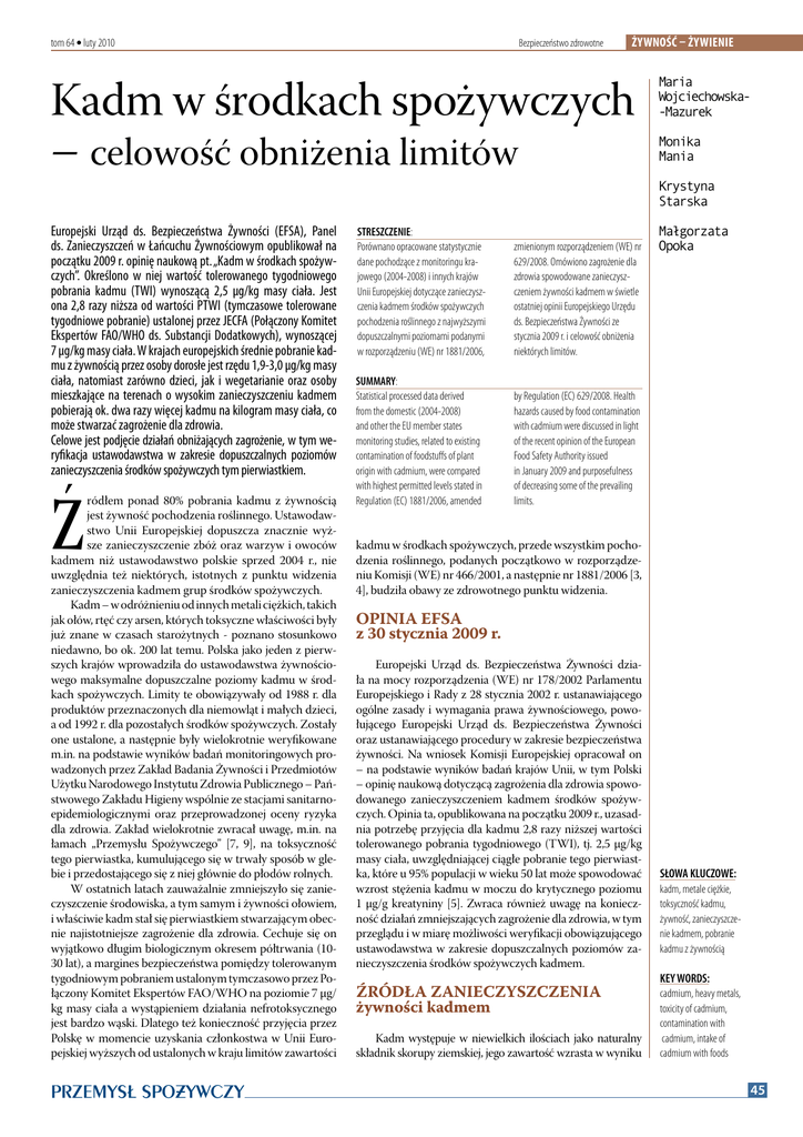 tom 64 l luty 2010 Bezpieczeństwo zdrowotne żywność – ŻYWIENIE Kadm w środkach spożywczych – celowość obniżenia limitów Europejski Urząd ds. Bezpieczeństwa Żywności (EFSA), Panel ds. Zanieczyszczeń w Łańcuchu Żywnościowym opublikował na początku 2009 r. opinię naukową pt. „Kadm w środkach spożywczych”. Określono w niej wartość tolerowanego tygodniowego pobrania kadmu (TWI) wynoszącą 2,5 µg/kg masy ciała. Jest ona 2,8 razy niższa od wartości PTWI (tymczasowe tolerowane tygodniowe pobranie) ustalonej przez JECFA (Połączony Komitet Ekspertów FAO/WHO ds. Substancji Dodatkowych), wynoszącej 7 µg/kg masy ciała. W krajach europejskich średnie pobranie kadmu z żywnością przez osoby dorosłe jest rzędu 1,9-3,0 µg/kg masy ciała, natomiast zarówno dzieci, jak i wegetarianie oraz osoby mieszkające na terenach o wysokim zanieczyszczeniu kadmem pobierają ok. dwa razy więcej kadmu na kilogram masy ciała, co może stwarzać zagrożenie dla zdrowia. Celowe jest podjęcie działań obniżających zagrożenie, w tym weryfikacja ustawodawstwa w zakresie dopuszczalnych poziomów zanieczyszczenia środków spożywczych tym pierwiastkiem. ź ródłem ponad 80% pobrania kadmu z żywnością jest żywność pochodzenia roślinnego. Ustawodawstwo Unii Europejskiej dopuszcza znacznie wyższe zanieczyszczenie zbóż oraz warzyw i owoców kadmem niż ustawodawstwo polskie sprzed 2004 r., nie uwzględnia też niektórych, istotnych z punktu widzenia zanieczyszczenia kadmem grup środków spożywczych. Kadm – w odróżnieniu od innych metali ciężkich, takich jak ołów, rtęć czy arsen, których toksyczne właściwości były już znane w czasach starożytnych - poznano stosunkowo niedawno, bo ok. 200 lat temu. Polska jako jeden z pierwszych krajów wprowadziła do ustawodawstwa żywnościowego maksymalne dopuszczalne poziomy kadmu w środkach spożywczych. Limity te obowiązywały od 1988 r. dla produktów przeznaczonych dla niemowląt i małych dzieci, a od 1992 r. dla pozostałych środków spożywczych. Zostały one ustalone, a następnie były wielokrotnie weryfikowane m.in. na podstawie wyników badań monitoringowych prowadzonych przez Zakład Badania Żywności i Przedmiotów Użytku Narodowego Instytutu Zdrowia Publicznego – Państwowego Zakładu Higieny wspólnie ze stacjami sanitarnoepidemiologicznymi oraz przeprowadzonej oceny ryzyka dla zdrowia. Zakład wielokrotnie zwracał uwagę, m.in. na łamach „Przemysłu Spożywczego” [7, 9], na toksyczność tego pierwiastka, kumulującego się w trwały sposób w glebie i przedostającego się z niej głównie do płodów rolnych. W ostatnich latach zauważalnie zmniejszyło się zanieczyszczenie środowiska, a tym samym i żywności ołowiem, i właściwie kadm stał się pierwiastkiem stwarzającym obecnie najistotniejsze zagrożenie dla zdrowia. Cechuje się on wyjątkowo długim biologicznym okresem półtrwania (1030 lat), a margines bezpieczeństwa pomiędzy tolerowanym tygodniowym pobraniem ustalonym tymczasowo przez Połączony Komitet Ekspertów FAO/WHO na poziomie 7 µg/ kg masy ciała a wystąpieniem działania nefrotoksycznego jest bardzo wąski. Dlatego też konieczność przyjęcia przez Polskę w momencie uzyskania członkostwa w Unii Europejskiej wyższych od ustalonych w kraju limitów zawartości PRZEMYSŁ SPOZYWCZY STRESZCZENIE: Porównano opracowane statystycznie dane pochodzące z monitoringu krajowego (2004-2008) i innych krajów Unii Europejskiej dotyczące zanieczyszczenia kadmem środków spożywczych pochodzenia roślinnego z najwyższymi dopuszczalnymi poziomami podanymi w rozporządzeniu (WE) nr 1881/2006, zmienionym rozporządzeniem (WE) nr 629/2008. Omówiono zagrożenie dla zdrowia spowodowane zanieczyszczeniem żywności kadmem w świetle ostatniej opinii Europejskiego Urzędu ds. Bezpieczeństwa Żywności ze stycznia 2009 r. i celowość obniżenia niektórych limitów. SUMMARY: Statistical processed data derived from the domestic (2004-2008) and other the EU member states monitoring studies, related to existing contamination of foodstuffs of plant origin with cadmium, were compared with highest permitted levels stated in Regulation (EC) 1881/2006, amended by Regulation (EC) 629/2008. Health hazards caused by food contamination with cadmium were discussed in light of the recent opinion of the European Food Safety Authority issued in January 2009 and purposefulness of decreasing some of the prevailing limits. Maria Wojciechowska-Mazurek Monika Mania Krystyna Starska Małgorzata Opoka kadmu w środkach spożywczych, przede wszystkim pochodzenia roślinnego, podanych początkowo w rozporządzeniu Komisji (WE) nr 466/2001, a następnie nr 1881/2006 [3, 4], budziła obawy ze zdrowotnego punktu widzenia. OPINIA EFSA z 30 stycznia 2009 r. Europejski Urząd ds. Bezpieczeństwa Żywności działa na mocy rozporządzenia (WE) nr 178/2002 Parlamentu Europejskiego i Rady z 28 stycznia 2002 r. ustanawiającego ogólne zasady i wymagania prawa żywnościowego, powołującego Europejski Urząd ds. Bezpieczeństwa Żywności oraz ustanawiającego procedury w zakresie bezpieczeństwa żywności. Na wniosek Komisji Europejskiej opracował on – na podstawie wyników badań krajów Unii, w tym Polski – opinię naukową dotyczącą zagrożenia dla zdrowia spowodowanego zanieczyszczeniem kadmem środków spożywczych. Opinia ta, opublikowana na początku 2009 r., uzasadnia potrzebę przyjęcia dla kadmu 2,8 razy niższej wartości tolerowanego pobrania tygodniowego (TWI), tj. 2,5 µg/kg masy ciała, uwzględniającej ciągłe pobranie tego pierwiastka, które u 95% populacji w wieku 50 lat może spowodować wzrost stężenia kadmu w moczu do krytycznego poziomu 1 µg/g kreatyniny [5]. Zwraca również uwagę na konieczność działań zmniejszających zagrożenie dla zdrowia, w tym przeglądu i w miarę możliwości weryfikacji obowiązującego ustawodawstwa w zakresie dopuszc