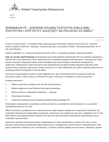 Polskie Towarzystwo Statystyczne AAA English SEMINARIUM PT. „KORZENIE POLSKIEJ STATYSTYKI PUBLICZNEJ STATYSTYKA I STATYSTYCY GALICYJSCY NA POCZĄTKU XX WIEKU” 10.06.2015 W dniu 10 czerwca 2015 r., w siedzibie Urzędu Statystycznego w Warszawie, odbyło się seminarium pt. „Korzenie polskiej statystyki publicznej - statystyka i statystycy galicyjscy na początku XX wieku”, które poprowadził prof. zw. dr hab. Józef Pociecha. Profesor podkreślił m.in. znaczenie wydanej we wrześniu 1915 r. w Krakowie publikacji „Statystyka Polski”. Prof. zw. dr hab. Józef Pociecha jest Przewodniczącym Rady Oddziału Krakowskiego PTS. Jest wybitnym specjalistą w zakresie teorii oraz zastosowań metod taksonomicznych w badaniach społeczno-ekonomicznych. Znaczącą rolę w jego pracach naukowych odgrywają metody analizy demograficznej wykorzystywane w badaniach demograficznospołecznych. Podstawowym celem seminarium było przedstawienie początków polskiej statystyki publicznej, której korzenie tkwią w statystyce galicyjskiej. Zostały poruszone m.in. takie zagadnienia, jak system statystyki publicznej oraz działalność polskich statystyków na terenie Galicji. Seminarium przeprowadzone zostało w trybie telekonferencji, aby zainteresowani historią statystyki publicznej pracownicy resortu, a także wszyscy członkowie PTS mogli uczestniczyć w wykładzie w czasie rzeczywistym. Przebieg seminarium: 1. Otwarcie spotkania i powitanie prof. dra hab. Józefa Pociechy. 2. Referat wygłoszony przez Profesora ilustrowany prezentacją. 3. Pytania słuchaczy i odpowiedzi wykładowcy — dyskusja. 4. Podsumowanie dyskusji. 5. Zakończenie spotkania przez Przewodniczącego RO Warszawskiego PTS. Przewidujemy udostępnienie utrwalonego na filmie seminarium na zamówienie zainteresowanych, a w przyszłości udostępnienie także na You Tube. Bliższe informacje o wykładowcy oraz o kierowanej przez niego Katedrze znajdują się w załączonych materiałach. Do materiałów informacyjnych dołączyliśmy prezentację z seminarium oraz syntetyczny opis życia i działalności prof. dr hab. Józefa Buzka, pierwszego Dyrektora (Prezesa) GUS, który był najznamienitszym statystykiem ukształtowanym przez środowisko naukowe Galicji. Seminarium stanowiło kontynuację spotkań metodologicznych, które realizowaliśmy w latach 2011–2014, a które dotyczyły najważniejszych problemów badań statystycznych, socjologicznych, ekonomicznych i demograficznych. Było piątym spotkaniem w bieżącym roku. Przewidujemy, że kolejne spotkania odbędą się we wrześniu, listopadzie i grudniu 2015 r. Pobierz Adobe® Reader® Pobierz Word Viewer Pobierz Excel Viewer Pobierz PowerPoint Viewer Pobierz darmowe oprogramowanie do przeglądania plików: Plakat 0.29 MB Ulotka 0.30 MB Katedra Statystyki UE w Krakowie 2.63 MB Prof. Józef Buzek 1.21 MB Prezentacja 0.94 MB Do góry Copyright © 2017 Polskie Towarzystwo Statystyczne