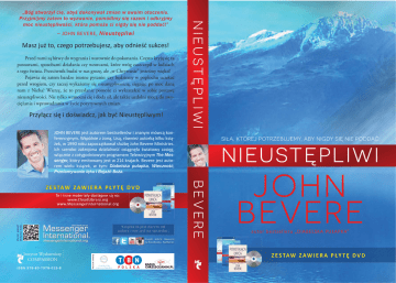 – JOHN BEVERE, Nieustępliwi Masz już to, czego potrzebujesz, aby odnieść sukces! Przed nami są bitwy do wygrania i warownie do pokonania. Często kryją się za postawami, sposobami działania czy wzorcami, które wróg zaszczepił w ludziach z tego świata. Przeciwnik budzi w nas grozę, ale „w Chrystusie” jesteśmy więksi! Pojawia się zatem bardzo istotne pytanie: czy będziemy w popłochu uciekać przed wrogiem, czy raczej wykażemy się nieustępliwością, sięgając po moc daną nam z Nieba? Wierzę, że to przesłanie pomoże ci wykształcić w sobie postawę nieustępliwości. Nie tylko wzmocni cię i doda sił, ale także uzdolni mocą do zwyciężania i wprowadzania w życie pozytywnych zmian. Przyłącz się i doświadcz, jak być Nieustępliwym! NIEUSTĘPLIWI „Bóg stworzył cię, abyś dokonywał zmian w swoim otoczeniu. Przyjmijmy zatem to wyzwanie, pomódlmy się razem i odkryjmy moc nieustępliwości, która pomoże ci nigdy się nie poddać!” JOHN BEVERE jest autorem bestsellerów i znanym mówcą konferencyjnym. Wspólnie z żoną, Lisą, również autorką kilku książek, w 1990 roku zapoczątkował służbę John Bevere Ministries. Ich szeroko zakrojona działalność osiągnęła światowy zasięg, włącznie z cotygodniowym programem Telewizyjnym The Messenger, który emitowany jest w 214 krajach. Bevere jest autorem wielu książek, w tym: Diabelska pułapka, Wieczność, Przełamywanie lęku i Bojaźń Boża. Chcesz wiecej? Zeskanuj tutaj. Te i inne materiały dostępne są na: www.CloudLibrary.org www.MessengerInternational.org Znajdź John’a Bevere’a na Facebooku, Twitterze. Patronat medialny I S B N 97 8 - 8 3 - 7 97 8 - 0 1 9 - 8 Książka ta jest darem od autora i nie jest na sprzedaż. chim NIEUSTĘPLIWI BEVERE Z E S TA W Z A W I E R A P Ł Y T Ę D V D SIŁA, KTÓREJ POTRZEBUJEMY, ABY NIGDY SIĘ NIE PODDAĆ JOHN BEVERE autor bestselleru „DIABELSKA PUŁAPKA” Z E S TA W Z A W I E R A P Ł Y T Ę D V D Drogi przyjacielu! Koniec twojej drogi z Chrystusem jest zdecydowanie bardziej istotny niż jej początek. Podobnie jak biegacz podczas wyścigu, tak i ty musisz przyjąć dobrą pozycję, aby z powodzeniem ukończyć swój bieg. Jak często jednak spotykamy naszych drogich braci i siostry, którzy podczas tego biegu słabną i w końcu poddają się z powodu napotkanych trudności lub nieudanych prób? Na szczęście łaska Boża dostarcza nam wszystkiego, co niezbędne, abyśmy mogli panować nad słabościami czy w obliczu wielkich trudności. Moc, która dodaje nam sił, abyśmy mogli pomyślnie ukończyć nasz bieg, jest głównym tematem książki „Nieustępliwi”. Wierzę, że to przesłanie jest proroczo namaszczone i odnosi się do sytuacji w dzisiejszym Kościele. Od czasu wydania tej książki wielu mężczyzn i wiele kobiet poświadczyło, że zaowocowało ono poczuciem wolności, wiarą i wytrwałością w ich życiu. Ja również doświadczyłem odnowienia w duchu, gdy Pan przekazał mi te prawdy. Bóg wlał mi do serca potrzebę dzielenia się tymi spostrzeżeniami z tobą i z innymi liderami współczesnego Kościoła. Proszę, przyjmij je wraz z moją miłością i wsparciem. Dziel się nauczaniem, zawartym na dołączonej płycie, z kim tylko możesz! Wierzę, że zmotywuje ono ciebie i ludzi powierzonym twojej opiece do znalezienia celu, autorytetu i Bożego przeznaczenia. Przyjacielu, przesłanie to na zawsze zmieniło moje życie i głęboko wpłynęło na moją służbę. Modlę się o to, abyś i ty dzięki tej książce również doznał głębokiej przemiany. Chciałbym także, byś podzielił się ze mną tym, jak przesłanie „Nieustępliwych” wpłynęło na ciebie i twoje otoczenie. Twój brat w Chrystusie, Płyty te jest osobistym podarunkiem od Johna Bevere’a. Dzięki nich uzyskasz dostęp do wielu materiałów, które pomogą ci w dalszym studiowaniu tego dynamicznego nauczania i dzieleniu się nim z innymi. Zachęcam cię do dystrybucji i kopiowania różnych części tego nauczania. Pozwalam ci na przesyłanie plików pocztą elektroniczną, dystrybucję wśród studentów, umieszczanie w internecie, jak również na drukowanie i powielanie kopii. Materiały te zostały specjalnie opracowane, aby inspirować i zachęcać wszystkich chrześcijan na świecie. Te i inne materiały do nauczania (w języku polskim) Johna i Lisy Bevere są dostępne do pobrania na stronie: John Jo oh hn Bevere Bee B [email protected] mai aill co com Znajdź John’a Bevere’a na Facebooku, Twitterze. www.MessengerInterna onal.org www.CloudLibrary.org Dodatkowe materiały w wielu językach dostępne są do wglądu i pobierania na: www.YouTube.com i www.Yuku.com oraz innych serwisach internetowych. „Książka „Nieustępliwi” rozbudzi w tobie pasję do Bożego dzieła oraz determinację, abyś trwał w wierze i dążył do realizacji danego ci przez Boga przeznaczenia”. – JOYCE MEYER, autorka wielu bestsellerów m.in. „Bitwy o umysł”, nauczyciel Słowa Bożego „John Bevere ma pełne prawo usługiwać dla Ciała Chrystusa. Jego nauczania są wypełnione pragnieniem, by każdy mógł znaleźć i wypełnić darowane mu przez Boga przeznaczenie. Jego miłość do Chrystusa oraz głębokie objawienie Słowa Bożego sprawią, że zaczniesz być nieustępliwy – w walce o Boże dzieło”. – BRIAN I BOBBIE HOUSTON, pastorzy kościoła Hillsong „Pisanie na określony temat a przekuwanie słów w czyn to dwie różne rzeczy. John zarówno w książce jak i w życiu ukazuje nam owoce podążania za Bożymi celami. Inspiruje czytelników do przejścia z duchowej bierności do Bożej woli… rzuca wyzwanie, które warto podjąć!”. – JAMES ROBINSON, prezes służby LIFE Outreach International, Fort Worth, Teksas „John Bevere odkrywa przed nami podstawowe zasady pokonywania trudności życia. Wzywa każdego wierzącego do porzucenia biernego życia i wkroczenia do świata „Nieustępliwych”. Ci, którzy