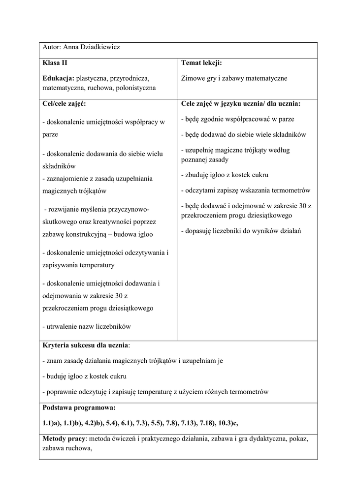 Autor: Anna Dziadkiewicz Klasa II Temat lekcji: Edukacja: plastyczna, przyrodnicza, matematyczna, ruchowa, polonistyczna Zimowe gry i zabawy matematyczne Cel/cele zajęć: Cele zajęć w języku ucznia/ dla ucznia: - doskonalenie umiejętności współpracy w - będę zgodnie współpracować w parze parze - będę dodawać do siebie wiele składników - doskonalenie dodawania do siebie wielu - uzupełnię magiczne trójkąty według poznanej zasady składników - zaznajomienie z zasadą uzupełniania - zbuduję igloo z kostek cukru magicznych trójkątów - odczytami zapiszę wskazania termometrów - rozwijanie myślenia przyczynowo- - będę dodawać i odejmować w zakresie 30 z przekroczeniem progu dziesiątkowego skutkowego oraz kreatywności poprzez zabawę konstrukcyjną – budowa igloo - dopasuję liczebniki do wyników działań - doskonalenie umiejętności odczytywania i zapisywania temperatury - doskonalenie umiejętności dodawania i odejmowania w zakresie 30 z przekroczeniem progu dziesiątkowego - utrwalenie nazw liczebników Kryteria sukcesu dla ucznia: - znam zasadę działania magicznych trójkątów i uzupełniam je - buduję igloo z kostek cukru - poprawnie odczytuję i zapisuję temperaturę z użyciem różnych termometrów Podstawa programowa: 1.1)a), 1.1)b), 4.2)b), 5.4), 6.1), 7.3), 5.5), 7.8), 7.13), 7.18), 10.3)c, Metody pracy: metoda ćwiczeń i praktycznego działania, zabawa i gra dydaktyczna, pokaz, zabawa ruchowa, Formy pracy: praca w parach, indywidualna i grupowa Środki dydaktyczne: wata (może być również puchowe tworzywo, którym wypełnia się poduszki), klej magik, kartka z bloku technicznego najlepiej format A3, papilotki (papierowe foremki) do muffinek, niepotrzebne płyty CD, kilka arkuszy niebieskiego/błękitnego papieru, nożyczki, lukier,1 opakowanie cukru w kostkach na jednego ucznia, mała szklana miseczka - po jednej na parę uczniów, deseczka lub płaski talerzyk – po jednym na parę uczniów, papierowe kule – po jednej dla każdego ucznia, nagranie audio – załącznik nr 1, taśma papierowa, karteczki z działaniami matematycznymi, zeszyty uczniów, gwizdek, Załącznik nr 2 – magiczne trójkąty, różne termometry (wewnętrzny, zewnętrzny, elektroniczny oraz lekarski), Załącznik nr 3Wskazania termometrów, komputery z dostępem do Internetu lub tablica interaktywna, ćwiczenie interaktywne w dwóch poziomach trudności: łatwiejszy – odpowiedzi do wyboru i trudniejszy – samodzielne uzupełnianie, Opis gry „Bałwankowe rysowanie i składników dodawanie, który znajduje się w załączniku nr 4, plansze do gry - załącznik nr 5, kostki do gry, kartki papieru, kredki, opis gry Chmurowe bingo – załącznik nr 6, plansze do gry załącznik nr 7, miniankieta ewaluacyjna – Załącznik nr 8 – dla każdego ucznia. Przebieg zajęć „Drogowskazy” -wskazówki Centra Aktywnej Edukacji i nauczyciel uwagi o realizacji 1. Nauczyciel przed lekcją prosi, by uczniowie przynieśli z domu watę (może być również puchowe tworzywo, którym wypełnia się poduszki), klej magik, kartkę z bloku technicznego najlepiej format A3, papilotki (papierowe foremki) do muffinek, niepotrzebne płyty CD, kilka arkuszy niebieskiego/błękitnego papieru oraz nożyczki 2. Nauczyciel na powitanie uczniów odtwarza nagranie audio, które jest jednocześnie zagadką dotyczącą tematu lekcji. Załącznik nr 1 – plik audio wierszowane wprowadzenie do lekcji. Nagranie jest wprowadzeniem do dyskusji. Hasła kluczowe, które powinni po odtworzeniu nagrania zapisać/wyodrębnić uczniowie to: start, gra, zima, grudzień, linijka, trójkąt, kwadrat. polonistycznokomunikacyjne Nauczyciel wykorzystuje zgromadzone w ten sposób słownictwo do sformułowania tematu i celu lekcji. Informuje uczniów, że w tym dniu będą brali udział w zimowych grach i zabawach matematycznych. 3. Zabawa ruchowa śniegowe kule. Przed lekcją nauczyciel przygotowuje po jednej kuli z papieru gazetowego dla każdego ucznia. W tym celu zgniata kartki z gazet uprzednio umieszczając w środku kolorową karteczkę z działaniem matematycznym i skleja ją papierową taśmą. Uczniów należy podzielić na dwie drużyny, które ustawiają się po przeciwległych stronach boiska (boisko to wyodrębniona w sali artystycznoruchowe przestrzeń przedzielona na pół np. przyklejonym do podłogi paskiem z taśmy papierowej – jak boisko do gry w dwa ognie). Każdy uczeń otrzymuje papierową kulę (śniegową kulę). Na umówiony znak np. gwizdek lub klaśnięcie, uczniowie przerzucają swoją kulę na stronę przeciwnej drużyny, a następnie starają się jak najszybciej przerzucać pojawiające się na ich boisku kule rzucone przez przeciwników. Na umówiony znak uczniowie przestają przerzucać kule, wówczas następuje moment przeliczania kul znajdujących się na połowach boiska. Wygrywa drużyna, która będzie miała na swoim boisku mniej śniegowych kul. Grę warto powtórzyć kilka razy, by każda drużyna miała szanse na wygraną. Uwaga, jeżeli w którejś drużynie jest mniej zawodników powinni oni otrzymać taką samą liczbę kul jak przeciwnicy, wówczas jeden z zawodników na początku gry otrzymuje dwie kule. 4. Do następnej zabawy również będą potrzebne papierowe kule z zadaniami matematycznymi wewnątrz. Dzieci siadają w kole, każde z nich bierze ze sobą zeszyt i ołówek oraz jedną z papierowych kul. Dzieci rzucają do siebie kulami na umówiony znak przestają rzucać i odwijają kulę w poszukiwaniu działania matematycznego, gdy tylko je odnajdą, zapisują w zeszycie działanie i starają się je jak najszybciej obliczyć – zapisać wynik. Następnie ponownie zawijają działanie w kulę papieru i rzucają ją do innych dzieci. Nauczyciel ponownie daje znak do odwijania kul. Czynności powtarzamy wielokrotnie, by dzieci miały jak najwięcej szans na dokonywanie obliczeń. Po zakończeniu zabawy dzieci przekazują swoje zeszyty osobie z