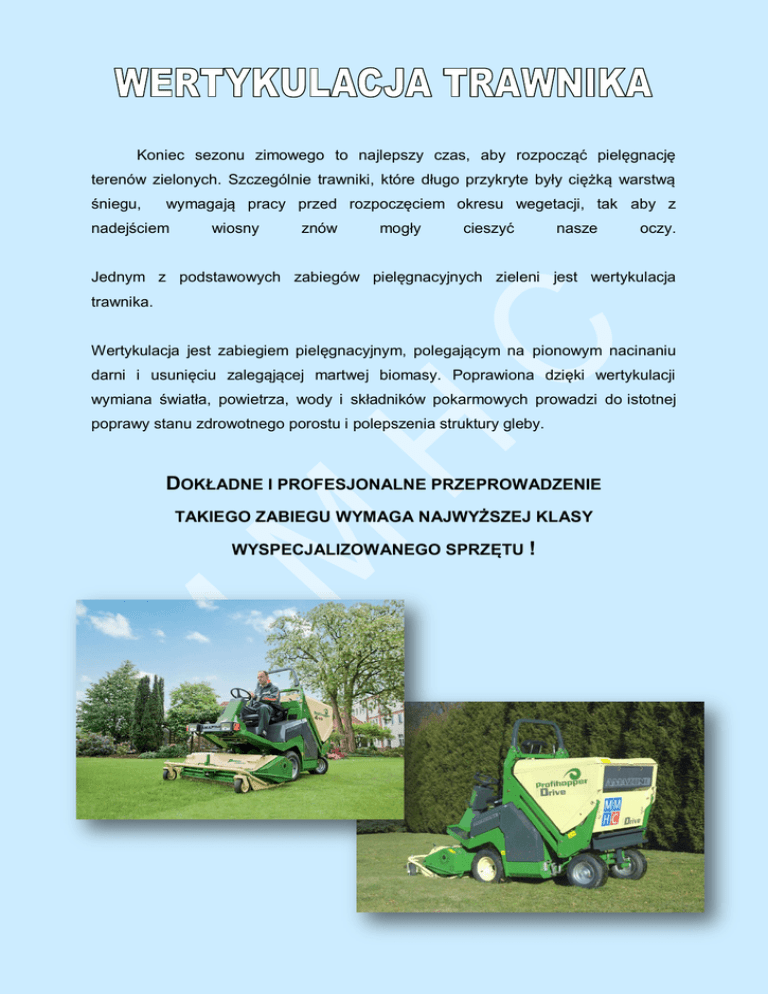 Koniec sezonu zimowego to najlepszy czas, aby rozpocząć pielęgnację terenów zielonych. Szczególnie trawniki, które długo przykryte były ciężką warstwą śniegu, wymagają pracy przed rozpoczęciem okresu wegetacji, tak aby z nadejściem wiosny znów mogły cieszyć nasze oczy. Jednym z podstawowych zabiegów pielęgnacyjnych zieleni jest wertykulacja trawnika. Wertykulacja jest zabiegiem pielęgnacyjnym, polegającym na pionowym nacinaniu darni i usunięciu zalegąjącej martwej biomasy. Poprawiona dzięki wertykulacji wymiana światła, powietrza, wody i składników pokarmowych prowadzi do istotnej poprawy stanu zdrowotnego porostu i polepszenia struktury gleby. DOKŁADNE I PROFESJONALNE PRZEPROWADZENIE TAKIEGO ZABIEGU WYMAGA NAJWYŻSZEJ KLASY WYSPECJALIZOWANEGO SPRZĘTU ! Za pomocą AMAZONE Profihopper można doskonale wertykulować darń. Noże wertykulujące tworzą szczeliny w darni trawy i prześwietlają powierzchnię trawnika. Zbierana jest sfilcowana trawa, a równocześnie powierzchnia gleby zostaje zwałowana. Połączenie noży skrzydełkowych z nożami wertykulującymi rewitalizuje trawnik, pozostawiając oczyszczoną powierzchnię darni. ZAPRASZAMY DO SKORZYSTANIA Z NASZYCH USŁUG ! M M H C Sp. z o.o. ul. Dzika 23, 43-215 Jankowice tel. 513 126 362 [email protected]