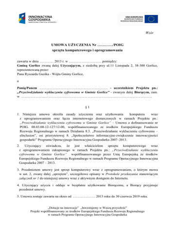 Wzór UMOWA UŻYCZENIA Nr …………/POIG sprzętu komputerowego i oprogramowania zawarta w dniu ………… 2013 r. w ………………………. pomiędzy: Gminą Gorlice zwaną dalej Użyczającym, z siedzibą przy ul.11 Listopada 2, 38-300 Gorlice, reprezentowaną przez: Pana Ryszarda Guzika - Wójta Gminy Gorlice, a Panią/Panem …………………………………………………. - uczestnikiem Projektu pn.: „Przeciwdziałanie wykluczeniu cyfrowemu w Gminie Gorlice” - zwanym dalej Biorącym, zam. w ………………...………………………………………………………………………………. §1 1. Niniejsza umowa określa zasady użyczenia oraz użytkowania komputera wraz z oprogramowaniem oraz łącza internetowego dostarczonych w ramach Projektu pn.: „Przeciwdziałanie wykluczeniu cyfrowemu w Gminie Gorlice” – Umowa o dofinansowanie nr POIG. 08.03.00-12-127/12-00, współfinansowanego ze środków Europejskiego Funduszu Rozwoju Regionalnego w ramach Działania 8.3. „Przeciwdziałanie wykluczeniu cyfrowemu – eInclusion”, osi priorytetowej 8. „Społeczeństwo informacyjne-zwiększenie innowacyjności gospodarki” Programu Operacyjnego Innowacyjna Gospodarka 2007–2013. 2. Użyczający oświadcza, że jest właścicielem sprzętu komputerowego wraz z oprogramowaniem zakupionego w ramach Projektu pn.: „Przeciwdziałanie wykluczeniu cyfrowemu w Gminie Gorlice” współfinansowanego przez Unię Europejską ze środków Europejskiego Funduszu Rozwoju Regionalnego w ramach Programu Operacyjnego Innowacyjna Gospodarka 2007 – 2013. 3. Przedmiotem umowy jest sprzęt komputerowy wraz z oprogramowaniem, o którym mowa w ust. 2, zwany dalej „sprzętem”, szczegółowo opisany w Protokole przekazania stanowiącym załącznik nr 1 do niniejszej umowy wraz z aktywnym dostępem do Internetu. 4. Użyczający użycza i oddaje w bezpłatne użytkowanie Biorącemu, a Biorący przyjmuje przedmiot umowy. 5. Umowa zostaje zawarta na okres od ………………. 2013 roku do 30 czerwca 2019 roku. „Dotacje na innowacje” „Inwestujemy w Waszą przyszłość” Projekt współfinansowany ze środków Europejskiego Funduszu Rozwoju Regionalnego w ramach Programu Operacyjnego Innowacyjna Gospodarka 6. Każda ze stron może rozwiązać umowę z zachowaniem 14-dniowego okresu wypowiedzenia. 7. Wydanie przedmiotu użyczenia nastąpi po podpisaniu niniejszej umowy na podstawie Protokołu przekazania podpisanego przez obie strony. §2 Łączna wartość użyczonego sprzętu na dzień podpisania umowy wynosi ……………zł brutto (słownie złotych: ………………………………………….. …/100). §3 1. Biorący umożliwi w budynku mieszkalnym wykonanie prac niezbędnych do doprowadzenia sieci telekomunikacyjnej do odbioru Internetu, wskaże miejsce instalacji komputera, gniazda oraz urządzenia do odbioru Internetu i nie będzie rościł pretensji z tytułu ewentualnych szkód powstałych w trakcie instalacji. 2. Biorący zobowiązuje się używać przedmiot użyczenia w sposób odpowiadający jego przeznaczeniu i właściwościom, a także zgodnie z niniejszą umową, w szczególności z warunkami użytkowania, gwarancji i opieki serwisowej. 3. Biorący nie może oddać sprzętu do używania osobie trzeciej. 4. Biorącemu nie wolno ingerować, naprawiać otrzymanego sprzętu pod rygorem rozwiązania umowy i obciążenia kosztami koniecznych napraw. 5. Zabrania się: - niezgodnego z prawem korzystania, rozpowszechniania, utrwalania, pozyskiwania i zwielokrotniania oprogramowania komputerowego, - usuwania oznaczeń (logo), symboli, naklejek (licencji), dotyczących promowania realizowanego Projektu lub identyfikujących dany komputer, - rozdzielania otrzymanego zestawu komputerowego, osobnego używania jego części, używania części zestawu z innymi elementami, nieskładającymi się na użyczony zestaw, - dalszego udostępniania sygnału internetowego poprzez stosowanie np. routerów, - użytkowania nośników danych niewiadomego pochodzenia w celu uniknięcia zainstalowania wirusa i co się z tym wiąże, utraty danych bądź uszkodzenia systemu. 6. Użyczający zapewnia serwisowanie sprzętu i oprogramowania pod koniec trwania projektu. 7. Biorący zobowiązuje się do przechowania w dobrym stanie opakowań po komputerze (kartonów, pudełek), gdyż jest to warunek skorzystania z gwarancji w momencie stwierdzenia uszkodzenia zestawu lub jego elementów. „Dotacje na innowacje” „Inwestujemy w Waszą przyszłość” Projekt współfinansowany ze środków Europejskiego Funduszu Rozwoju Regionalnego w ramach Programu Operacyjnego Innowacyjna Gospodarka §4 Biorący zobowiązuje się w szczególności do: 1) używania otrzymanego sprzętu komputerowego zgodnie z przeznaczeniem, 2) zgodnej z przeznaczeniem eksploatacji i obsługi sprzętu, 3) utrzymania otrzymanego sprzętu w należytym stanie technicznym oraz ponoszenia kosztów zwykłego używania rzeczy, 4) zabezpieczenia sprzętu przed kradzieżą, uszkodzeniem lub zniszczeniem; w przypadku zniszczenia, uszkodzenia lub zaginięcia sprzętu, z przyczyn leżących po stronie Biorącego zobowiązuje się on do pokrycia szkody w pełnej wysokości, 5) niedokonywania zmian w konfiguracji zainstalowanego fabrycznie oprogramowania, 6) informowania Użytkownika o wszelkich powstałych usterkach sprzętu, zakłóceniach w pracy komputera oraz innych defektach, mających wpływ na jego prawidłowe funkcjonowanie, 7) udostępnienia sprzętu na żądanie realizatora Projektu w celu jego serwisowania oraz sprawdzanie stanu technicznego oraz sposobu wykorzystywania sprzętu informatycznego, w tym kontroli zawartości dysku twardego, kontrolę adresów IP w uzgodnionym terminie, 8) przestrzegania zasad BHP, dotyczących obsługi sprzętu komputerowego, w tym monitora ekranowego. §5 Umowa może zostać rozwiązana ze skutkiem natychmiastowym a Użyczający może żądać natychmiastowego zwro