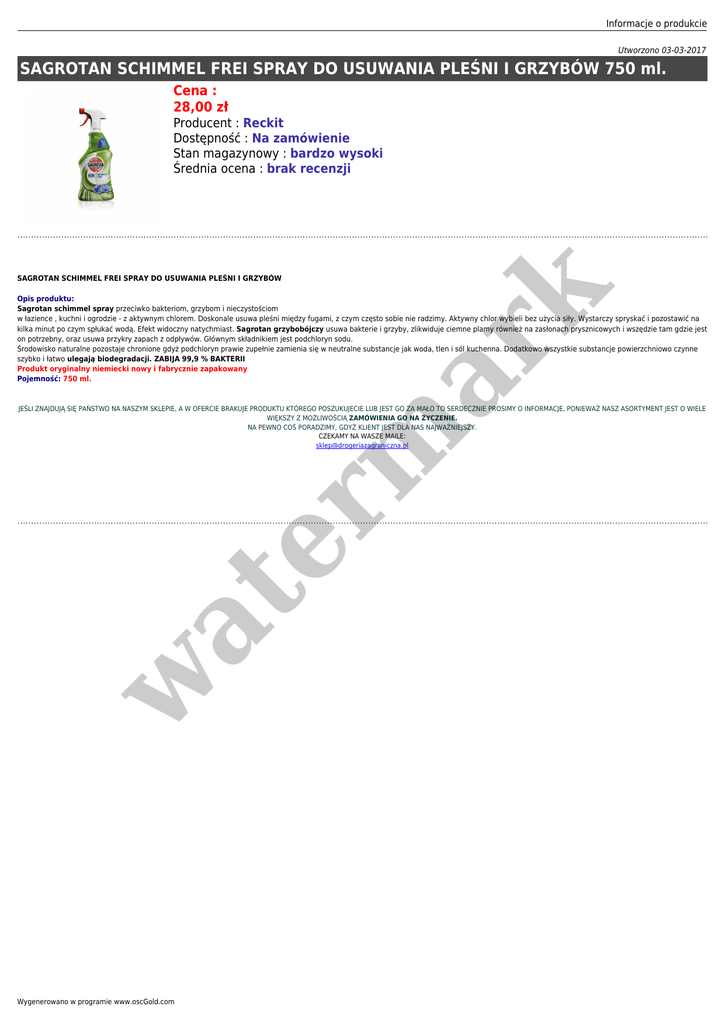 Informacje o produkcie Utworzono 03-03-2017 SAGROTAN SCHIMMEL FREI SPRAY DO USUWANIA PLEŚNI I GRZYBÓW 750 ml. Cena : 28,00 zł Producent : Reckit Dostępność : Na zamówienie Stan magazynowy : bardzo wysoki Średnia ocena : brak recenzji er m ar k SAGROTAN SCHIMMEL FREI SPRAY DO USUWANIA PLEŚNI I GRZYBÓW Opis produktu: Sagrotan schimmel spray przeciwko bakteriom, grzybom i nieczystościom w łazience , kuchni i ogrodzie - z aktywnym chlorem. Doskonale usuwa pleśni między fugami, z czym często sobie nie radzimy. Aktywny chlor wybieli bez użycia siły. Wystarczy spryskać i pozostawić na kilka minut po czym spłukać wodą. Efekt widoczny natychmiast. Sagrotan grzybobójczy usuwa bakterie i grzyby, zlikwiduje ciemne plamy również na zasłonach prysznicowych i wszędzie tam gdzie jest on potrzebny, oraz usuwa przykry zapach z odpływów. Głównym składnikiem jest podchloryn sodu. Środowisko naturalne pozostaje chronione gdyż podchloryn prawie zupełnie zamienia się w neutralne substancje jak woda, tlen i sól kuchenna. Dodatkowo wszystkie substancje powierzchniowo czynne szybko i łatwo ulegają biodegradacji. ZABIJA 99,9 % BAKTERII Produkt oryginalny niemiecki nowy i fabrycznie zapakowany Pojemność: 750 ml. w at JEŚLI ZNAJDUJĄ SIĘ PAŃSTWO NA NASZYM SKLEPIE, A W OFERCIE BRAKUJE PRODUKTU KTÓREGO POSZUKUJECIE LUB JEST GO ZA MAŁO TO SERDECZNIE PROSIMY O INFORMACJE, PONIEWAŻ NASZ ASORTYMENT JEST O WIELE WIĘKSZY Z MOŻLIWOŚCIĄ ZAMÓWIENIA GO NA ŻYCZENIE. NA PEWNO COŚ PORADZIMY, GDYŻ KLIENT JEST DLA NAS NAJWAŻNIEJSZY. CZEKAMY NA WASZE MAILE: [email protected] Wygenerowano w programie www.oscGold.com