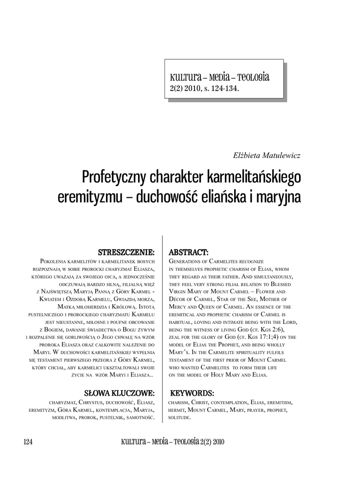 Kultura – Media – Teologia 2(2) 2010, s. 124-134. ElŜbieta Matulewicz Profetyczny charakter karmelitańskiego eremityzmu – duchowość eliańska i maryjna STRESZCZENIE: POKOLENIA KARMELITÓW I KARMELITANEK BOSYCH ROZPOZNAJĄ W SOBIE PROROCKI CHARYZMAT ELIASZA, KTÓREGO UWAśAJĄ ZA SWOJEGO OJCA, A JEDNOCZEŚNIE ODCZUWAJĄ BARDZO SILNĄ, FILIALNĄ WIĘŹ Z NAJŚWIĘTSZĄ MARYJĄ PANNĄ Z GÓRY KARMEL KWIATEM I OZDOBĄ KARMELU, GWIAZDĄ MORZA, MATKĄ MIŁOSIERDZIA I KRÓLOWĄ. ISTOTĄ PUSTELNICZEGO I PROROCKIEGO CHARYZMATU KARMELU JEST NIEUSTANNE, MIŁOSNE I POUFNE OBCOWANIE Z BOGIEM, DAWANIE ŚWIADECTWA O BOGU śYWYM I ROZPALENIE SIĘ GORLIWOŚCIĄ O JEGO CHWAŁĘ NA WZÓR PROROKA ELIASZA ORAZ CAŁKOWITE NALEśENIE DO MARYI. W DUCHOWOŚCI KARMELITAŃSKIEJ WYPEŁNIA SIĘ TESTAMENT PIERWSZEGO PRZEORA Z GÓRY KARMEL, KTÓRY CHCIAŁ, ABY KARMELICI UKSZTAŁTOWALI SWOJE śYCIE NA WZÓR MARYI I ELIASZA.. SŁOWA KLUCZOWE: CHARYZMAT, CHRYSTUS, DUCHOWOŚĆ, ELIASZ, EREMITYZM, GÓRA KARMEL, KONTEMPLACJA, MARYJA, MODLITWA, PROROK, PUSTELNIK, SAMOTNOŚĆ. 124 ABSTRACT: GENERATIONS OF CARMELITES RECOGNIZE IN THEMSELVES PROPHETIC CHARISM OF ELIAS, WHOM THEY REGARD AS THEIR FATHER. AND SIMULTANEOUSLY, THEY FEEL VERY STRONG FILIAL RELATION TO BLESSED VIRGIN MARY OF MOUNT CARMEL – FLOWER AND DÉCOR OF CARMEL, STAR OF THE SEE, MOTHER OF MERCY AND QUEEN OF CARMEL. AN ESSENCE OF THE EREMITICAL AND PROPHETIC CHARISM OF CARMEL IS HABITUAL, LOVING AND INTIMATE BEING WITH THE LORD, BEING THE WITNESS OF LIVING GOD (CF. KGS 2:6), ZEAL FOR THE GLORY OF GOD (CF. KGS 17:1;4) ON THE MODEL OF ELIAS THE PROPHET, AND BEING WHOLLY MARY’S. IN THE CARMELITE SPIRITUALITY FULFILS TESTAMENT OF THE FIRST PRIOR OF MOUNT CARMEL WHO WANTED CARMELITES TO FORM THEIR LIFE ON THE MODEL OF HOLY MARY AND ELIAS. KEYWORDS: CHARISM, CHRIST, CONTEMPLATION, ELIAS, EREMITISM, MOUNT CARMEL, MARY, PRAYER, PROPHET, SOLITUDE. HERMIT, Kultura – Media – Teologia 2(2) 2010 E. Matulewicz, Profetyczny charakter karmelitańskiego eremityzmu ... D awne dokumenty, takie jak Reguła św. Alberta oraz Ignea sagitta nie wspominają o duchowości eliańskiej i maryjnej pustelników z Góry Karmel, gdyŜ obecność Eliasza jako ich ojca duchowego i Najświętszej Maryi Panny z Góry Karmel jako ich Matki i Królowej była zupełnie oczywista w tradycji Zakonu, który powstał i rozwijał się na Górze Karmel przy źródle Eliasza. Góra Karmel była dla nich nie tylko „ogrodem” i „winnicą Pańską”, ale teŜ biblijnym i historycznym miejscem ukrycia się Eliasza oraz miejscem jego działania jako proroka, świadczącego o mocy Boga Ŝywego i wypatrującego obłoku, który wyleje na Izrael deszcz, oznaczający Ŝycie i płodność. Temat Maryi i Eliasza podjął natomiast św. Brokard, pierwszy przeor z Góry Karmel, który prosił św. Alberta o napisanie Reguły zgodnej z ich sposobem Ŝycia. Brokard, czując zbliŜającą się śmierć, przekazał karmelitom następujący testament duchowy: „Synowie! Bóg w swoim miłosierdziu powołał nas do zakonu pustelników, a z jego szczególnej łaskawości nazwani zostaliśmy Braćmi Najświętszej Dziewicy Maryi. Miejcie się więc na baczności, abyście po mojej śmierci nie przybrali sobie tego tytułu niegodnie. Dlatego teŜ trwajcie nieustannie w dobrem, brzydźcie się bogactwem, ze wzgardą odrzućcie świat, a Ŝycie swoje ukształtujcie na wzór Maryi i Eliasza”1. Wydaje się, Ŝe w tym miejscu zasadne będzie postawienie pytania: jaki jest związek między Duchem Świętym, duchem prorockim Eliasza i Maryją? Wiadomości na ten temat moŜemy znaleźć w jeszcze jednym dawnym piśmie Zakonu pt. De institutione primorum monachorum. Dokument ten, stanowiący pierwszą część większego dzieła wydanego w XIV wieku, zawiera „najstarszą Regułę” Zakonu, napisaną w oryginale po grecku prawdopodobnie w 412 roku przez patriarchę Jana Jerozolimskiego. Według autora De institutione primorum monachorum Karmelici wierzą, Ŝe obłok, którego wypatrywał Eliasz na Górze Karmel (1 Krl 18, 44) symbolizuje Maryję Niepokalaną. Zadziwia w tym dawnym tekście, którego pierwsza redakcja sięga piątego wieku, niezwykle jasno wyraŜona prawda o Niepokalanym Poczęciu Najświętszej Maryi Panny. NaleŜy dodać, Ŝe w późniejszych, średniowiecznych kontrowersjach na ten temat, karmelici zdecydowanie bronili nauczania o tym przywileju Maryi2. A oto fragment dokumentu De instututione: „Gdy sługa Eliasz zobaczył mały obłok podnoszący się nad morzem, Bóg objawił Eliaszowi, Ŝe pewne dziecko, błogosławiona Maryja, którą symbolizuje obłok, narodzi się z grzesznej natury ludzkiej, ukrytej w symbolu morza. Dziecko to, od swego poczęcia, wolne będzie od wszelkiej zmazy grzechu, tak jak obłok, który powstaje z mętnego morza, lecz wolny jest od wszelkiego brudu. […] Maryja róŜniła się w swoim poczęciu od tego morza. W Jej poczęciu nie ciąŜyła nad Nią Ŝadna zmaza grzechu, ale dzięki zachowaniu od grzechu była lekka jak obłok i czysta przez pełnię darów. Ona była obłokiem, o którym pisał MojŜesz: „I ukazała się im chwała Jahwe w obłoku” (Wj 16, 10)”3. 1 2 Breviarium Romanum OCD, pars altera, Romae 1959, s. 950, cyt. za: J. Zielinski, Maryja w Ŝyciu Karmelu, Warszawa 2002, s. 39. Zob. Secretarius Generalis pro Monialibus O.C.D. – Rome, The Virgin Mary in our Life, (Ongoing Formation, 8), s. 11. 3 De institutione primorum monachorum VI, rozdz. 1, cyt za: J. Zieliński, Maryja w Ŝyciu Karmelu, s. 53. Kultura – Media – Teologia 2(2) 2010 125 IMPLIKACJE TEOLOGICZNE Obłok jest dla karmelitów symbolem i obrazem Maryi, która wydaje na świat Zbawiciela, podobnie jak obłok, który wylewa na wyschniętą ziemię Ŝyciodajny deszcz4. Myśl ta została wyraŜona w Liturgii Godzin Zakonu Karmelitów Bosych na uroczystość Najświętszej Maryi Panny z Góry Karmel: „Gdy słońce ziemię spaliło, tęskniącą za wody zdrojem, Eliasz na G