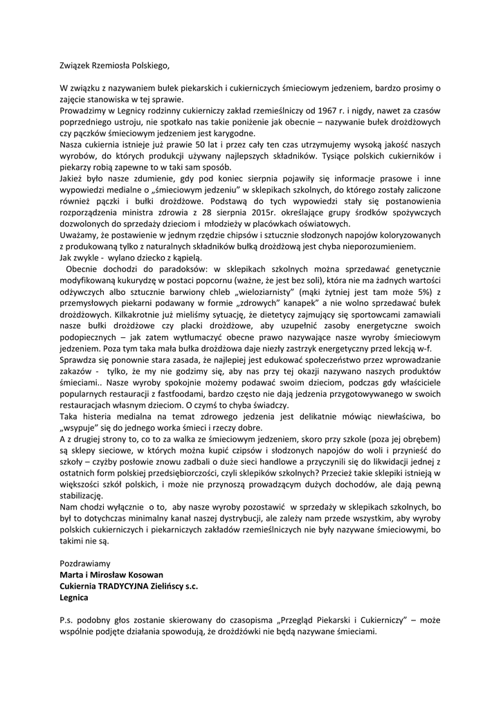Związek Rzemiosła Polskiego, W związku z nazywaniem bułek piekarskich i cukierniczych śmieciowym jedzeniem, bardzo prosimy o zajęcie stanowiska w tej sprawie. Prowadzimy w Legnicy rodzinny cukierniczy zakład rzemieślniczy od 1967 r. i nigdy, nawet za czasów poprzedniego ustroju, nie spotkało nas takie poniżenie jak obecnie – nazywanie bułek drożdżowych czy pączków śmieciowym jedzeniem jest karygodne. Nasza cukiernia istnieje już prawie 50 lat i przez cały ten czas utrzymujemy wysoką jakość naszych wyrobów, do których produkcji używany najlepszych składników. Tysiące polskich cukierników i piekarzy robią zapewne to w taki sam sposób. Jakież było nasze zdumienie, gdy pod koniec sierpnia pojawiły się informacje prasowe i inne wypowiedzi medialne o „śmieciowym jedzeniu” w sklepikach szkolnych, do którego zostały zaliczone również pączki i bułki drożdżowe. Podstawą do tych wypowiedzi stały się postanowienia rozporządzenia ministra zdrowia z 28 sierpnia 2015r. określające grupy środków spożywczych dozwolonych do sprzedaży dzieciom i młodzieży w placówkach oświatowych. Uważamy, że postawienie w jednym rzędzie chipsów i sztucznie słodzonych napojów koloryzowanych z produkowaną tylko z naturalnych składników bułką drożdżową jest chyba nieporozumieniem. Jak zwykle - wylano dziecko z kąpielą. Obecnie dochodzi do paradoksów: w sklepikach szkolnych można sprzedawać genetycznie modyfikowaną kukurydzę w postaci popcornu (ważne, że jest bez soli), która nie ma żadnych wartości odżywczych albo sztucznie barwiony chleb „wieloziarnisty” (mąki żytniej jest tam może 5%) z przemysłowych piekarni podawany w formie „zdrowych” kanapek” a nie wolno sprzedawać bułek drożdżowych. Kilkakrotnie już mieliśmy sytuację, że dietetycy zajmujący się sportowcami zamawiali nasze bułki drożdżowe czy placki drożdżowe, aby uzupełnić zasoby energetyczne swoich podopiecznych – jak zatem wytłumaczyć obecne prawo nazywające nasze wyroby śmieciowym jedzeniem. Poza tym taka mała bułka drożdżowa daje niezły zastrzyk energetyczny przed lekcją w-f. Sprawdza się ponownie stara zasada, że najlepiej jest edukować społeczeństwo przez wprowadzanie zakazów - tylko, że my nie godzimy się, aby nas przy tej okazji nazywano naszych produktów śmieciami.. Nasze wyroby spokojnie możemy podawać swoim dzieciom, podczas gdy właściciele popularnych restauracji z fastfoodami, bardzo często nie dają jedzenia przygotowywanego w swoich restauracjach własnym dzieciom. O czymś to chyba świadczy. Taka histeria medialna na temat zdrowego jedzenia jest delikatnie mówiąc niewłaściwa, bo „wsypuje” się do jednego worka śmieci i rzeczy dobre. A z drugiej strony to, co to za walka ze śmieciowym jedzeniem, skoro przy szkole (poza jej obrębem) są sklepy sieciowe, w których można kupić czipsów i słodzonych napojów do woli i przynieść do szkoły – czyżby posłowie znowu zadbali o duże sieci handlowe a przyczynili się do likwidacji jednej z ostatnich form polskiej przedsiębiorczości, czyli sklepików szkolnych? Przecież takie sklepiki istnieją w większości szkół polskich, i może nie przynoszą prowadzącym dużych dochodów, ale dają pewną stabilizację. Nam chodzi wyłącznie o to, aby nasze wyroby pozostawić w sprzedaży w sklepikach szkolnych, bo był to dotychczas minimalny kanał naszej dystrybucji, ale zależy nam przede wszystkim, aby wyroby polskich cukierniczych i piekarniczych zakładów rzemieślniczych nie były nazywane śmieciowymi, bo takimi nie są. Pozdrawiamy Marta i Mirosław Kosowan Cukiernia TRADYCYJNA Zielińscy s.c. Legnica P.s. podobny głos zostanie skierowany do czasopisma „Przegląd Piekarski i Cukierniczy” – może wspólnie podjęte działania spowodują, że drożdżówki nie będą nazywane śmieciami.