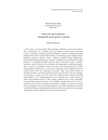 POSTSCRIPTUM POLONISTYCZNE, 2012 • 2 (10) ISSN 1898-1593 PIOTR GARNCAREK Uniwersytet Warszawski Warszawa Hans-Georg Gadamer – doświadczanie granicy języka Wprowadzenie Język obcy w rozważaniach Hansa-Georga Gadamera pojawia się wprawdzie wielokrotnie, ale z jednego, jak się wydaje, powodu. Jego obecność, a zatem i definicja, konieczne są dla dopełnienia wywodu o hermeneutycznym pojmowaniu języka w ogóle. Pojmowaniu, w myśl którego język zajmuje miejsce centralne, ponieważ określa i świat, i ludzkie możliwości jego definiowania. Język pełni funkcję spekulatywną. Taką ma strukturę. Nie odzwierciedla niczego trwale, ale wszystkiemu nadaje językową postać. Wszystko zatem „zaznaje” myślenia o sobie. Wszystko też wywołuje ruch sprawiający subiektywną spekulację w mowie. To działanie i dzianie się rzeczy pod postacią językową. Tylko tak potrafimy konstytuować to, ku czemu zwracamy swoje myślenie. Jedynym „bytem, który może być rozumiany, jest język”. Jeśli rzeczywiście tak jest, to wszystko powinno otrzymać językową postać. Nie stwarza to dla rzeczy drugiego istnienia, bo mają one swój własny byt. Poprzez język zyskują natomiast uniwersalność. „Coś przybierającego postać językową jest czymś innym niż samo wypowiedziane słowo”. Ono istnieje, ponieważ coś za jego pośrednictwem przybiera postać językową. Z tym jednak zastrzeżeniem, że owo coś nie ma danej raz na zawsze postaci pozajęzykowej i dopiero w słowie otrzymuje własne określenie. Liczy się intencja poznania. W swoim odniesieniu do świata i możliwościach jego doświadczania jesteśmy zależni od języka. Jest to percepcja ograniczona, tak jak ograniczony jest sam proces językowy. 78 POSTSCRIPTUM POLONISTYCZNE, 2012 • 2 (10) Język jest śladem skończoności nie dlatego, że istnieją rozmaite postaci budowy ludzkiego języka, lecz dlatego, że każdy język stale się kształtuje i przekształca, gdy pozwala coraz wyraźniej przemawiać swemu doświadczeniu świata. Nie dlatego jest skończony, że nie jest zarazem każdym innym językiem, lecz dlatego, że jest językiem (Gadamer 1993, 414). W naszym mówieniu pojawia się granica wypowiedzi, ale jednocześnie nie pojawia się granica możliwych sensów, znaczeń i interpretacji. To my w zasadzie przynależymy do języka, a nie on do nas. On nas określa i dekoduje w każdym zdarzeniu komunikacyjnym. Zdradza sposób naszego prywatnego, środowiskowego czy narodowego doświadczania świata. Język jest nie tylko siłą sprawczą, niezbędną dla porozumiewania się z innymi, ale i dla porozumiewania się z samym sobą. Każde rozumienie ma bowiem charakter zdarzenia językowego – „i to nawet wówczas, gdy dotyczy tego, co pozajęzykowe, czy też skupia się na ukrytym znaczeniu zapisanej litery: jest zdarzeniem językowym w rodzaju owej wewnętrznej rozmowy, którą prowadzi ze sobą dusza, a którą Platon uznał za istotę myślenia” (Gadamer 2003, 5). Jeśli przyjmiemy, że poza językiem również milczenie i „ciche rozumienie” stanowią istotę pojmowania, to język przestaje być wyłączną jego charakterystyką. Staje się nią jednak ponownie przy założeniu, że to niejako osobne języki – ale jednak języki. Gadamer używa tutaj sformułowań „milczące porozumienie” i „rozumienie bez słów”. W języku polskim inwentarz pojęć określających mowę poza mową łatwo jest powiększyć: „ciche porozumienie”, „milczenie jest złotem”, „oniemieć ze zdziwienia”, „zaniemówić z wrażenia”, „co tu gadać”, „nie strzępić sobie języka po próżnicy”, „zapomnieć języka w gębie”, „trzymać język za zębami”, „język na kłódkę”, „milczący protest”, „milczące przyzwolenie”, „Sejm Niemy”… To zupełnie tak, jakbyśmy dążyli do wniosku, że szereg rzeczy ważnych musi stać się poza językiem, dając się jednocześnie uzewnętrznić w kodzie niewerbalnym, mowie ciała, milczeniu, cichym zrozumieniu samych przez się. Być może, „nie mając sobie nic więcej do powiedzenia”, właśnie coś powiedzieliśmy. Dochodzimy w ten sposób do „milczącego porozumienia”, wspólnej orientacji i wspólnego przekonania, ukształtowanych przez wspólny język. Jeśli z różnych powodów rezygnujemy z zachowań językowych, to często zastępujemy je „około-językowymi”. W zwierciadle języka odbija się raczej wszystko to, co jest. W nim i tylko w nim pojawia się coś, czego nigdzie nie spotkamy, ponieważ tym czymś jesteśmy my (a nie tylko to, co myślimy i wiemy o sobie). W końcu język nie PIOTR GARNCAREK: Hans-Georg Gadamer – doświadczanie granicy języka 79 jest żadnym lustrem, a to, co w nim dostrzegamy, nie odzwierciedla naszego bycia oraz bycia w ogóle, lecz jest interpretacją i przeżywaniem tego, co dzieje się z nami, tak w realnych zależnościach pracy i panowania, jak i we wszystkim innym, co składa się na nasz świat (Gadamer 1993, 88) Na poziomie słowa język nie jest jeszcze językiem w pełnym rozumieniu. Poziomu słowa nie daje się bowiem traktować jak zbiorów czy inwentarzy układających się w wypowiedzenia. To jednostkowy poziom znaczenia. Pozostaje w liczbie pojedynczej i ma sens, kiedy kogoś dosięga, a nie kiedy poddaje się opisowi gramatycznemu. Jeśli więc założymy, ironizując myśl Gadamera, komentującą to, że „na początku było słowo” – to dojdziemy do wniosku, że na początku była też liczba pojedyncza. My nie stwarzamy słowa i nie wprowadzamy go w jakikolwiek sposób w użycie. Ono staje się sobą dopiero w samoistnym obiegu komunikacyjnym. Nie należy go traktować jak najmniejszej jednostki sensu. Nie jest też ani imieniem, ani nazywaniem, bo to wiedzie do „fałszywych implikacji”. Naiwnością jest sądzić, że „istnieje pierwsze słowo”, a to dlatego, że za sensem każdego słowa kryje się zawsze istniejący już system