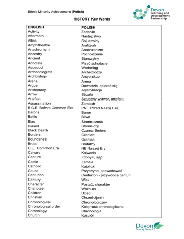 Ethnic Minority Achievement (Polish) HISTORY Key Words ENGLISH Activity Aftermath Allies Amphitheatre Anachronism Ancestry Ancient Annotate Aqueduct Archaeologists Archbishop Arena Argue Aristocracy Arrow Artefact Assassination B.C.E. Before Common Era Barons Battle Bias Biased Black Death Borders Boundaries Brutal C.E. Common Era Calvary Capture Castle Catholic Cause Centurion Century Character Charioteer Children Christian Chronological Chronological order Chronology Church POLISH Zadanie Następstwo Sojusznicy Amfiteatr Anachronizm Pochodzenie Starożytny Pisać adnotacje Wodociąg Archeolodzy Arcybiskup Arena Dowodzić, spierać się Arystokracja Strzała Sztuczny wytwór, artefakt Zamach PNE Przed Naszą Erą Baron Bitwa Stronniczość Stronniczy Czarna Śmierć Granice Granice Brutalny NE Naszej Ery Kalwaria Zdobyć, ująć Zamek Katolicki Przyczyna, spowodować Centurion - przywódca centurii Wiek Postać, charakter Woźnica Dzieci Chrześcijanin Chronologiczny Kolejność chronologiczna Chronologia Kościół 1 Ethnic Minority Achievement (Polish) HISTORY Key Words Church of England Civilised Clerks Commoners Confession Conflict Conquer Conquest Conscientious Objector Conscription Consequence Consolidate Cottagers Court martial Cruck houses Crusade Daub Democracy Deserter Discover Discuss Dissolution Emperors gladiators Empire England Evaluate Evidence Father Feud Feudal First Class France Geld Genealogy Generation Gladius (sword) Government Groma (surveyor tool) Hamlets Hanging Harrying Heir Kościół anglikański Cywilizowany Urzędnik Obywatel zwykły Spowiedź Konflikt Podbijać, zdobywać Podbój, najazd Osoba odmawiająca służby wojoskowej ze względu na swoje przekonania Służba wojoskowa Konsekwencja Łączyć, konsolidować Osoba mieszkająca w domku wiejskim Sąd wojenny Dom z drewnianymi belkami przy suficie Krucjaty Mazać Demokracja Dezerter Odkryć Omówić Rozpad Gladiatorzy Cesarza Cesarstwo, imperium Anglia Ocenić, zbadać Dowód Ojciec Wrogość Feudalne Pierwsza Klasa Francja Kastrować Genealogia Generacja Miecz legionistów rzymskich Rząd Narzędzie geodety Mała wioska Powieszenie (człowieka) Zadręczać Następca, spadkobierca 2 Ethnic Minority Achievement (Polish) HISTORY Key Words Hierarchy Historian Holocaust Holy Holy Land Husband Iceberg Identify Illustrate Imperial Inform Information Invasion Investigate Justice King Kingdom Knights Knowledge Lady Law Legacy Legion Legionnaires Liberties Loincloth Lords Medieval Merchant Middle ages Monarch Monarchs Monarchy Monastery Mother Motte and bailey Muslim Mutiny National Nobility Nobleman Oppression Origin Hierarchia Historyk Holokaust Święty Ziemia Święta Mąż Góra lodowa Zidentyfikować Ilustrować Cesarski Poinformować Informacja Inwazja Prowadzić śledztwo, dochodzenie Sprawiedliwość Król Królestwo Rycerze Wiedza Dama Prawo Dziedzictwo Legion Legionista Swobody Przepaska na biodra Lordowie Średniowieczny Kupiec Średniowiecze Monarcha Monarchowie Monarchia Klasztor Matka Gródek stożkowaty Muzłumanin Bunt Narodowy Arystokracja, szlachta Szlachcic Opresja Pochodzenie 3 Ethnic Minority Achievement (Polish) HISTORY Key Words Palace Parliament Passive Patron Patronage Peasant Pedlar Pilgrims Pilum (javelin) Plague Political Poor Pope Prejudice Presentation Primary Primary source Prince Princess Protestant Pugio (dagger) Queen Ramparts Realm Reformation Regiment Reign Religion Resistance Revolt Revolution Rich Rule Scutum (shield) Second Class Secondary Secondary source Senate Sequence Serf Sheriff Shield Shrine Pałac Parlament Pasywny Patron, mecenas Patronat Chłop Domokrążca Pielgrzymi Oszczep Dżuma, zaraza Polityczny Biedny Papież Uprzedzenie Prezentacja Podstawowy Źródła podstawowe Książe Księżniczka Protestancki Sztylet Królowa Rodzaj muru miejskiego Królestwo, sfera Reformacja Pułk Władać, panować Religia Ruch oporu Powstanie Rewolucja Bogaty Rządzenie Tarcza Druga klasa Drugorzędny Źródła Senat Sekwencja Poddany Szeryf Tarcza Świątynia 4 Ethnic Minority Achievement (Polish) HISTORY Key Words Siege Slave Slavery Soldier Source Speculate Squire Stadium Steerage Succession Tax revenue Temple Thane Throne Timeline Tithe Topographical Trade Routes Traitors Trenches Triple Alliance Triple Entente Tudor Victorian Villa Village Vulgate Wattle Western Front Wife Workhouse World War Worship Oblężenie Niewolnik Niewolnictwo Żołnierz Źródło Spekulować Giermek, sługa Stadion Sterowanie Następstwo Podatek od dochodu Świątynia Niska klasa arystokracji Tron Taśma czasu Jedna dziesiąta Topograficzny Szlaki handlowe Zdrajca Okop Trójprzymierze Trójporozumienie Tudorzy Wiktoriański Willa Wioska Wulgata Wiklina Front Zachodni Żona Fabryka gdzie biedni pracowali na utrzymanie Wojna Światowa Czcić 5