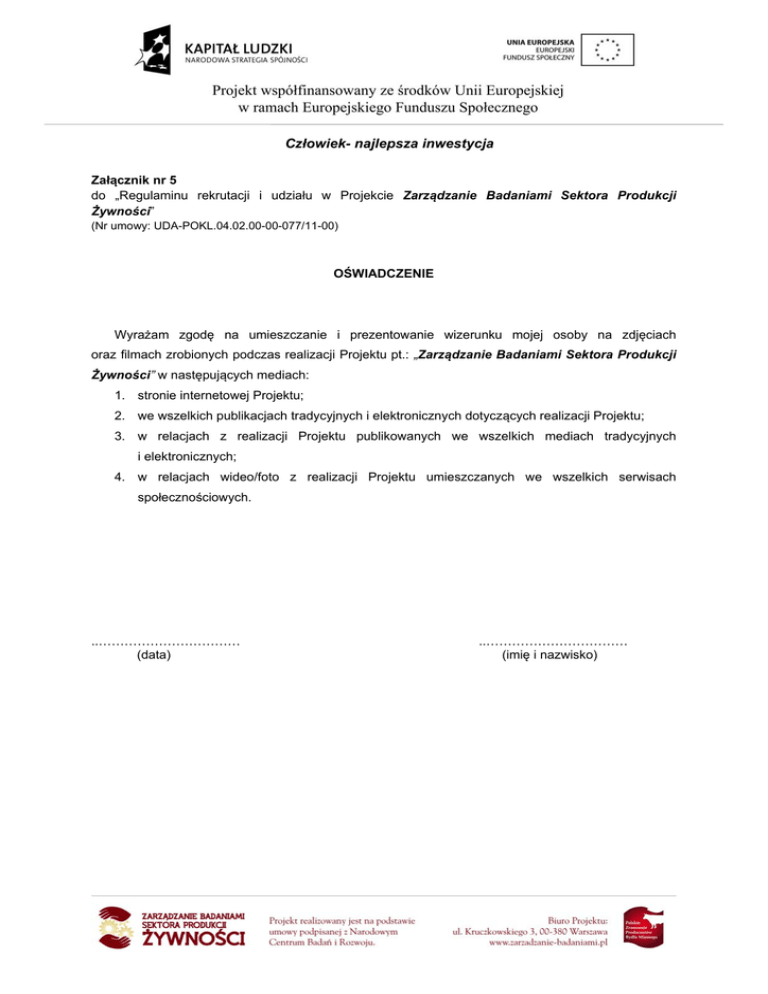 Człowiek- najlepsza inwestycja Załącznik nr 5 do „Regulaminu rekrutacji i udziału w Projekcie Zarządzanie Badaniami Sektora Produkcji Żywności” (Nr umowy: UDA-POKL.04.02.00-00-077/11-00) OŚWIADCZENIE Wyrażam zgodę na umieszczanie i prezentowanie wizerunku mojej osoby na zdjęciach oraz filmach zrobionych podczas realizacji Projektu pt.: „Zarządzanie Badaniami Sektora Produkcji Żywności” w następujących mediach: 1. stronie internetowej Projektu; 2. we wszelkich publikacjach tradycyjnych i elektronicznych dotyczących realizacji Projektu; 3. w relacjach z realizacji Projektu publikowanych we wszelkich mediach tradycyjnych i elektronicznych; 4. w relacjach wideo/foto z realizacji Projektu umieszczanych we wszelkich serwisach społecznościowych. ..…………………………… (data) ..…………………………… (imię i nazwisko)