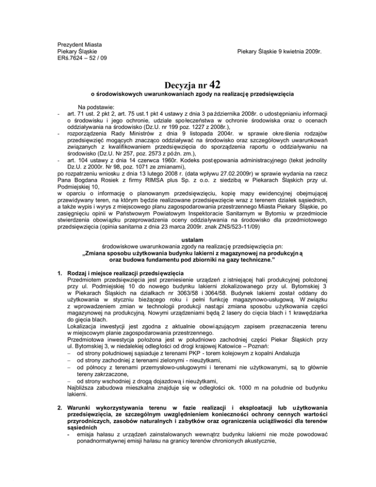 Prezydent Miasta Piekary Śląskie ERś.7624 – 52 / 09 Piekary Śląskie 9 kwietnia 2009r. Decyzja nr 42 o środowiskowych uwarunkowaniach zgody na realizacj ę przedsięwzięcia Na podstawie: art. 71 ust. 2 pkt 2, art. 75 ust.1 pkt 4 ustawy z dnia 3 pa ździernika 2008r. o udostępnianiu informacji o środowisku i jego ochronie, udziale spo łeczeństwa w ochronie środowiska oraz o ocenach oddziaływania na środowisko (Dz.U. nr 199 poz. 1227 z 2008r.), - rozporządzenia Rady Ministrów z dnia 9 listopada 2004r. w sprawie okre ślenia rodzajów przedsięwzięć mogących znacząco oddziaływać na środowisko oraz szczegółowych uwarunkowań związanych z kwalifikowaniem przedsięwzięcia do sporządzenia raportu o oddziaływaniu na środowisko (Dz.U. Nr 257, poz. 2573 z późn. zm.), - art. 104 ustawy z dnia 14 czerwca 1960r. Kodeks post ępowania administracyjnego (tekst jednolity Dz.U. z 2000r. Nr 98, poz. 1071 ze zmianami), po rozpatrzeniu wniosku z dnia 13 lutego 2008 r. (data wpływu 27.02.2009r) w sprawie wydania na rzecz Pana Bogdana Rosiek z firmy RIMSA plus Sp. z o.o. z siedzibą w Piekarach Śląskich przy ul. Podmiejskiej 10, w oparciu o informację o planowanym przedsięwzięciu, kopię mapy ewidencyjnej obejmującej przewidywany teren, na którym będzie realizowane przedsięwzięcie wraz z terenem działek sąsiednich, a także wypis i wyrys z miejscowego planu zagospodarowania przestrzennego Miasta Piekary Śląskie, po zasięgnięciu opinii w Państwowym Powiatowym Inspektoracie Sanitarnym w Bytomiu w przedmiocie stwierdzenia obowiązku przeprowadzenia oceny oddzia ływania na środowisko dla przedmiotowego przedsięwzięcia (opinia sanitarna z dnia 23 marca 2009r. znak ZNS/523-11/09) - ustalam środowiskowe uwarunkowania zgody na realizacj ę przedsięwzięcia pn: „Zmiana sposobu użytkowania budynku lakierni z magazynowej na produkcyjn ą oraz budowa fundamentu pod zbiorniki na gazy techniczne.” 1. Rodzaj i miejsce realizacji przedsięwzięcia Przedmiotem przedsięwzięcia jest przeniesienie urządzeń z istniejącej hali produkcyjnej położonej przy ul. Podmiejskiej 10 do nowego budynku lakierni zlokalizowanego przy ul. Bytomskiej 3 w Piekarach Śląskich na działkach nr 3063/58 i 3064/58. Budynek lakierni został oddany do użytkowania w styczniu bieżącego roku i pełni funkcję magazynowo-usługową. W związku z wprowadzeniem zmian w technologii produkcji nast ąpi zmiana sposobu użytkowania części magazynowej na produkcyjną. Nowymi urządzeniami będą 2 lasery do cięcia blach i 1 krawędziarka do gięcia blach. Lokalizacja inwestycji jest zgodna z aktualnie obowi ązującym zapisem przeznaczenia terenu w miejscowym planie zagospodarowania przestrzennego. Przedmiotowa inwestycja położona jest w południowo zachodniej części Piekar Śląskich przy ul. Bytomskiej 3, w niedalekiej odleg łości od drogi krajowej Katowice – Poznań: − od strony południowej sąsiaduje z terenami PKP - torem kolejowym z kopalni Andaluzja − od strony zachodniej z terenami zielonymi - nieużytkami, − od północy z terenami przemysłowo-usługowymi i terenami nie użytkowanymi, są to głównie tereny zakrzaczone, − od strony wschodniej z drogą dojazdową i nieużytkami, Najbliższa zabudowa mieszkalna znajduje się w odległości ok. 1000 m na południe od budynku lakierni. 2. Warunki wykorzystywania terenu w fazie realizacji i eksploatacji lub u żytkowania przedsięwzięcia, ze szczególnym uwzgl ędnieniem konieczności ochrony cennych wartości przyrodniczych, zasobów naturalnych i zabytków oraz ograniczenia uciążliwości dla terenów sąsiednich - emisja hałasu z urządzeń zainstalowanych wewnątrz budynku lakierni nie może powodować ponadnormatywnej emisji hałasu na granicy terenów chronionych akustycznie, - emisja zanieczyszczeń do powietrza z budynku lakierni nie może przekraczać wskaźników emisji do powietrza na granicy dzia łki, powstające odpady magazynować w sposób selektywny w przystosowanych do danego rodzaju odpadu pojemnikach, w wyznaczonych do tego i opisanych miejscach, wytworzone odpady przekazywać odbiorcom odpadów posiadaj ącym zezwolenia na prowadzenie działalności w zakresie transportu i zbierania, a tak że odzysku lub unieszkodliwiania poszczególnych rodzajów odpadów, 3. Wymagania dotyczące ochrony środowiska konieczne do uwzględnienia w projekcie budowlanym - wykonanie szczelnych nawierzchni pod miejsca magazynowe zlokalizowane na zewn ątrz budynku lakierni, 4. Wymogi w zakresie przeciwdziałania skutkom awarii przemysłowych, w odniesieniu do przedsięwzięć zaliczanych do zakładów stwarzających zagrożenie wystąpienia poważnych awarii: - przedmiotowe przedsięwzięcie nie należy do przedsięwzięć stwarzających zagrożenie wystąpienia poważnej awarii przemysłowej. 5. Wymogi w zakresie ograniczenia transgranicznego oddzia ływania na środowisko w odniesieniu do tych przedsięwzięć, dla których przeprowadzono postępowanie w sprawie transgranicznego oddziaływania na środowisko: - z uwagi na rodzaj przedsi ęwzięcia, lokalizację, ustalenia miejscowego planu zagospodarowania przestrzennego oraz zakres i zasięg możliwych oddziaływań na środowisko, przedsięwzięcie to nie będzie źródłem transgranicznego oddziaływania na środowisko. 6. Przedsięwzięcie nie wymaga przeprowadzenia monitoringu oddzia ływania na środowisko zarówno na etapie realizacji, jak i w fazie eksploatacji. 7. Przedsięwzięcie zgodne jest z obowiązującym aktualnie miejscowym planem zagospodarowania przestrzennego miasta Piekary Śląskie. 8. Decyzję należy realizować zgodnie z obowiązującymi normami projektowymi biorąc pod uwagę możliwości techniczne i obowiązujące przepisy. 9. Charakterystyka całego przedsięwzięcia stanowi załącznik do niniejszej decyzji. Uzasadnienie Do Urzędu Miasta Piekary Śląskie w dniu 27 lutego 2009r. wpłynął wniosek Pana Bogdana Rosiek z firmy RIMSA 
