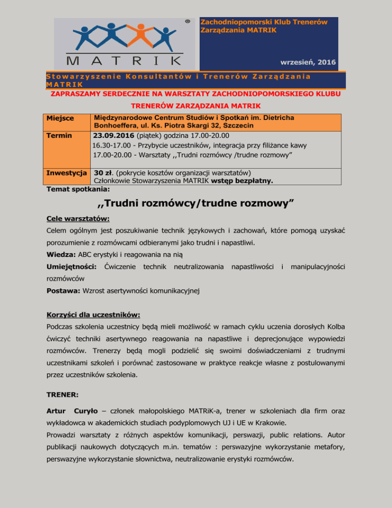 Zachodniopomorski Klub Trenerów Zarządzania MATRIK wrzesień, 2016 Stowarzyszenie Konsultantów i Trenerów Zarządzania MATRIK ZAPRASZAMY SERDECZNIE NA WARSZTATY ZACHODNIOPOMORSKIEGO KLUBU TRENERÓW ZARZĄDZANIA MATRIK Miejsce Międzynarodowe Centrum Studiów i Spotkań im. Dietricha Bonhoeffera, ul. Ks. Piotra Skargi 32, Szczecin Termin 23.09.2016 (piątek) godzina 17.00-20.00 16.30-17.00 - Przybycie uczestników, integracja przy filiżance kawy 17.00-20.00 - Warsztaty ,,Trudni rozmówcy /trudne rozmowy” ” Inwestycja 30 zł. (pokrycie kosztów organizacji warsztatów) Członkowie Stowarzyszenia MATRIK wstęp bezpłatny. Temat spotkania: ,,Trudni rozmówcy/trudne rozmowy” Cele warsztatów: Celem ogólnym jest poszukiwanie technik językowych i zachowań, które pomogą uzyskać porozumienie z rozmówcami odbieranymi jako trudni i napastliwi. Wiedza: ABC erystyki i reagowania na nią Umiejętności: Ćwiczenie technik neutralizowania napastliwości i manipulacyjności rozmówców Postawa: Wzrost asertywności komunikacyjnej Korzyści dla uczestników: Podczas szkolenia uczestnicy będą mieli możliwość w ramach cyklu uczenia dorosłych Kolba ćwiczyć techniki asertywnego reagowania na napastliwe i deprecjonujące wypowiedzi rozmówców. Trenerzy będą mogli podzielić się swoimi doświadczeniami z trudnymi uczestnikami szkoleń i porównać zastosowane w praktyce reakcje własne z postulowanymi przez uczestników szkolenia. TRENER: Artur Curyło – członek małopolskiego MATRiK-a, trener w szkoleniach dla firm oraz wykładowca w akademickich studiach podyplomowych UJ i UE w Krakowie. Prowadzi warsztaty z różnych aspektów komunikacji, perswazji, public relations. Autor publikacji naukowych dotyczących m.in. tematów : perswazyjne wykorzystanie metafory, perswazyjne wykorzystanie słownictwa, neutralizowanie erystyki rozmówców. Zgłoszenie i rejestracja: Rejestracja odbywa się w formie elektronicznej: https://competit.pl/w/1610/ wystarczy wybrać opcje zgłoś się i dokonać przelewu, który jest jednocześnie potwierdzeniem udziału w spotkaniu. Zapraszamy serdecznie KAROLINA ZBLEWSKA – Koordynator Zachodniopomorskiego Klubu Trenerów MATRIK MAGDALENA KOWALSKA - Współkoordynator Pomyśl, kto jeszcze może być zainteresowany udziałem w tym spotkaniu. Prześlij tym osobom to zaproszenie ;)