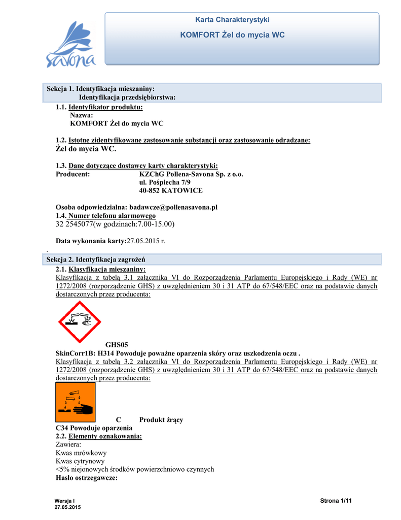 Karta Charakterystyki KOMFORT Żel do mycia WC Sekcja 1. Identyfikacja mieszaniny: Identyfikacja przedsiębiorstwa: 1.1. Identyfikator produktu: Nazwa: KOMFORT Żel do mycia WC 1.2. Istotne zidentyfikowane zastosowanie substancji oraz zastosowanie odradzane: Żel do mycia WC. 1.3. Dane dotyczące dostawcy karty charakterystyki: Producent: KZChG Pollena-Savona Sp. z o.o. ul. Pośpiecha 7/9 40-852 KATOWICE Osoba odpowiedzialna: [email protected] 1.4. Numer telefonu alarmowego 32 2545077(w godzinach:7.00-15.00) Data wykonania karty:27.05.2015 r. . Sekcja 2. Identyfikacja zagrożeń 2.1. Klasyfikacja mieszaniny: Klasyfikacja z tabelą 3.1 załącznika VI do Rozporządzenia Parlamentu Europejskiego i Rady (WE) nr 1272/2008 (rozporządzenie GHS) z uwzględnieniem 30 i 31 ATP do 67/548/EEC oraz na podstawie danych dostarczonych przez producenta: GHS05 SkinCorr1B: H314 Powoduje poważne oparzenia skóry oraz uszkodzenia oczu . Klasyfikacja z tabelą 3.2 załącznika VI do Rozporządzenia Parlamentu Europejskiego i Rady (WE) nr 1272/2008 (rozporządzenie GHS) z uwzględnieniem 30 i 31 ATP do 67/548/EEC oraz na podstawie danych dostarczonych przez producenta: C Produkt żrący C34 Powoduje oparzenia 2.2. Elementy oznakowania: Zawiera: Kwas mrówkowy Kwas cytrynowy <5% niejonowych środków powierzchniowo czynnych Hasło ostrzegawcze: Wersja I 27.05.2015 Strona 1/11 Karta Charakterystyki KOMFORT Żel do mycia WC Niebezpieczeństwo Piktogramy GHS: GHS05 Zwroty wskazujące rodzaj zagrożenia: H314 Powoduje poważne oparzenia skóry oraz uszkodzenia oczu . Zwroty wskazujące środki ostrożności: P101 W razie konieczności zasięgnięcia porady lekarza należy pokazać pojemnik lub etykietę. P102 Chronić przed dziećmi. P103 Przed użyciem przeczytać etykietę. P260 Nie wdychać par/rozpylonej cieczy. P264 Dokładnie umyć ręce po użyciu. P280 Stosować rękawice ochronne/odzież ochronną/ochronę oczu/ochronę twarzy. P301 + P330 + P331 W PRZYPADKU POŁKNIĘCIA: Wypłukać usta. NIE wywoływać wymiotów. P303 + P361 + P353 W PRZYPADKU KONTATKU ZE SKÓRĄ (lub z włosami): Natychmiast zdjąć całą zanieczyszczoną odzież. Spłukać skórę pod strumieniem wody/prysznicem. P304 + P340 W PRZYPADKU DOSTANIA SIĘ DO DRÓG ODDECHOWYCH: Wyprowadzić lub wynieść poszkodowanego na świeże powietrze i zapewnić mu warunki do swobodnego oddychania. P305+P351+P338 W PRZYPADKU DOSTANIA SIĘ DO OCZU: Ostrożnie płukać wodą przez kilka minut. Wyjąć soczewki kontaktowe, jeżeli są i można je łatwo usunąć. Nadal płukać. P310 Natychmiast skontaktować się z OŚRODKIEM ZATRUĆ/lekarzem. P363 Wyprać zanieczyszczoną odzież przed ponownym użyciem. P405 Przechowywać pod zamknięciem. P501 Pojemnik i jego zawartość utylizować zgodnie z przepisami lokalnymi, regionalnymi, krajowymi lub międzynarodowymi 2.3. Inne zagrożenia: UN: 3265 Brak informacji dot. spełniania kryteriów PBT lub vPvB zgodnie z zał. XIII rozporządzenia 1907/2006 (REACH).Badania nie zostały przeprowadzone. Sekcja 3. Skład/informacja o składnikach 3.1. Substancje: Nie dotyczy. 3.2. Mieszaniny: Klasyfikację substancji zawartych w produkcie podano zgodnie z tabelą 3.1 oraz 3.2 załącznika VI do Rozporządzenia Parlamentu Europejskiego i Rady (WE) nr 1272/2008 (rozporządzenie CLP) z uwzględnieniem 30 i 31 ATP do 67/548/EEC oraz na podstawie danych dostarczonych przez producenta. Wersja I 27.05.2015 Strona 2/11 Karta Charakterystyki KOMFORT Żel do mycia WC Nazwa niebezpiecznej substancji Kwas amidosulfonowy Nr Rej. REACH: 01-2119488633-28 Zakres stężeń Numer CAS Numer indeksowy Numer WE Symbole niebezpieczeństwa Xi: R36/38 R52/53 <5% 5329-14-6 016-026-00 226-218-8 GHS07; Uwaga SkinIrrit2: H315 EyeIrrit2: H319 AquaticChronic3: H412 Xi:R36/38 Kwas cytrynowy <2% 5949-29-1 brak 201-069-1 GHS07 Uwaga SkinIrrit2: H315 EyeIrrit2: H319 C: R35 Kwas mrówkowy Nr Rej. REACH: 01-211949491174-37 Alkohole, C12-14, etoksylowane <2 % 64-18-6 607-001-00-0 200-579-1 GHS05 Niebezpieczeństwo SkinCorr1A: H314 Xn: R22 Xi: R41 <1% 68439-50-9 brak 500-213-3 GHS05; GHS07 Niebezpieczeństwo EyeDam1: H318 AcuteTox4: H302 Brzmienie użytych zwrotów – patrz p. 16. Sekcja 4. Środki pierwszej pomocy 4.1. Opis środków pierwszej pomocy: 4.1.1 Wytyczne dotyczące pierwszej pomocy wg istotnych dróg narażenia: Kartę Charakterystyki okazać lekarzowi udzielającemu pomocy. W przypadku narażenia na pary i aerozole produktu osobę poszkodowaną przenieść do dobrze wentylowanego pomieszczenia zwrócić się o pomoc lekarską a) drogi oddechowe: osobę poszkodowaną natychmiast przenieść do dobrze wentylowanego pomieszczenia; osobę poszkodowaną umieścić w pozycji półleżącej, rozluźnić ubranie, upewnić się czy w ustach osoby poszkodowanej nie zalegają przedmioty lub wydzielina utrudniające oddychanie; jęli Wersja I 27.05.2015 Strona 3/11 Karta Charakterystyki KOMFORT Żel do mycia WC poszkodowany nie oddycha – wykonać sztuczne oddychanie; niezwłocznie zwrócić się o pomoc lekarską w przypadku wystąpienia trudności z oddychaniem. b) skóra: zdjąć zanieczyszczone ubranie; zabrudzoną skórę przemyć dużą ilością wody z mydłem; do mycia skóry nie używać żadnych rozpuszczalników ani rozcieńczalników; niezwłocznie skonsultować z lekarzem. c) oczy: zanieczyszczone oczy płukać, przy otwartych powiekach, ciągłym strumieniem bieżącej wody przez 10 ÷ 15 minut; unikać silnego strumienia wody, który może stworzyć ryzyko uszkodzenia rogówki; w przypadku utrzymującego się pieczenia lub podrażnienia skonsultować się z lekarzem; nie używać żadnych płynów do przemywania oczu ani żadnych maści przed konsultacją lekarską; w przypadku, gdy osoba poszkodowana nosi szkła kontaktowe zdjąć je, jeżeli to możliwe; niezwłocznie zwrócić się o pomoc lekarską d) przewód pokarmowy: wypłukać usta dużą ilością bieżącej wody; osobie nieprzytomnej nie podawać nic do ust ; nie wywoływ
