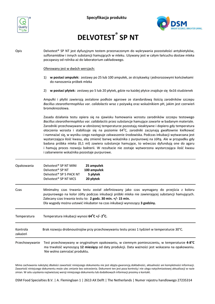 Specyfikacja produktu DELVOTEST® SP NT Opis Delvotest® SP NT jest dyfuzyjnym testem przeznaczonym do wykrywania pozostałości antybiotyków, sulfonamidów i innych substancji hamujących w mleku. Używany jest w całym łańcuchu dostaw mleka począwszy od rolnika aż do laboratorium zakładowego. do Oferowany jest w dwóch wersjach: 1) w postaci ampułek: zestawy po 25 lub 100 ampułek, ze strzykawką i jednorazowymi końcówkami do nanoszenia próbek mleka 2) w postaci płytek: zestawy po 5 lub 20 płytek, gdzie na każdej płytce znajduje się 6x16 studzienek Ampułki i płytki zawierają zestalone podłoże agarowe ze standardową ilością zarodników szczepu Bacillus stearothermophilus var. calidolactis wraz z pożywką oraz wskaźnikiem pH, jakim jest czerwień bromokrezolowa. Zasada działania testu opiera się na zjawisku hamowania wzrostu zarodników szczepu testowego Bacillus stearothermophilus var. calidolactis przez substancje hamujące zawarte w badanym materiale. Zarodniki przechowywane w obniżonej temperaturze pozostają nieaktywne i dopiero gdy temperatura o otoczenia wzrasta i stabilizuje się na poziomie 64 C, zarodniki zaczynają gwałtownie kiełkować i namnażać się, w wyniku czego następuje zakwaszenie środowiska. Podczas inkubacji wytwarzana jest wystarczająca ilość kwasu, aby zmienić barwę wskaźnika z purpurowej na żółtą. Ale w przypadku gdy badana próbka mleka (0,1 ml) zawiera substancje hamujące, to wówczas dyfundują one do agaru i hamują proces rozwoju bakterii. W rezultacie nie zostaje wytworzona wystarczająca ilość kwasu i zabarwienie wskaźnika pozostaje purpurowe. Opakowania Delvotest® SP NT MINI Delvotest® SP NT Delvotest® SP 5 PACK NT Delvotest® SP NT MCS Czas Minimalny czas trwania testu został zdefiniowany jako czas wymagany do przejścia z koloru purpurowego na kolor żółty podczas inkubacji próbki mleka nie zawierającej substancji hamujących. Zalecany czas trwania testu to: 2 godz. 30 min. +/- 15 min. Dla wygody można ustawić inkubator na czas inkubacji wynoszący 3 godziny. Temperatura Temperatura inkubacji wynosi 64 C +/- 2 C. Kontrola zakażeń Brak rozwoju drobnoustrojów przy przechowywaniu testu przez 1 tydzień w temperaturze 30°C. Przechowywanie 25 ampułek 100 ampułek 5 płytek 20 płytek o o Test przechowywany w oryginalnym opakowaniu, w ciemnym pomieszczeniu, w temperaturze 4-8°C ma trwałość wynoszącą 12 miesięcy od daty produkcji. Data ważności jest wskazana na opakowaniu. Nie wolno zamrażać produktu. Mimo zachowania należytej dbałości zawartość niniejszego dokumentu nie jest objęta gwarancją dokładności, aktualności ani kompletności informacji. Zawartość niniejszego dokumentu może ulec zmianie bez ostrzeżenia. Dokument ten jest poza kontrolą i nie ulega natychmiastowej aktualizacji w razie zmian. W celu uzyskania najświeższej wersji niniejszego dokumentu lub dodatkowych informacji prosimy o kontakt. DSM Food Specialties B.V. | A. Fleminglaan 1 | 2613 AX Delft | The Netherlands | Numer rejestru handlowego 27235314